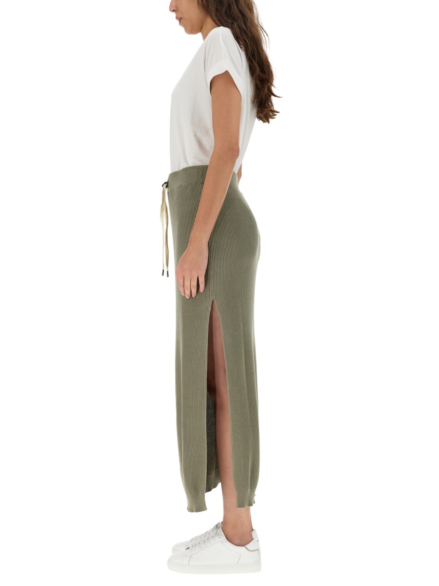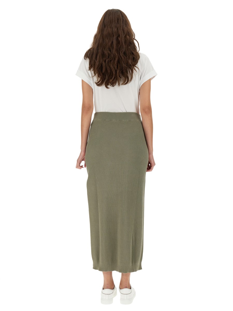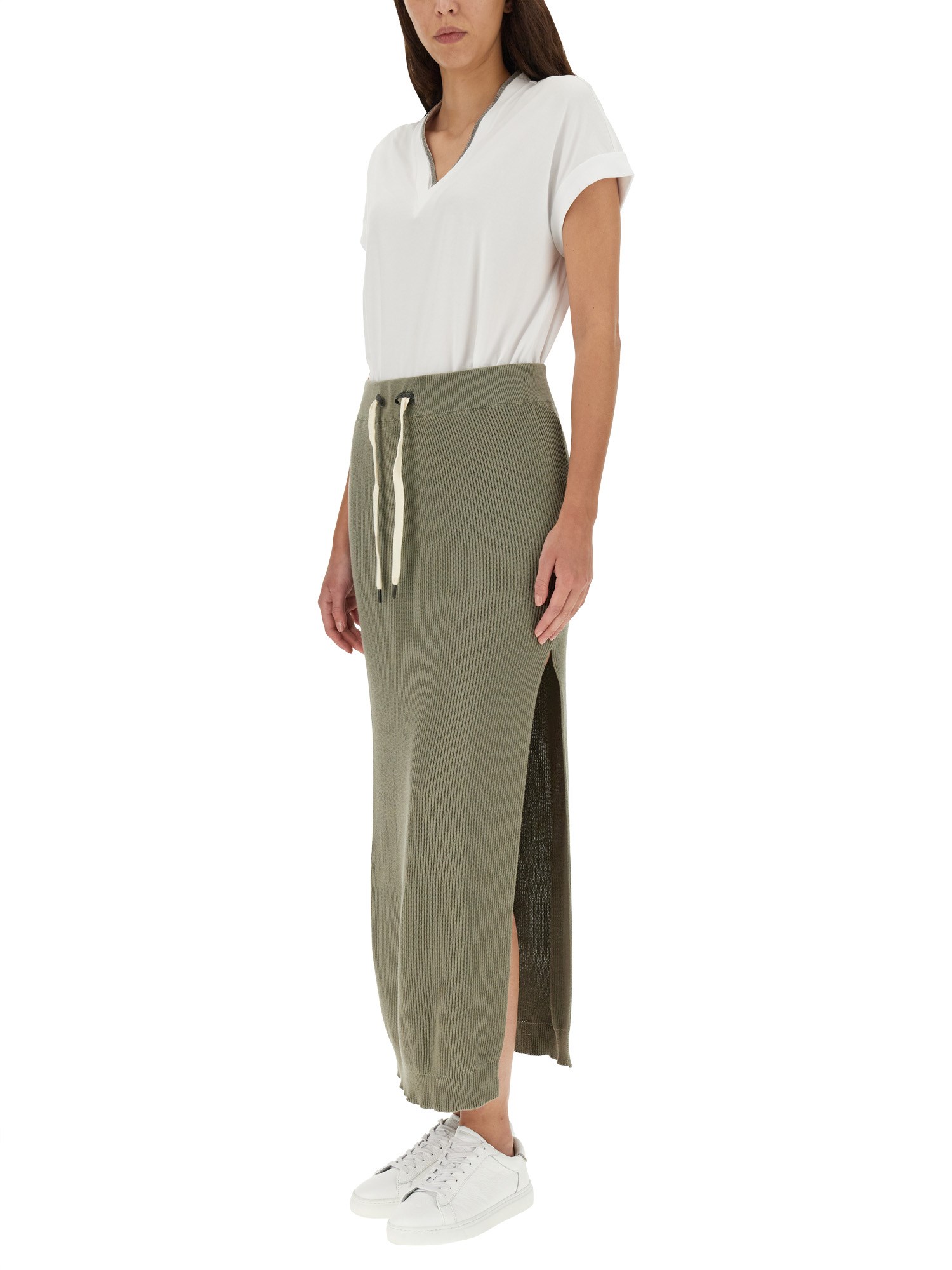 Questa gonna lunga verde oliva di Brunello Cucinelli presenta uno spacco laterale e un elastico in vita. È perfetta per ogni occasione! Questa gonna lunga verde oliva è realizzata in un materiale di cotone leggero e confortevole, ideale per l'estate. L'elastico in vita consente una vestibilità comoda e lo spacco laterale permette di ottenere un look elegante ma traspirante.
