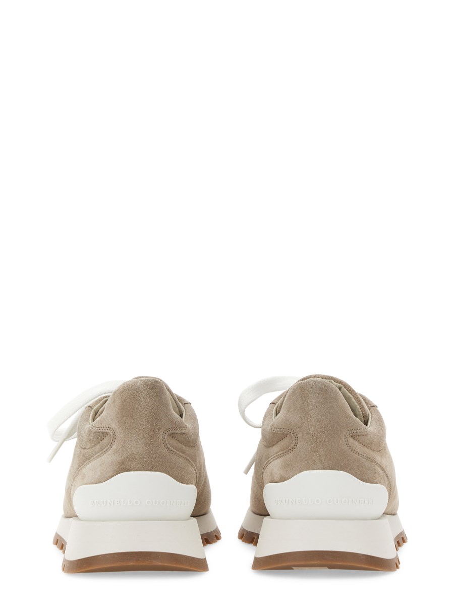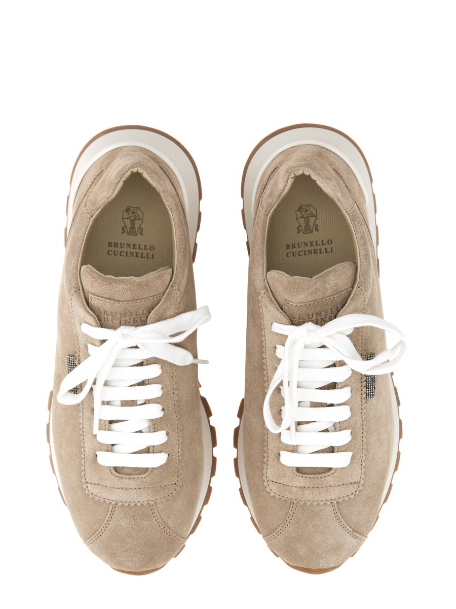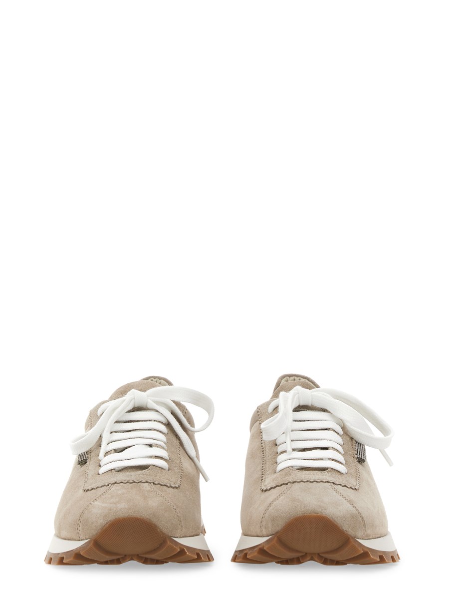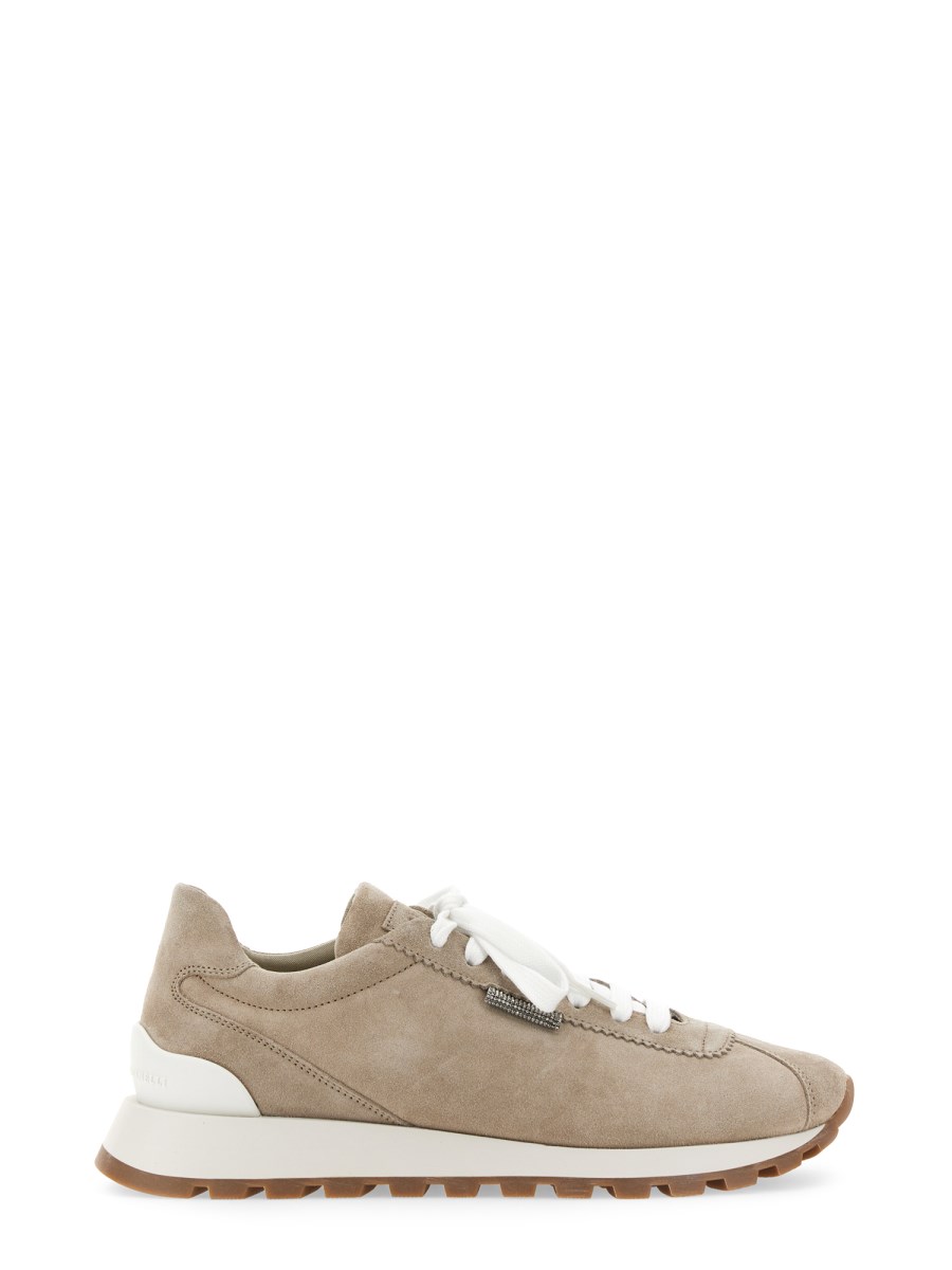 Materiali raffinati e dettagli iconici caratterizzano queste nuove sneakers in pelle scamosciata. La loro texture vellutata esalta il colore della stagione che contrasta con i lacci e la targhetta in monili lucidi, abbellimento iconico delle collezioni Brunello Cucinelli. La fodera in tessuto misto cotone e la suola in gomma conferiscono alla calzata un ulteriore comfort.