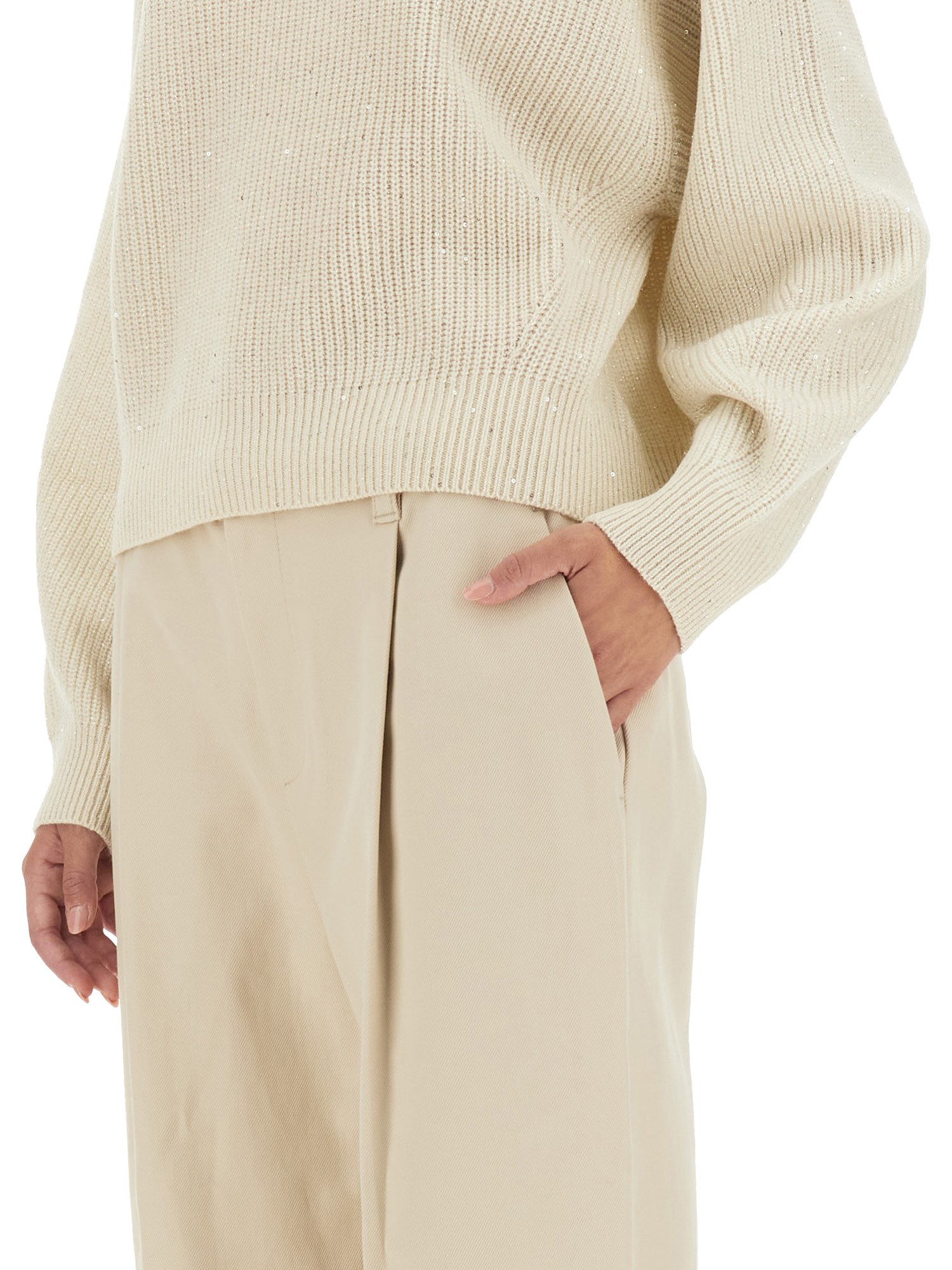 Sperimentate un lusso senza pari con il maglione in cashmere di Brunello Cucinelli, sapientemente realizzato per offrire calore e raffinatezza. Questo pezzo squisito è caratterizzato da una texture morbida e leggera che si drappeggia elegantemente, rendendolo un'aggiunta versatile a qualsiasi guardaroba. La meticolosa attenzione ai dettagli e il design raffinato riflettono l'impegno del marchio per la qualità, assicurando che questo maglione non solo esalti il vostro stile ma offra anche un comfort duraturo. Ideale sia per le occasioni casual che per quelle formali, incarna un'eleganza senza tempo ed è un must-have per gli appassionati di moda più esigenti.