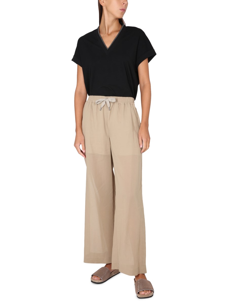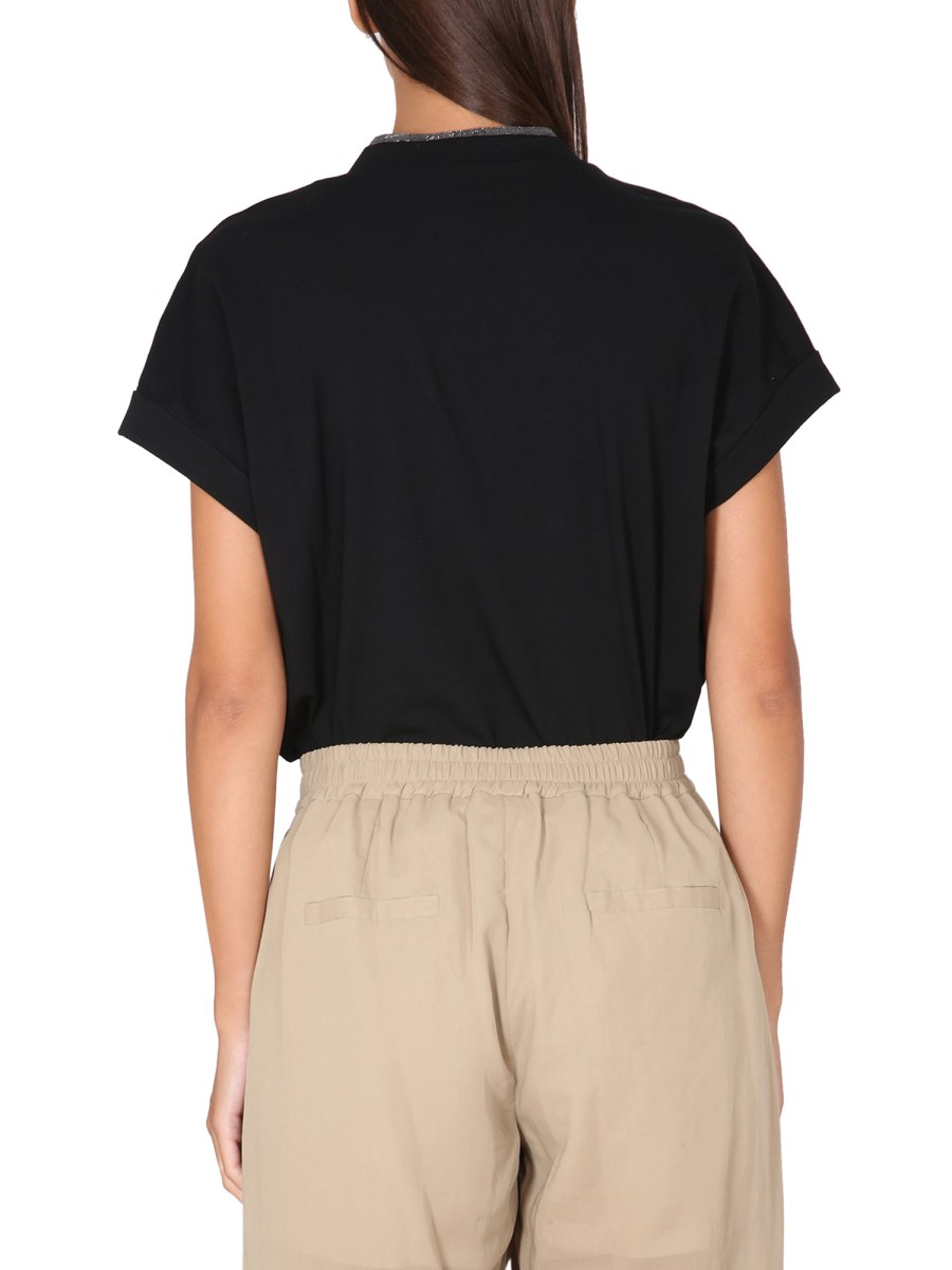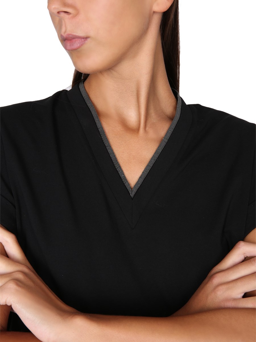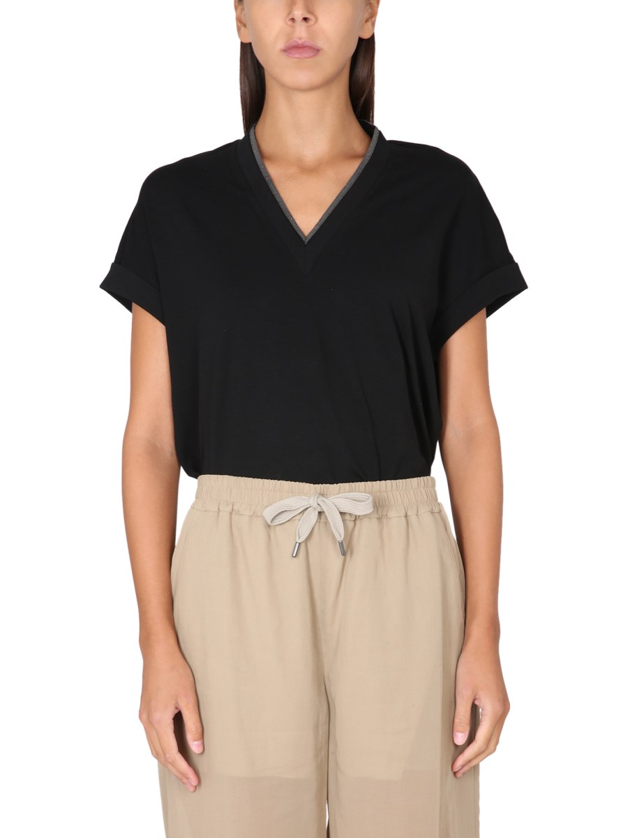 Una T-shirt di Brunello Cucinelli, essenziale per il guardaroba di ogni donna, è un must-have per ogni armadio. Questa T-shirt ha un taglio femminile e lusinghiero. È realizzata in misto cotone/poliestere per un tessuto facile da indossare. Il dettaglio gioiello con scollo a V sulla scollatura è perfetto per l'ufficio o per una serata fuori.