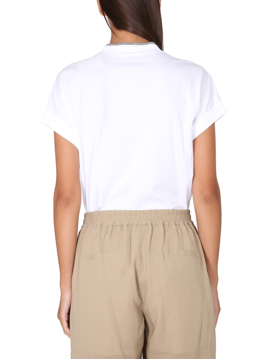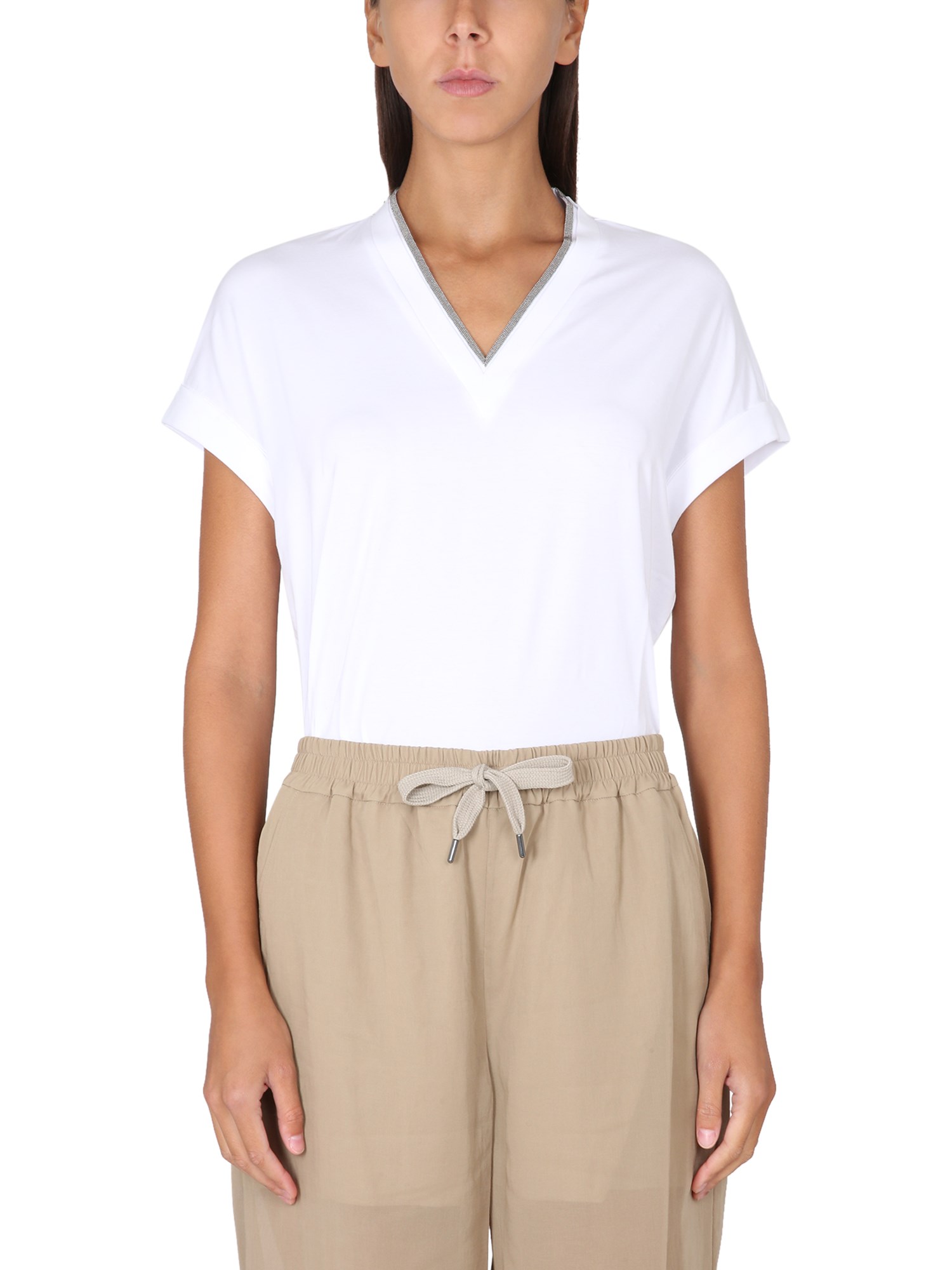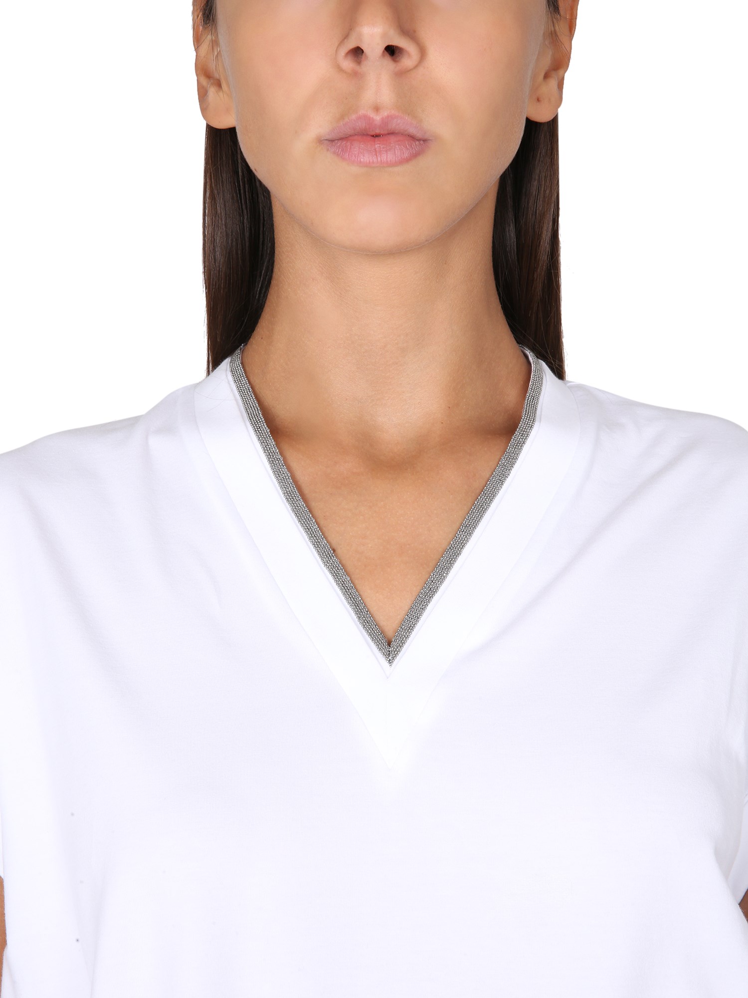 Una T-shirt Brunello Cucinelli è una necessità per il guardaroba di ogni donna e dovrebbe essere presente in ogni armadio. Questa maglietta è stata confezionata su misura per una vestibilità femminile e lusinghiera. È realizzata in una combinazione di cotone e poliestere per un tessuto confortevole. Per una serata fuori o per l'ufficio, l'abbellimento gioiello con scollo a V è l'ideale.