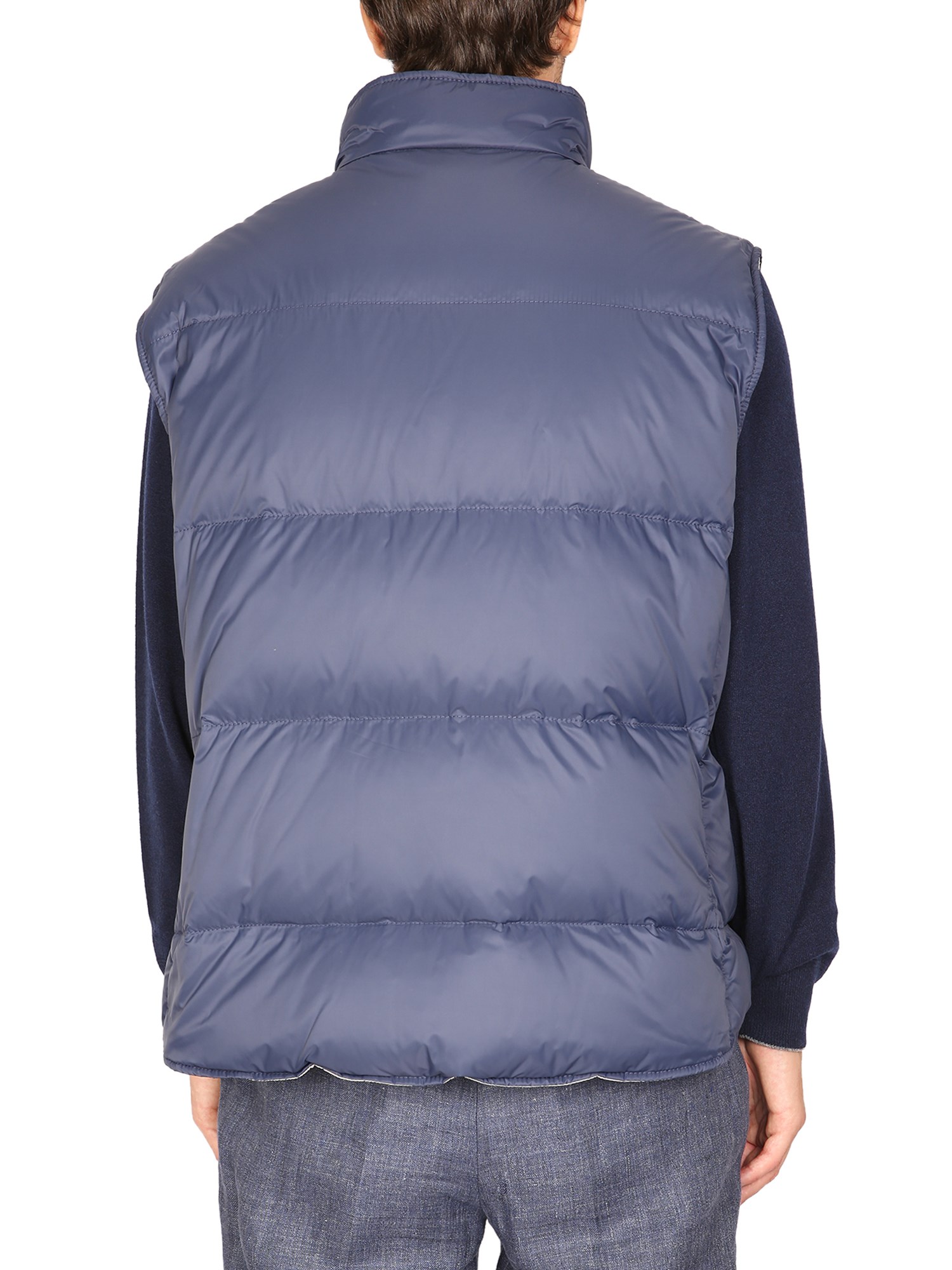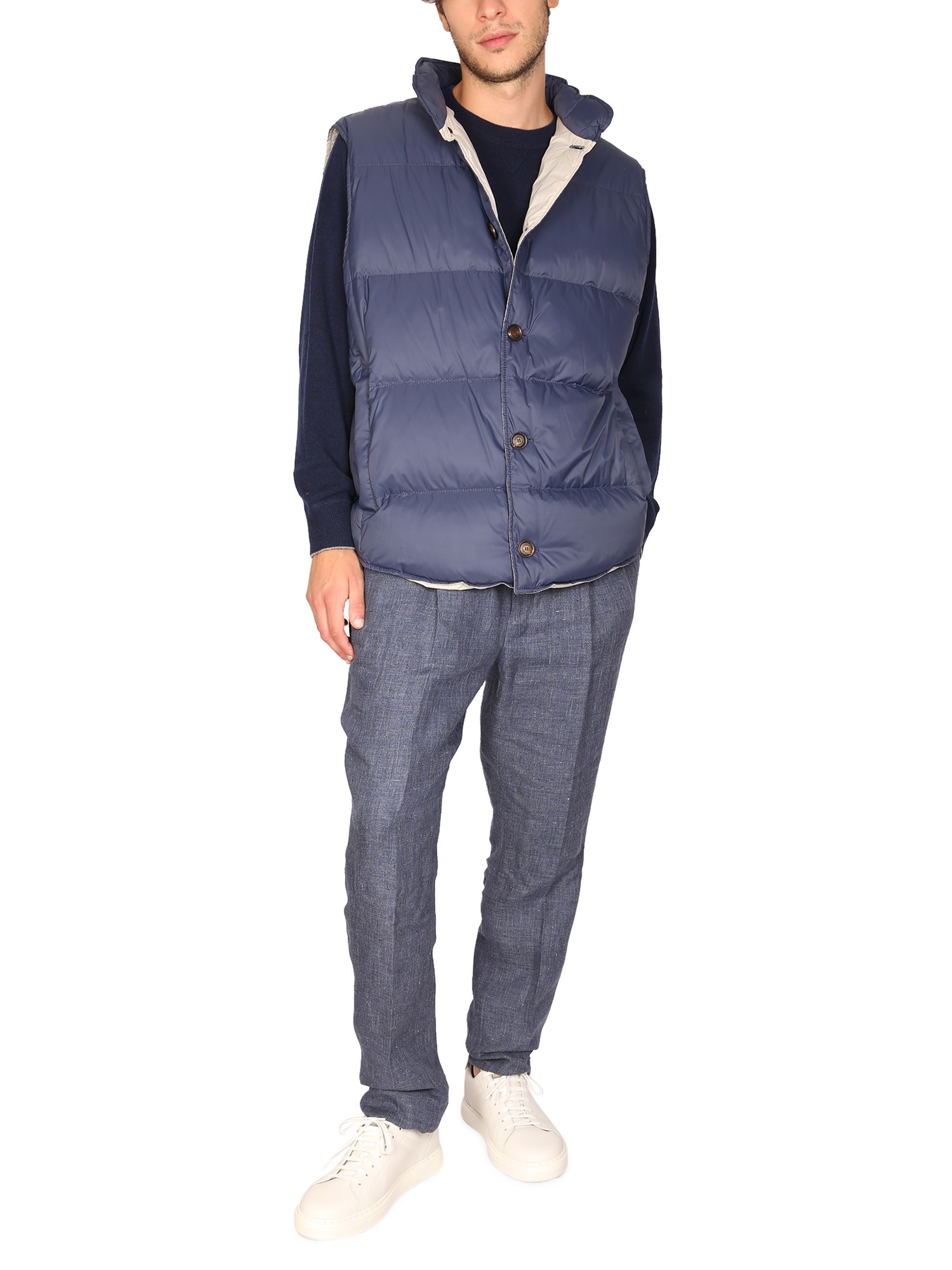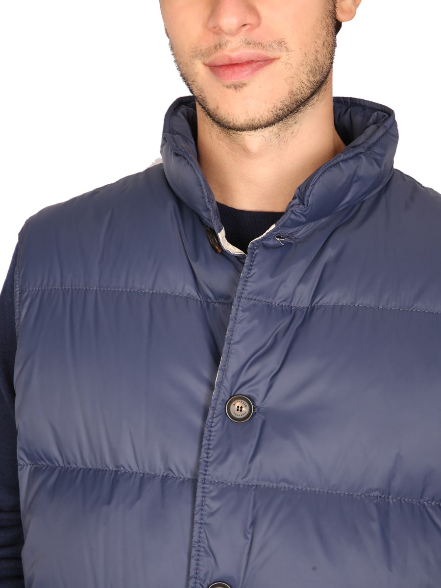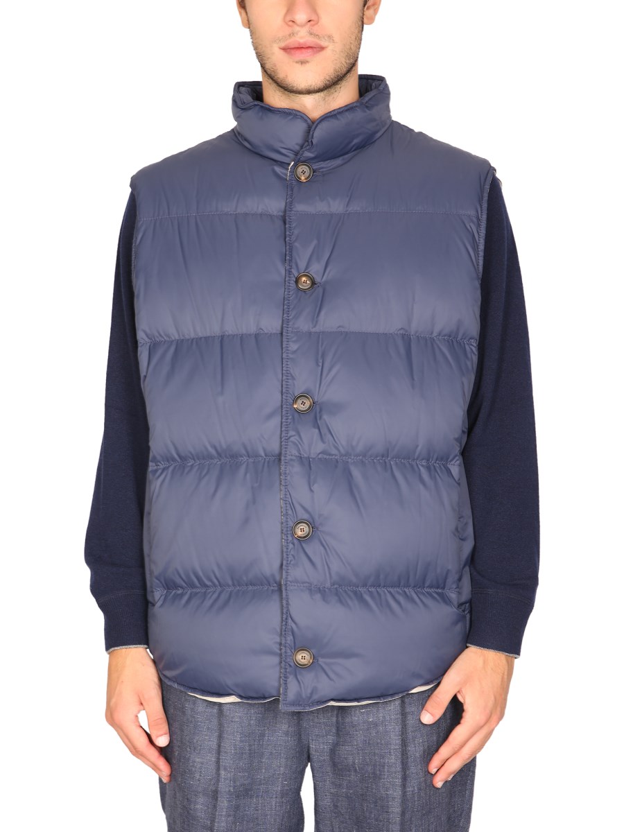 Il piumino senza maniche in nylon della maison Brunello Cucinelli è un piumino leggero e alla moda per le giornate fresche. La giacca presenta una scollatura alta, due tasche laterali con bottoni a pressione, due tasche interne con portapenne e una chiusura con bottoni sul davanti.