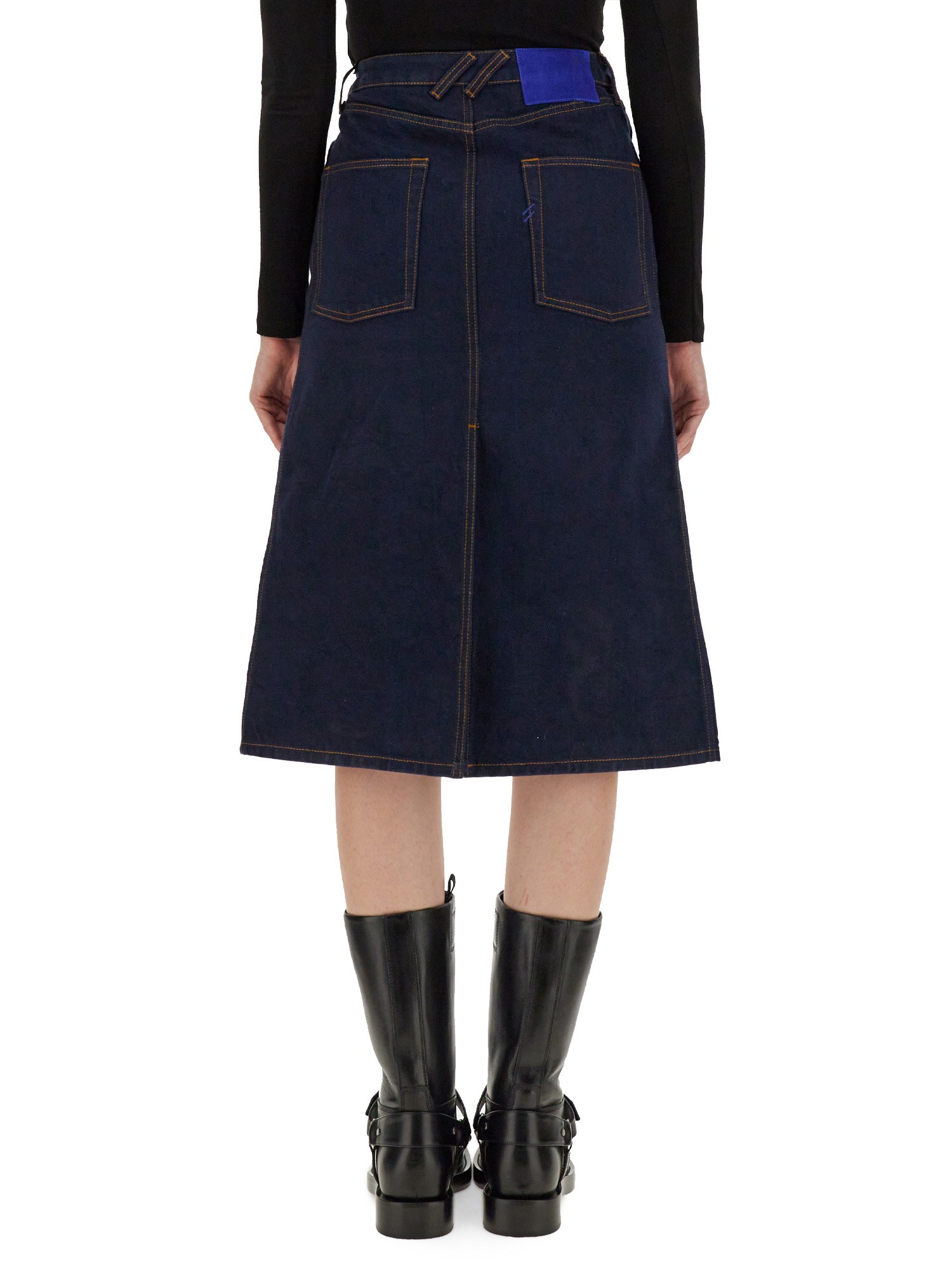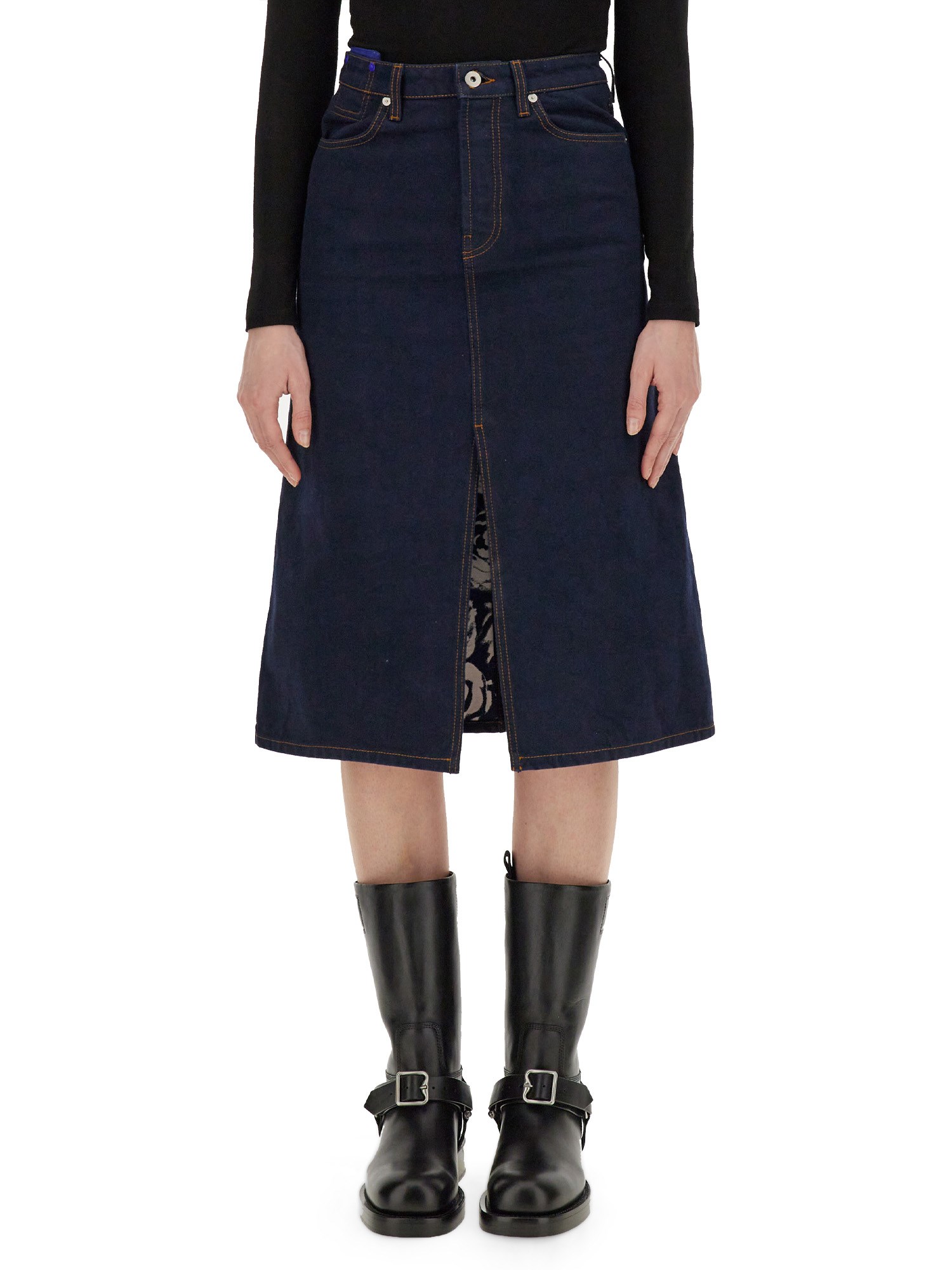Abbracciate il fascino senza tempo del denim con questa gonna Burberry. La vita alta e i passanti per la cintura conferiscono una forma perfetta, mentre la chiusura con zip e bottoni assicura una vestibilità comoda. Lo spacco frontale aggiunge un tocco di estro a questo capo classico, rendendolo un must-have per ogni guardaroba alla moda.