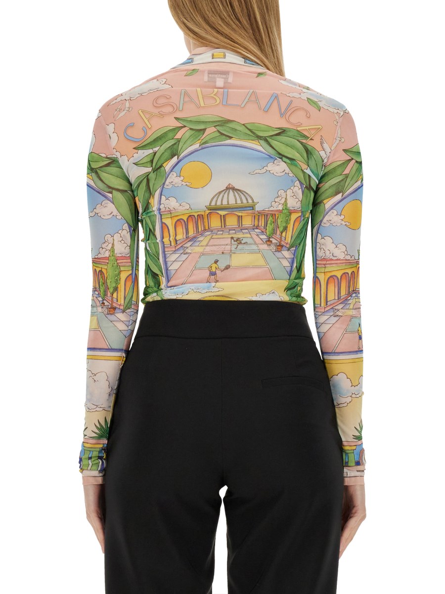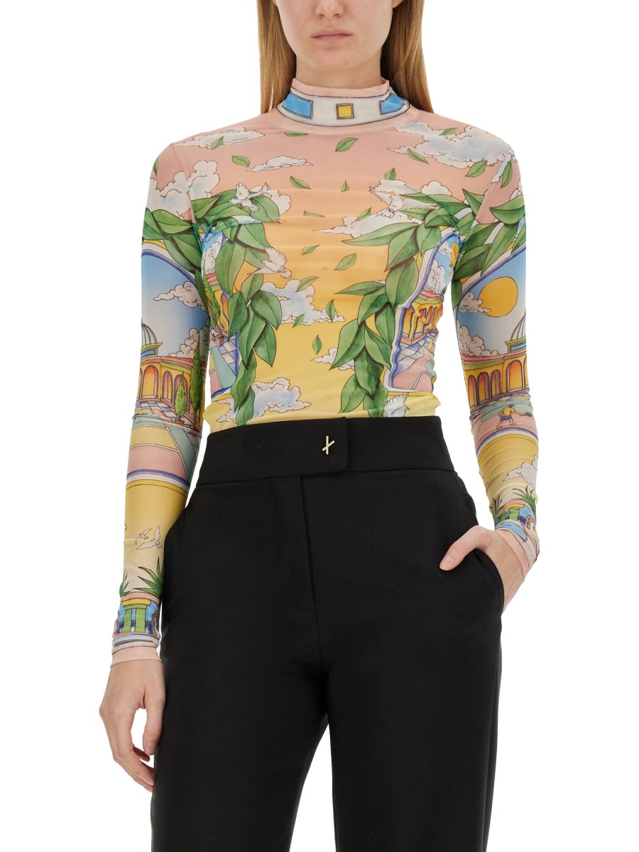 Il top stampato Casablanca è un esempio di armoniosa fusione tra design contemporaneo ed estetica vivace, che lo rende un'aggiunta versatile a qualsiasi guardaroba. Realizzato con materiali di alta qualità, questo top presenta una stampa accattivante che riflette l'impegno del marchio verso l'espressione artistica e l'ispirazione culturale. La sua vestibilità sartoriale garantisce il comfort mantenendo una silhouette elegante, adatta sia alle uscite casual che alle occasioni più formali. Gli elementi di design unici e l'attenzione ai dettagli fanno di questo capo una scelta di spicco per chi vuole elevare il proprio stile.