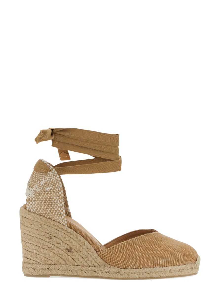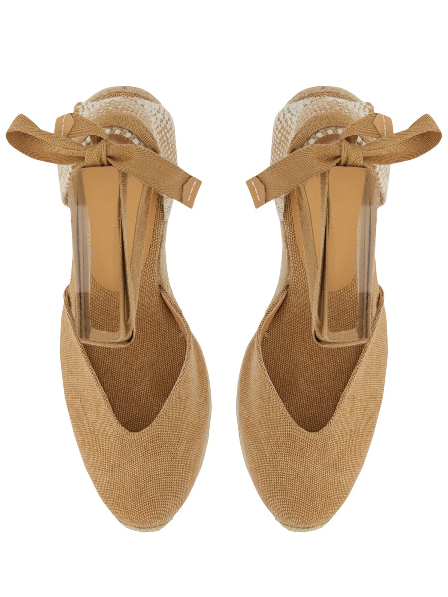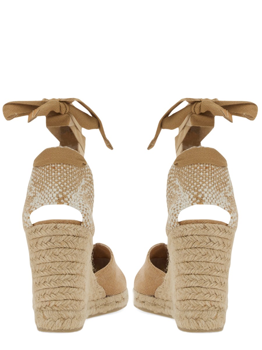 Dai pantaloncini agli abiti da sole e tutto ciò che sta in mezzo, portate il casual al livello successivo con le espadrillas in tela di cotone trasparente di Castaner. Questi sandali alla moda hanno un taglio a V e una tomaia in tela di cotone. Hanno una suola in cuerolite per un'usura confortevole e tagli laterali. I sandali hanno una zeppa di 9 cm rivestita in iuta. La fascia posteriore in tessuto è decorata con nastri per aggiungere stile.