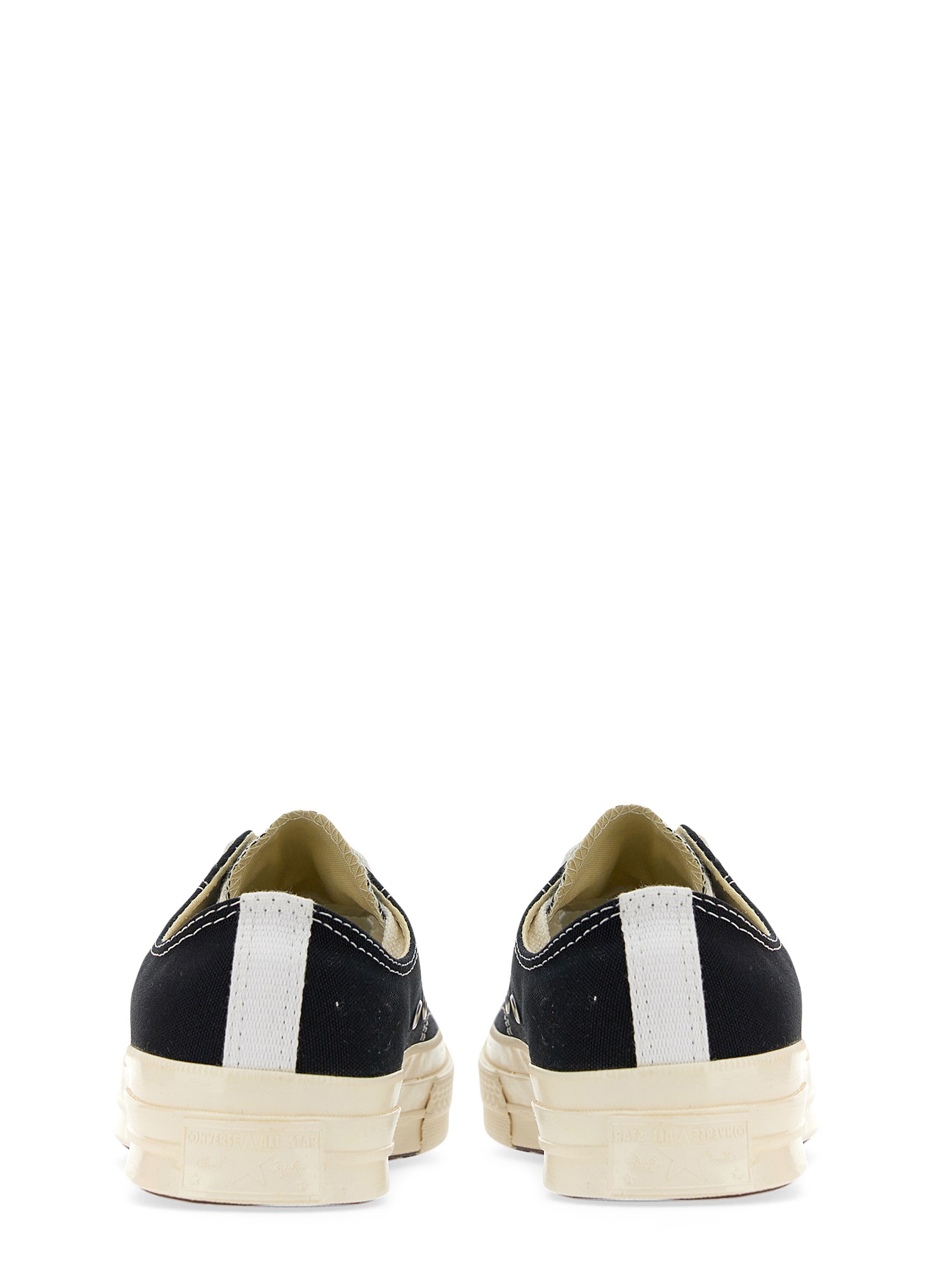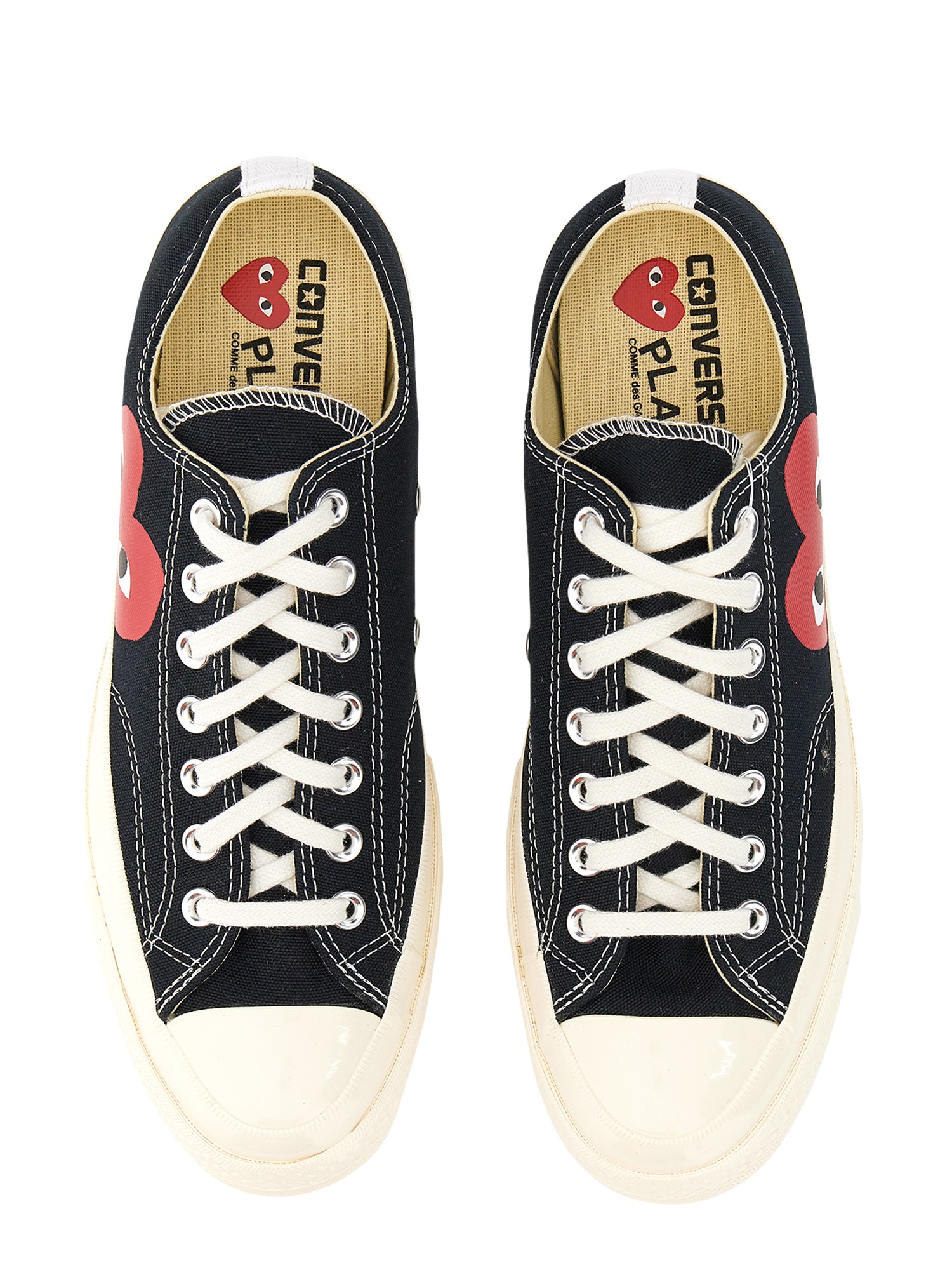 Le sneakers in cotone di Comme Des Garcons Play Converse sono comode, eleganti e resistenti. Sono perfette per essere indossate tutti i giorni, soprattutto quando si cerca qualcosa di leggero e facile da indossare. Queste sneakers nere hanno una suola in gomma e un corpo in tela di cotone. Hanno una chiusura a lacci con stampa laterale a cuore e una soletta e punta in gomma.