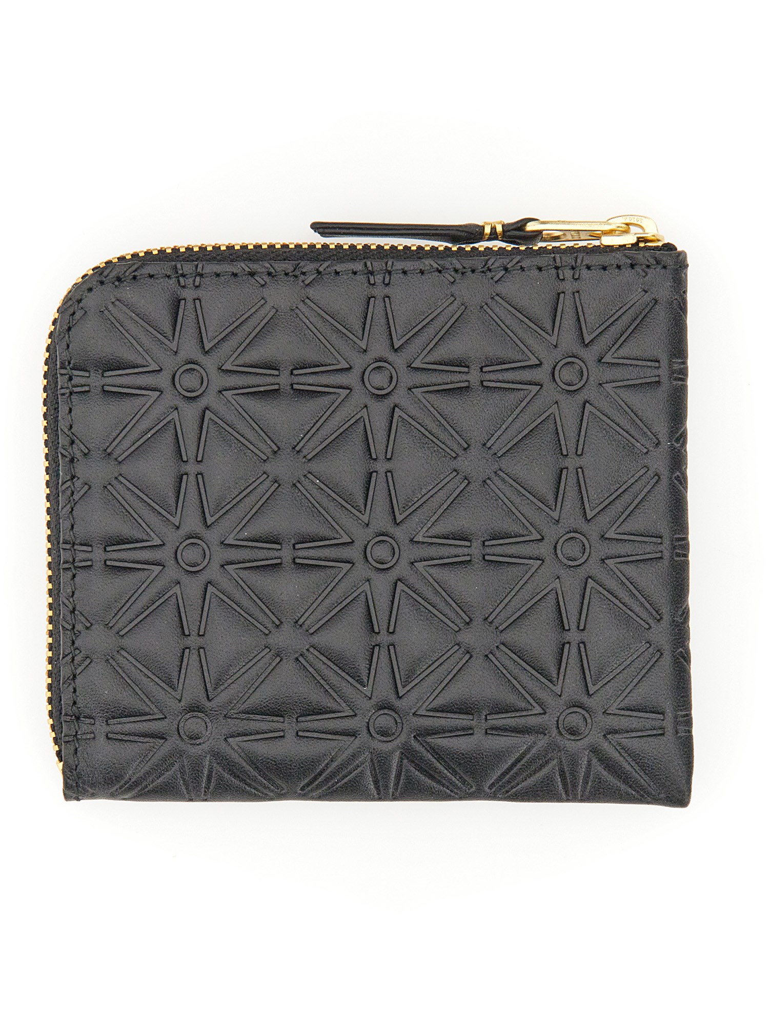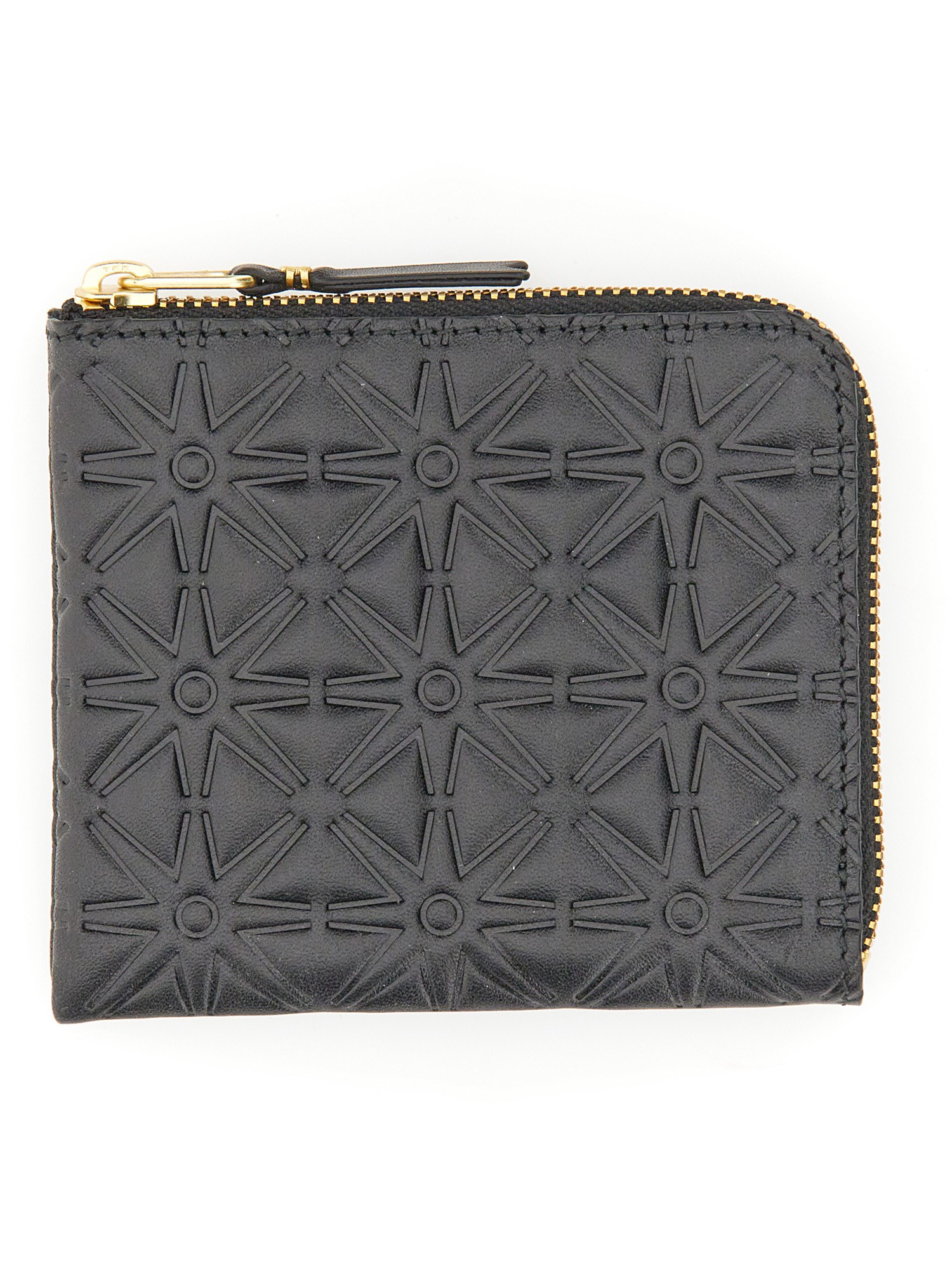 Questo portafoglio elegante e di alta qualità di Comme Des Garcons Wallet presenta un lussuoso design in rilievo sul pannello anteriore e posteriore, con una chiusura a zip pensata per essere indossata al polso. Il portafoglio è dotato di più scomparti per carte e di una tasca per banconote.