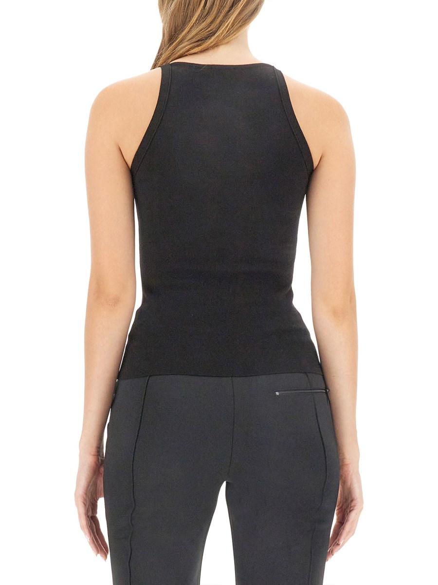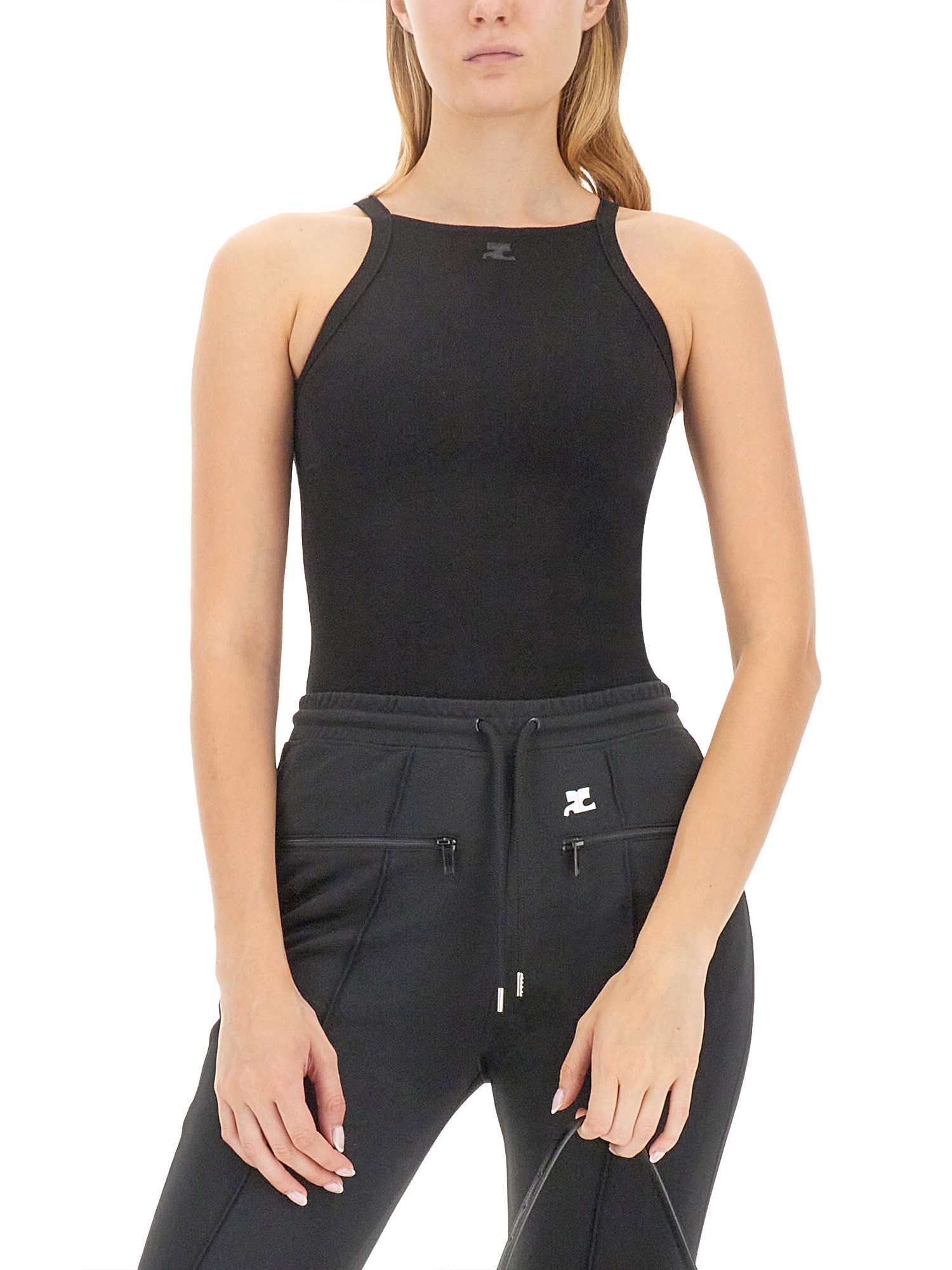 La canotta nera in misto viscosa di Courreges è un bellissimo capo d'abbigliamento. È realizzata in un tessuto morbido ed elasticizzato, liscio al tatto. La canotta ha una vestibilità rilassata che starà benissimo con un paio di jeans o una gonna. Con un pizzico di glamour e un'ottima vestibilità, è il capo perfetto per l'estate.