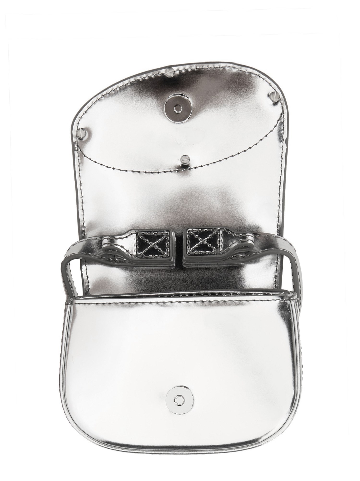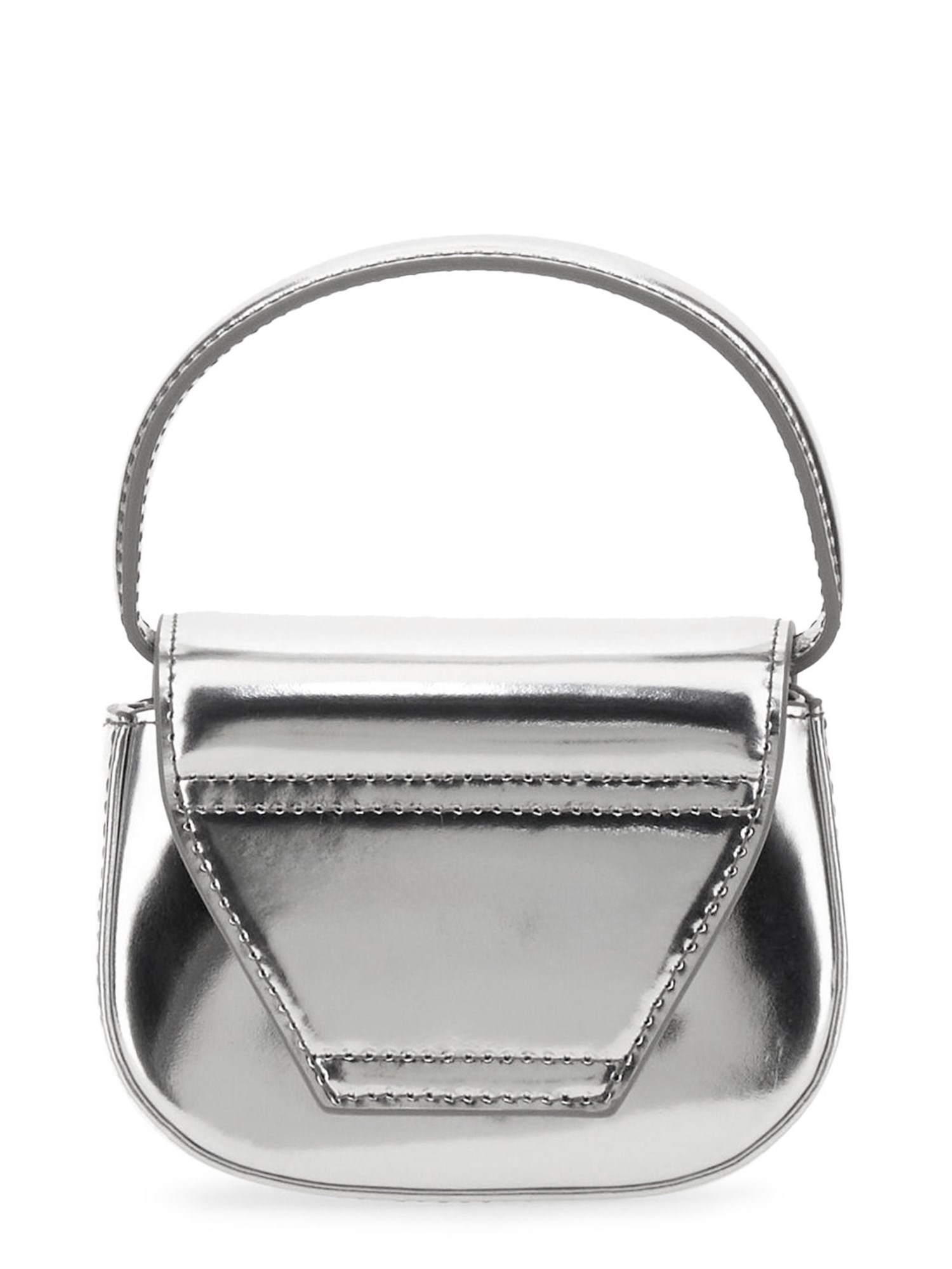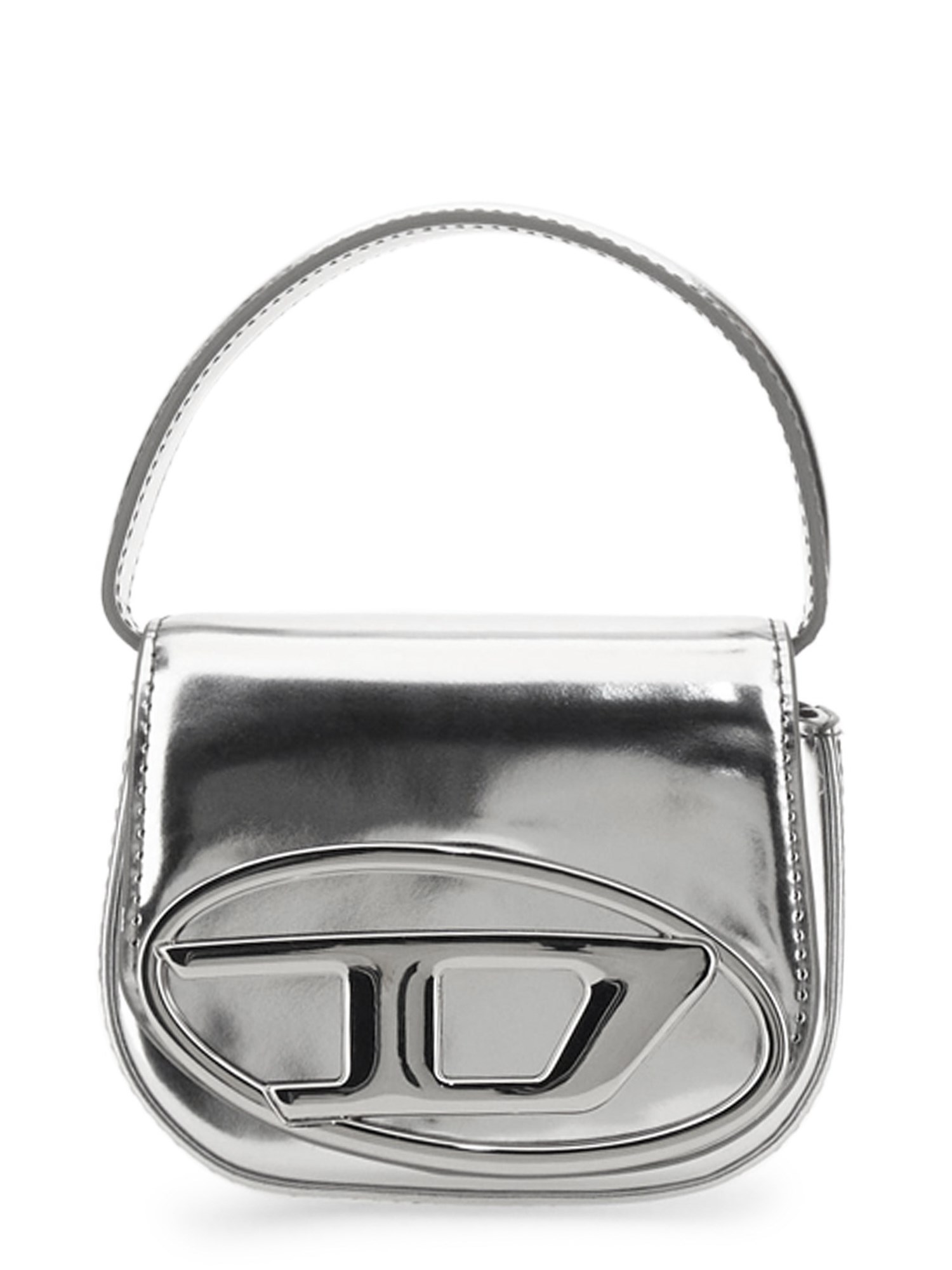 Questa mini borsa da donna è una versione ridotta della it-bag di Diesel. Progettata con una forma strutturata a mezzaluna, è realizzata in pelle lucida a specchio e presenta una patta decorata con minuteria ovale a D in tinta, l'elemento di design caratteristico della 1DR.