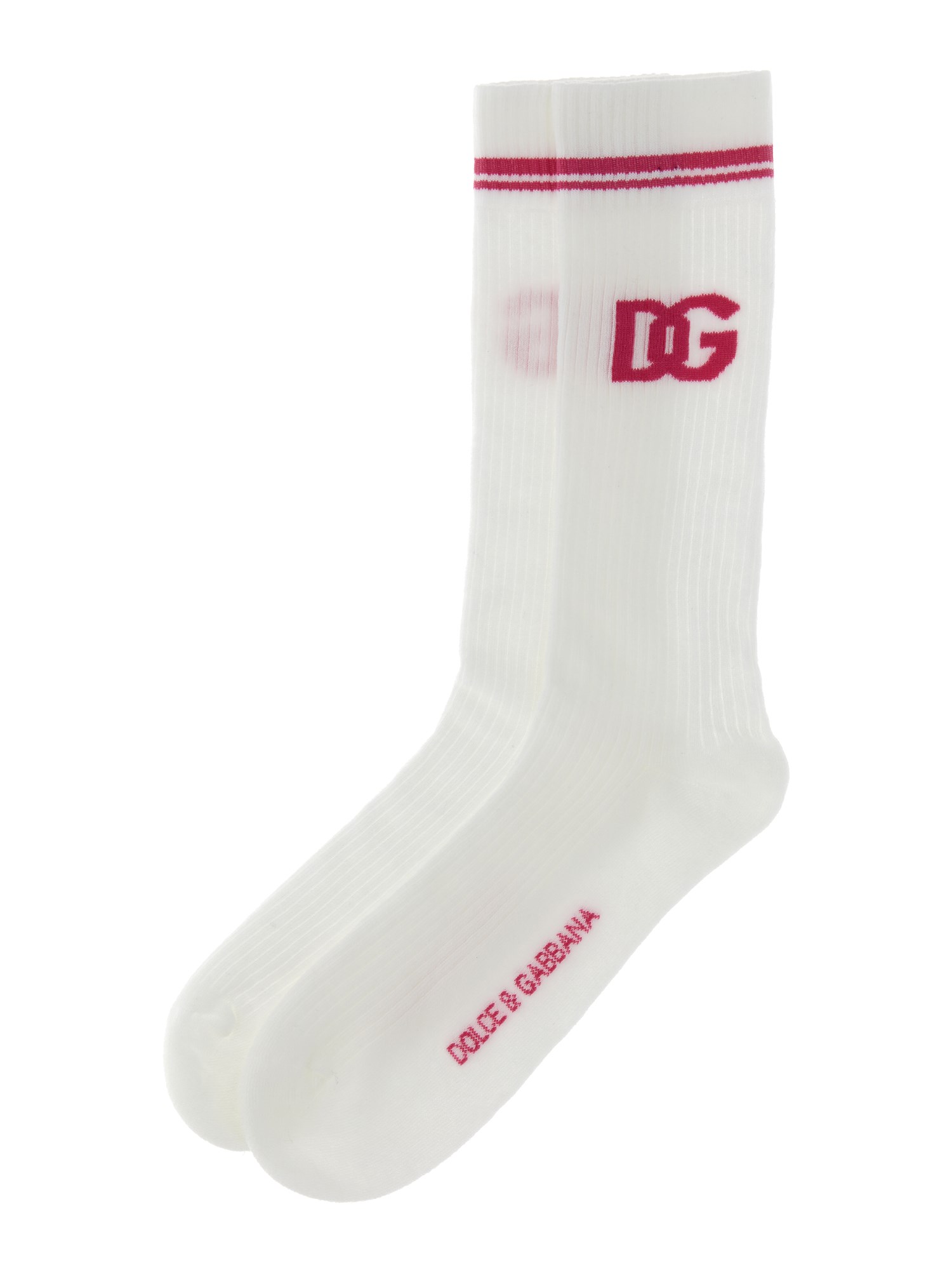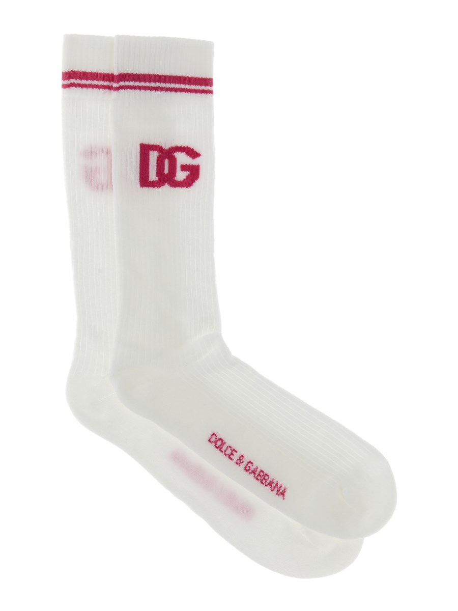 I calzini con logo DG Jacquard della maison Dolce & Gabbana sono realizzati in tessuto pregiato, morbido ed elastico, resistente e leggero. Questi calzini sono realizzati in tessuto misto cotone, quindi sono perfetti per l'estate. Hanno un motivo jacquard con logo DG e una silhouette lunga fino al ginocchio.