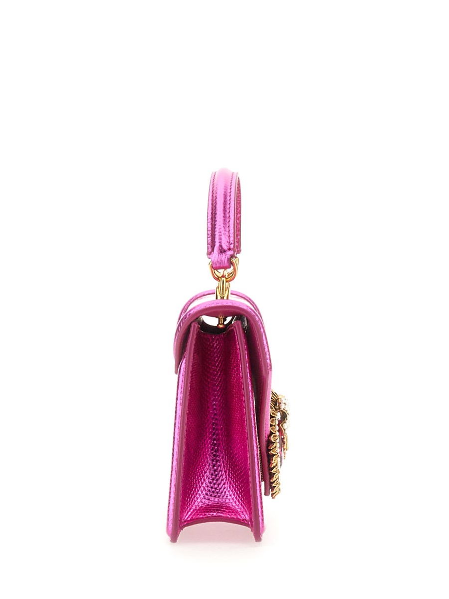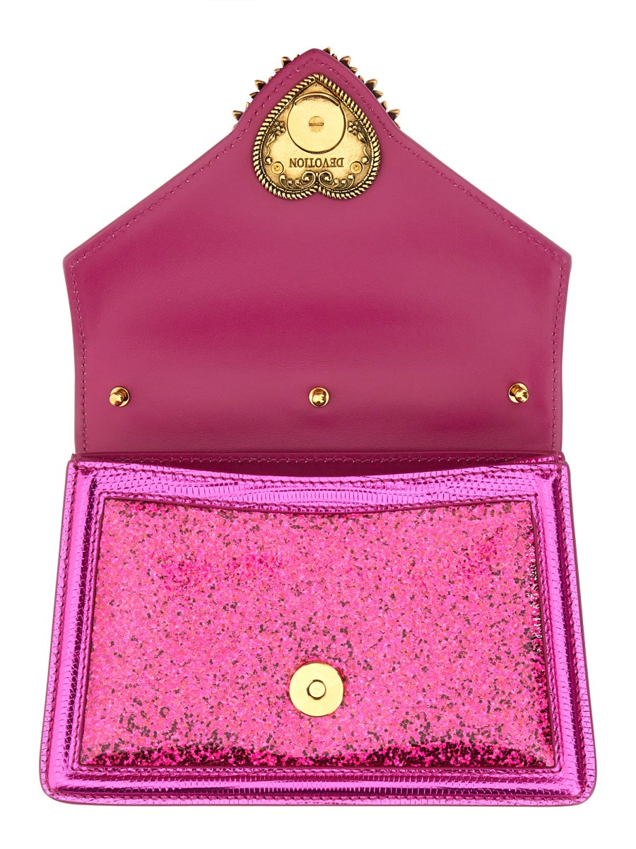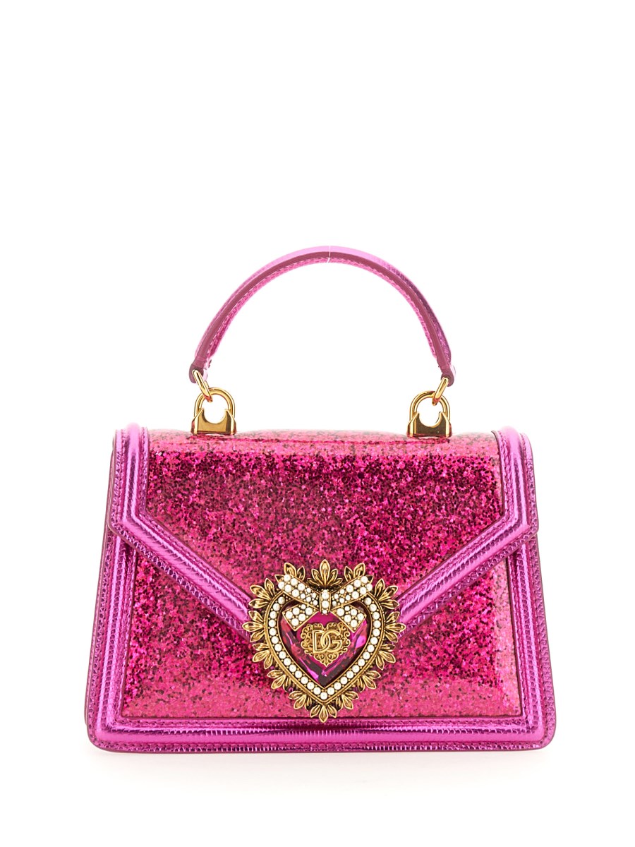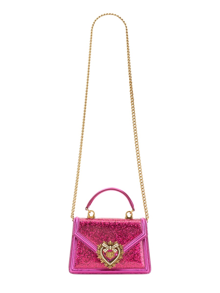 La borsa piccola con manico superiore della linea Devotion presenta nuovi dettagli. Impreziosita da glitter ricoperti da un pannello trasparente, presenta l'esclusiva chiusura a cuore ingioiellata e una tracolla ispirata alle tecniche dell'alta gioielleria.