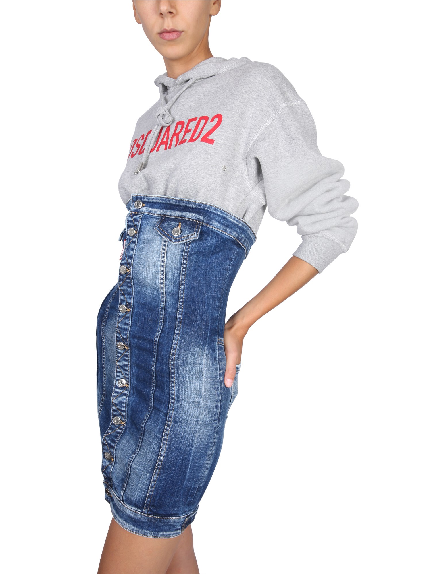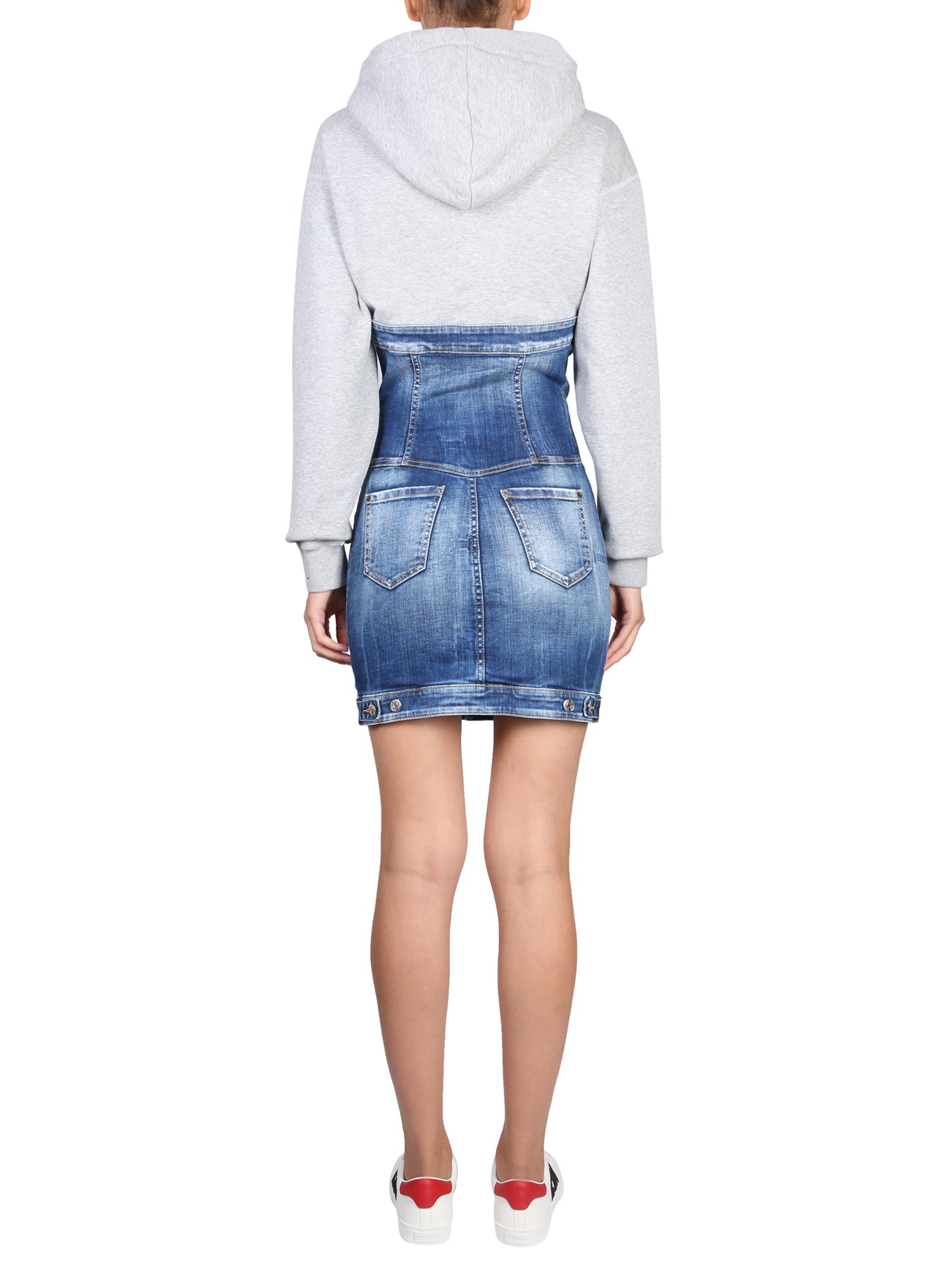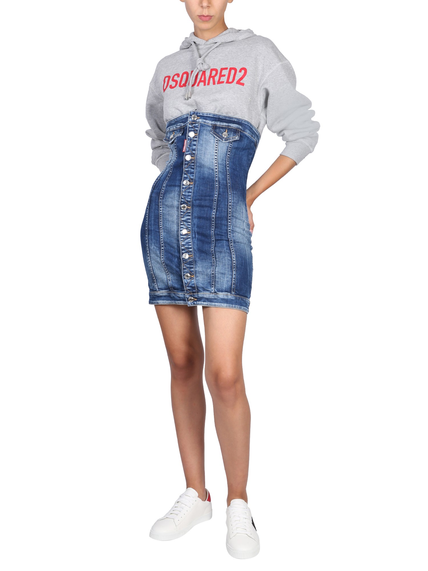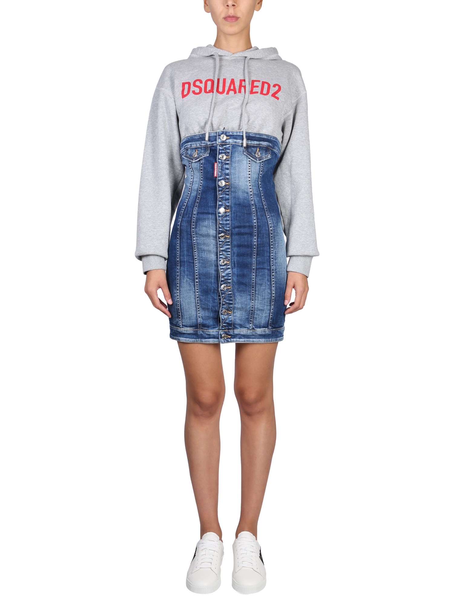 Elegante e raffinato, l'abito bustier in denim della maison Dsquared diventerà sicuramente il vostro nuovo capo di punta. Presenta cappuccio con coulisse, maniche lunghe con chiusura a bottoni, stampa frontale del logo, etichetta con logo e tasche posteriori. L'abito, dalla vestibilità regolare, ha una silhouette mini.
