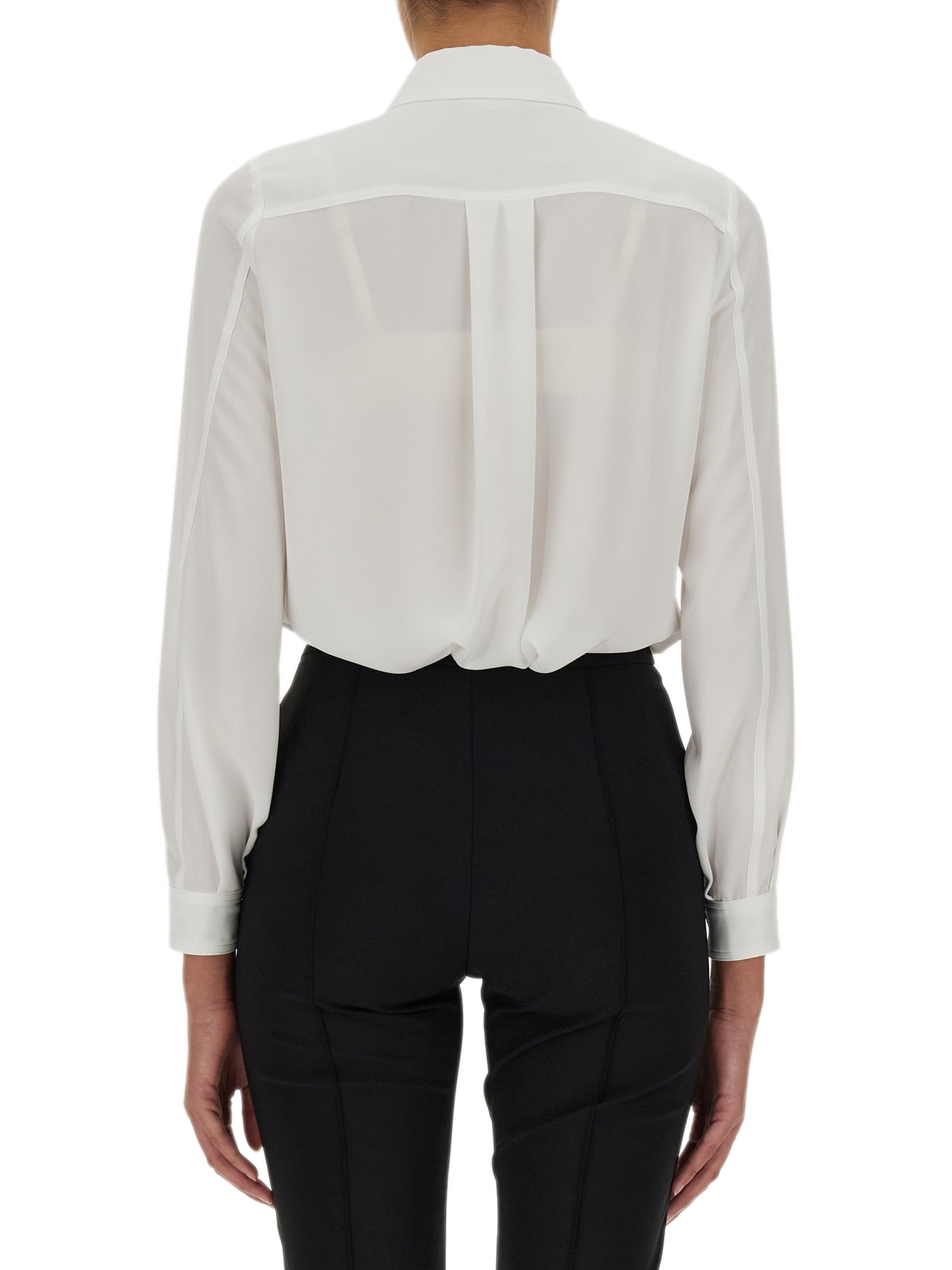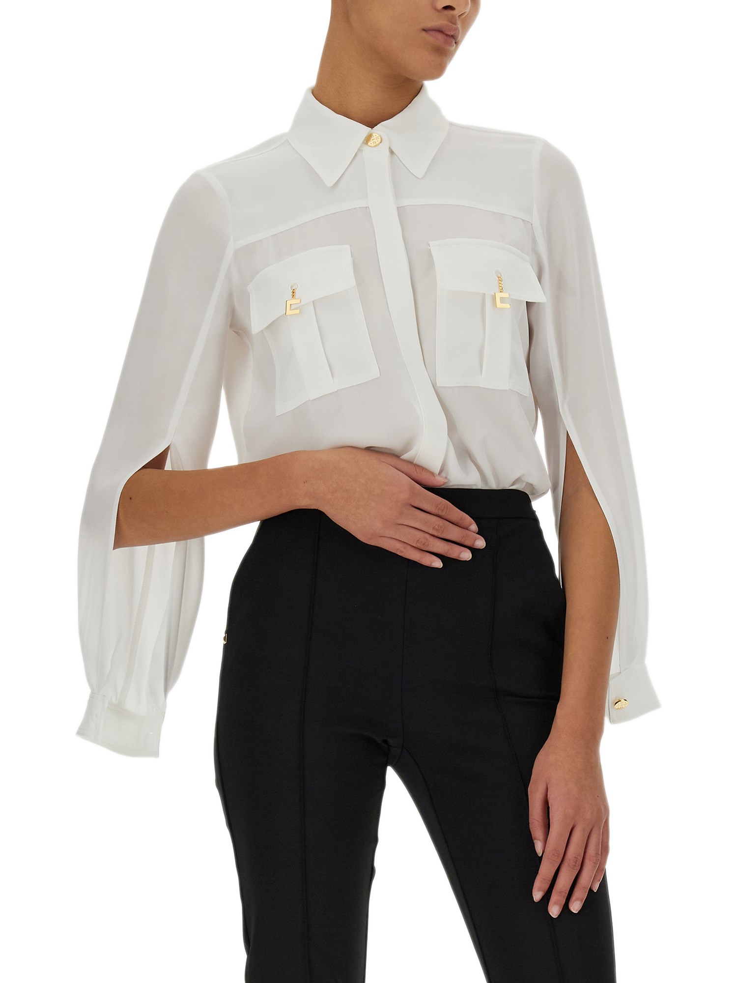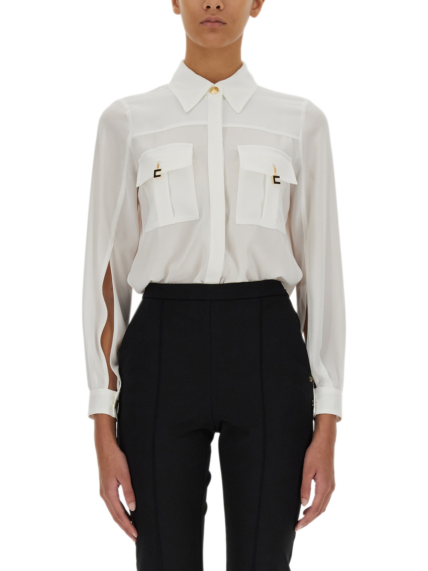 La camicia con logo charm della maison Elisabetta Franchi è un capo di moda unico con un design fresco e di tendenza. Il dettaglio del logo si trova sulle tasche anteriori, a forma di ciondolo. Questo design è un modo fresco per distinguersi ed essere unici. Ha un colletto classico, maniche lunghe, chiusura frontale nascosta e due tasche applicate sul petto.