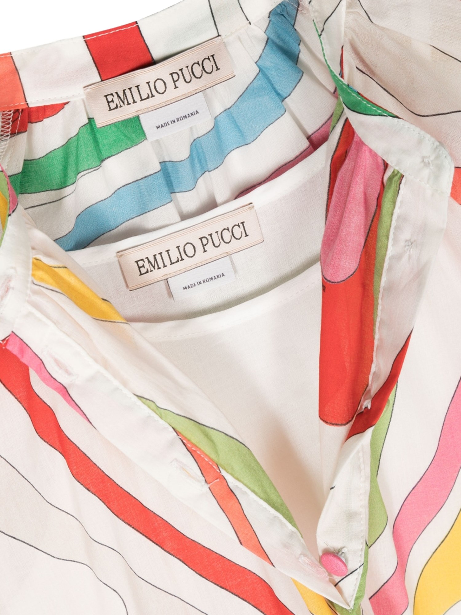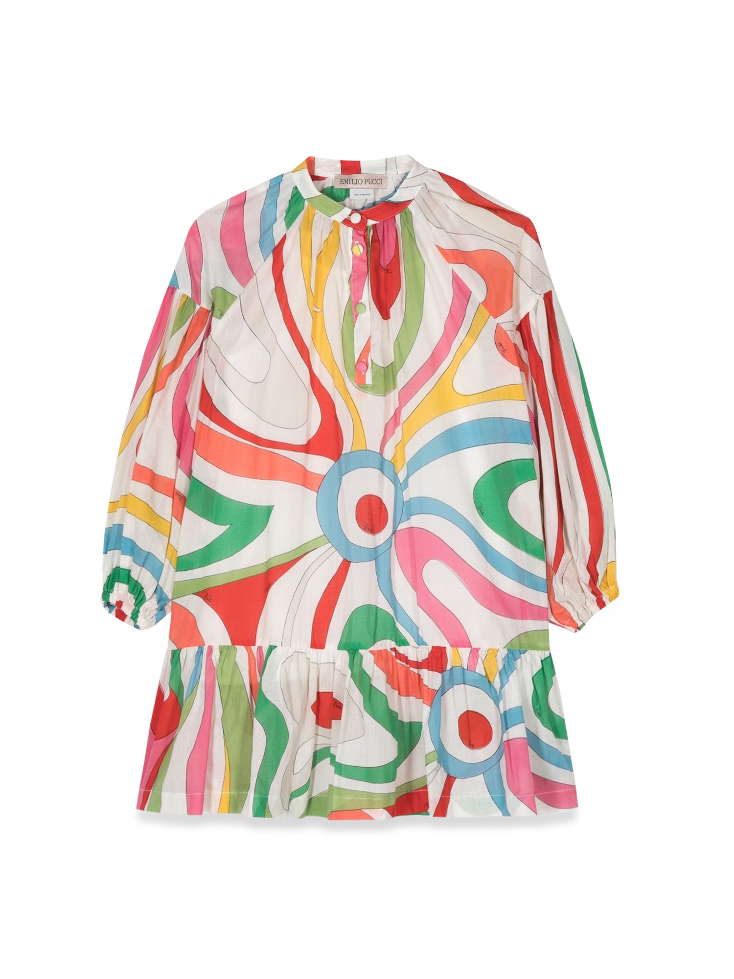 Date un tocco di colore al vostro guardaroba scegliendo l'abito in fantasia ml di Emilio Pucci. L'abito presenta un colletto rotondo con abbottonatura, maniche lunghe con polsini elasticizzati e una gonna a strati. L'abito è comodo ed elegante e completa il vostro look.