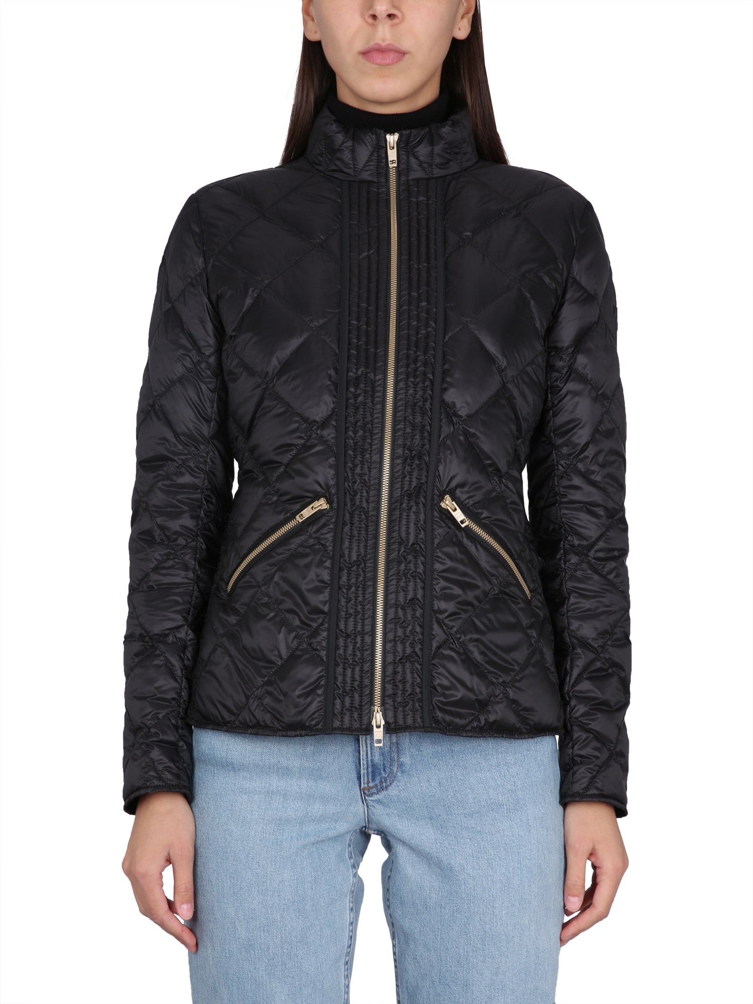 Piumino leggero in nylon idrorepellente semilucido con trapuntatura a rombi e tasche oblique con zip. Impreziosito da cuciture a zig zag sul colletto, è dotato di cuciture verticali che sottolineano la chiusura a zip.