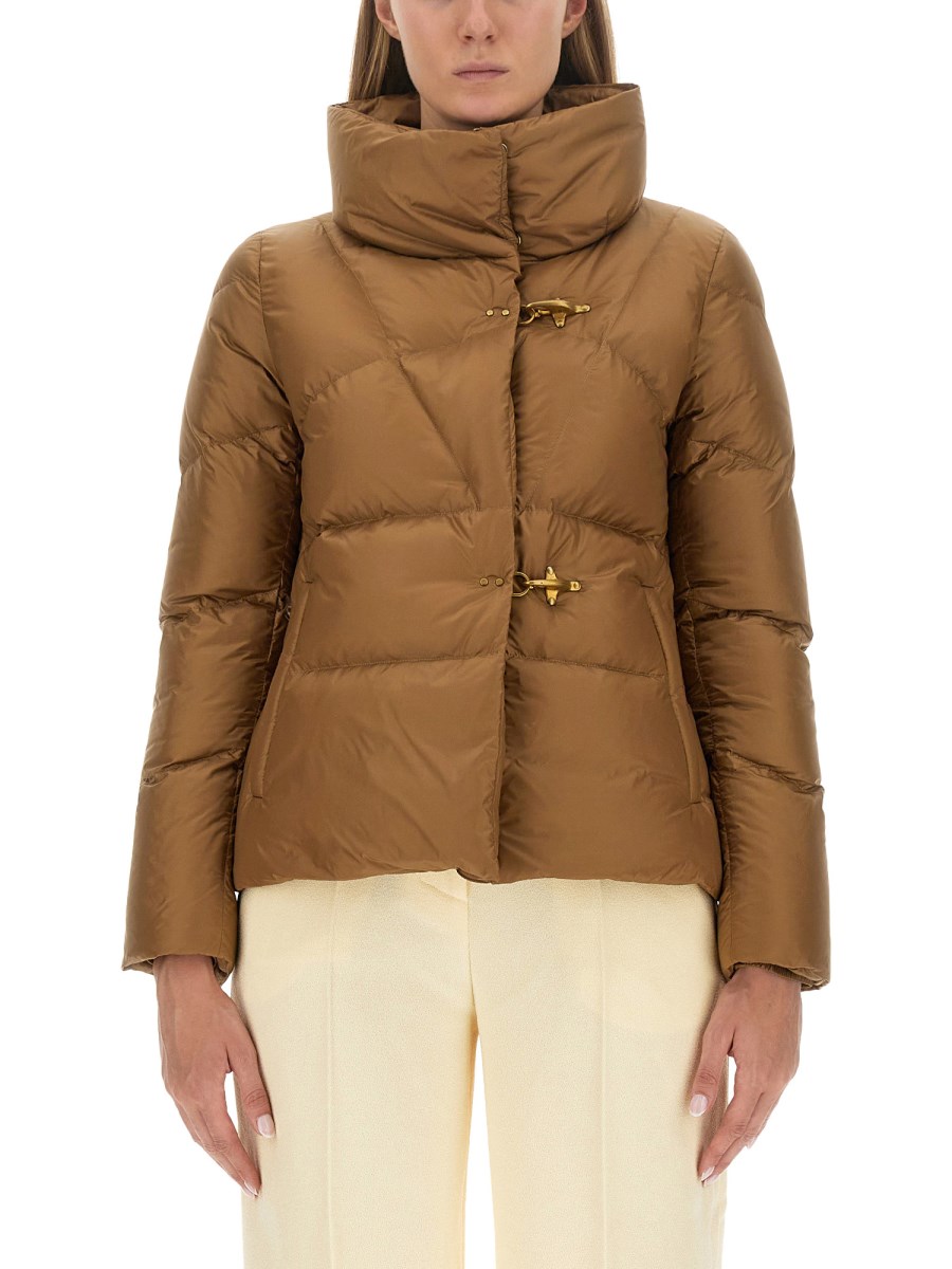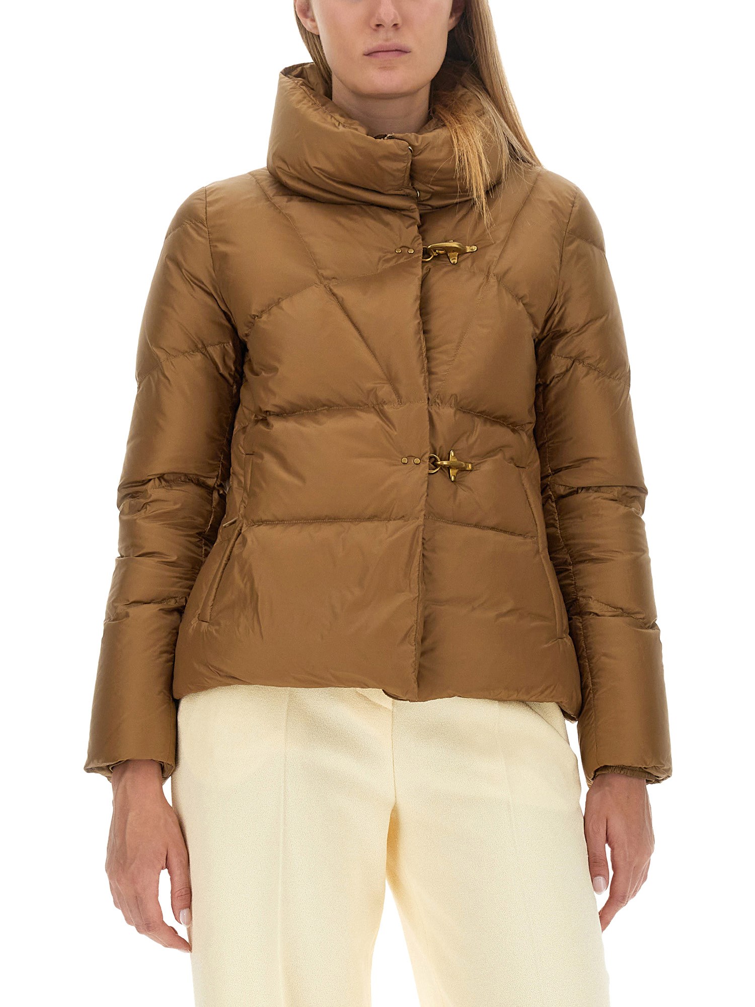 Reinterpretazione dell'iconico Gala, questo piumino corto con collo alto è caratterizzato da un mix di cuciture. Realizzato in nylon ultraleggero trapuntato idrorepellente, presenta tasche a filetto con zip. Capo funzionale dalla linea raffinata e femminile, la chiusura con zip e bottoni automatici nascosti è perfezionata dai caratteristici ganci Fay.