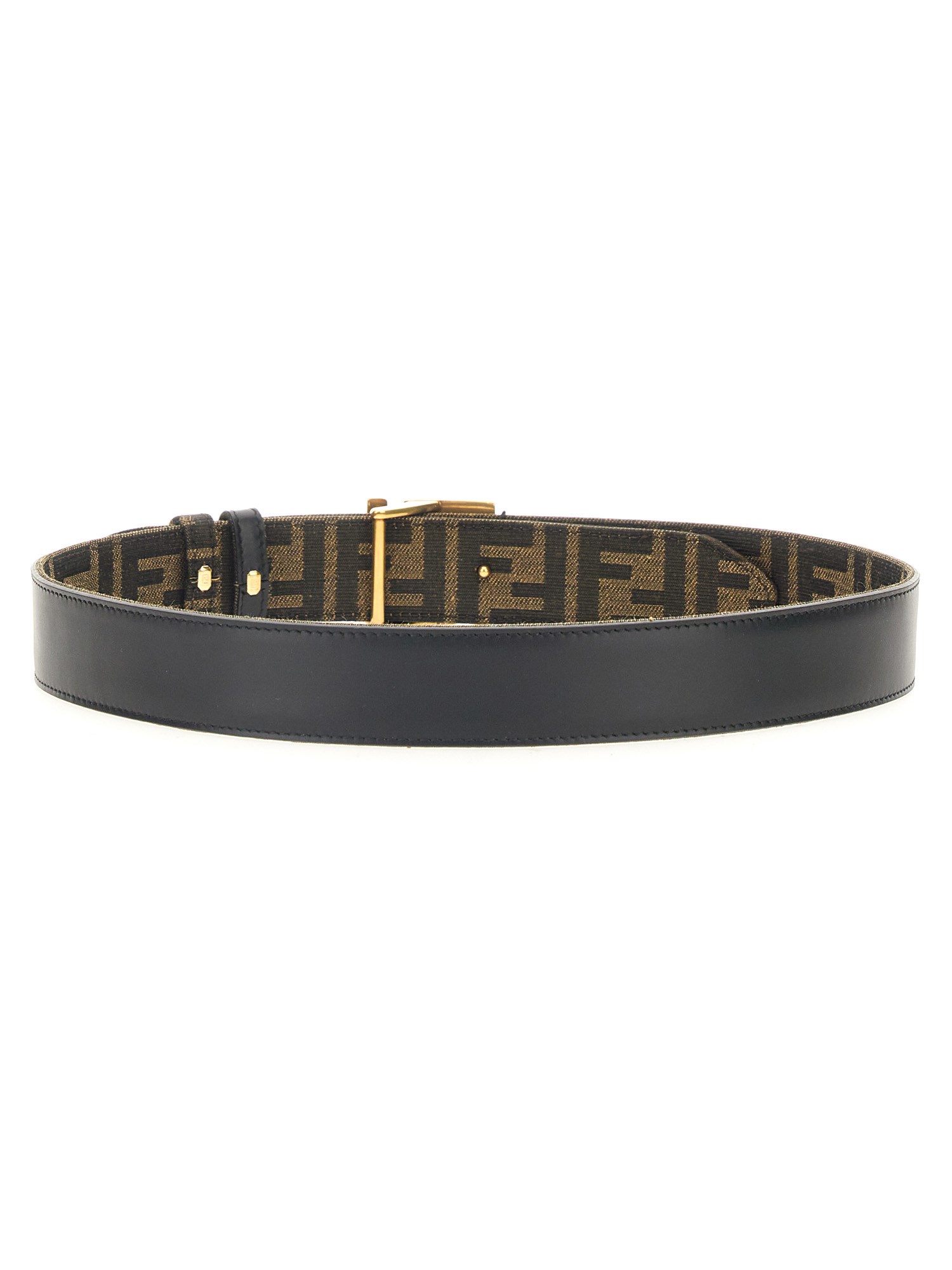 Cintura reversibile con passante e iconica fibbia con borchie FF. Realizzata in pelle nera da un lato e in tessuto con il motivo FF in marrone e tabacco dall'altro. Metalleria con finitura dorata.