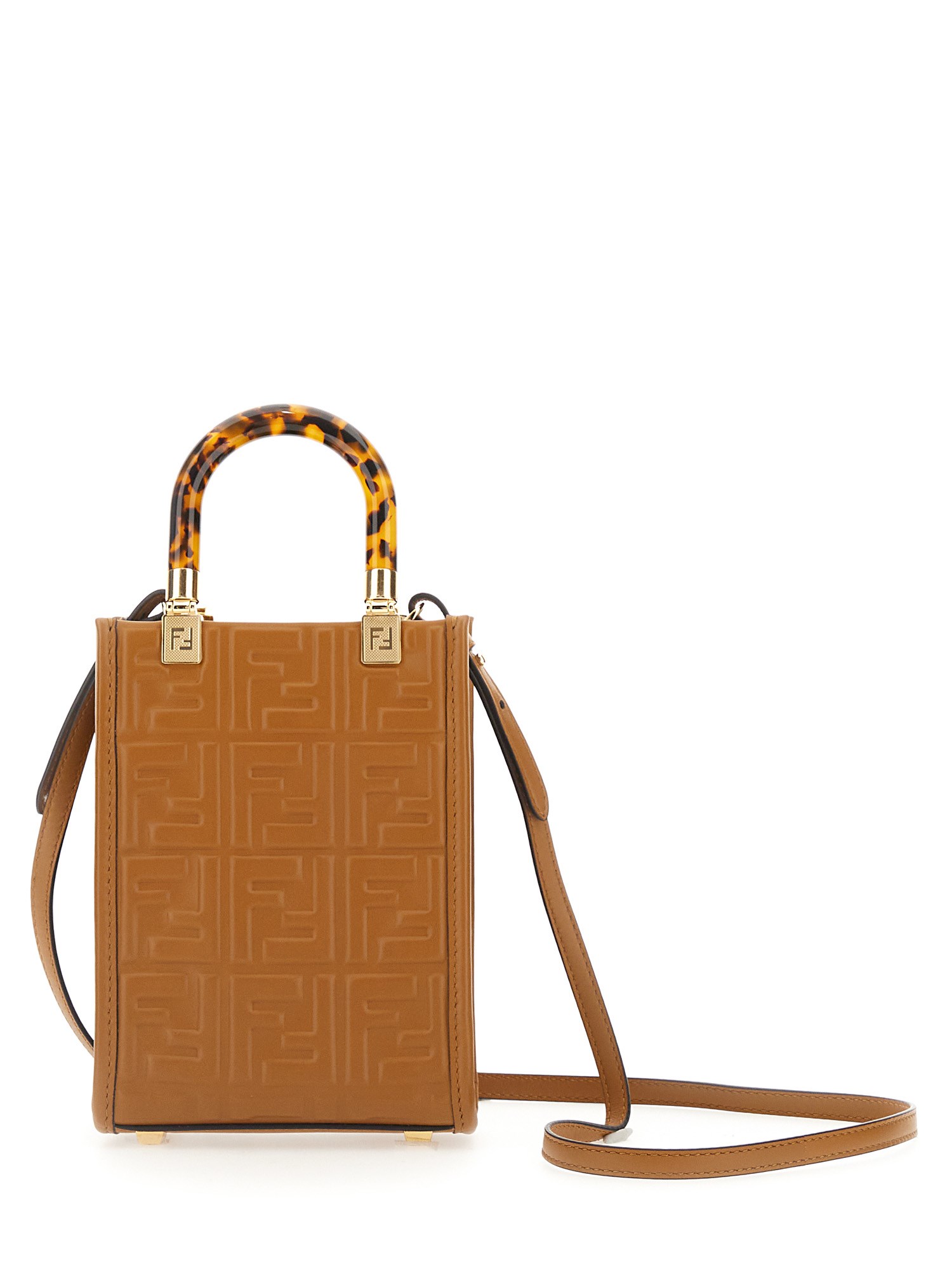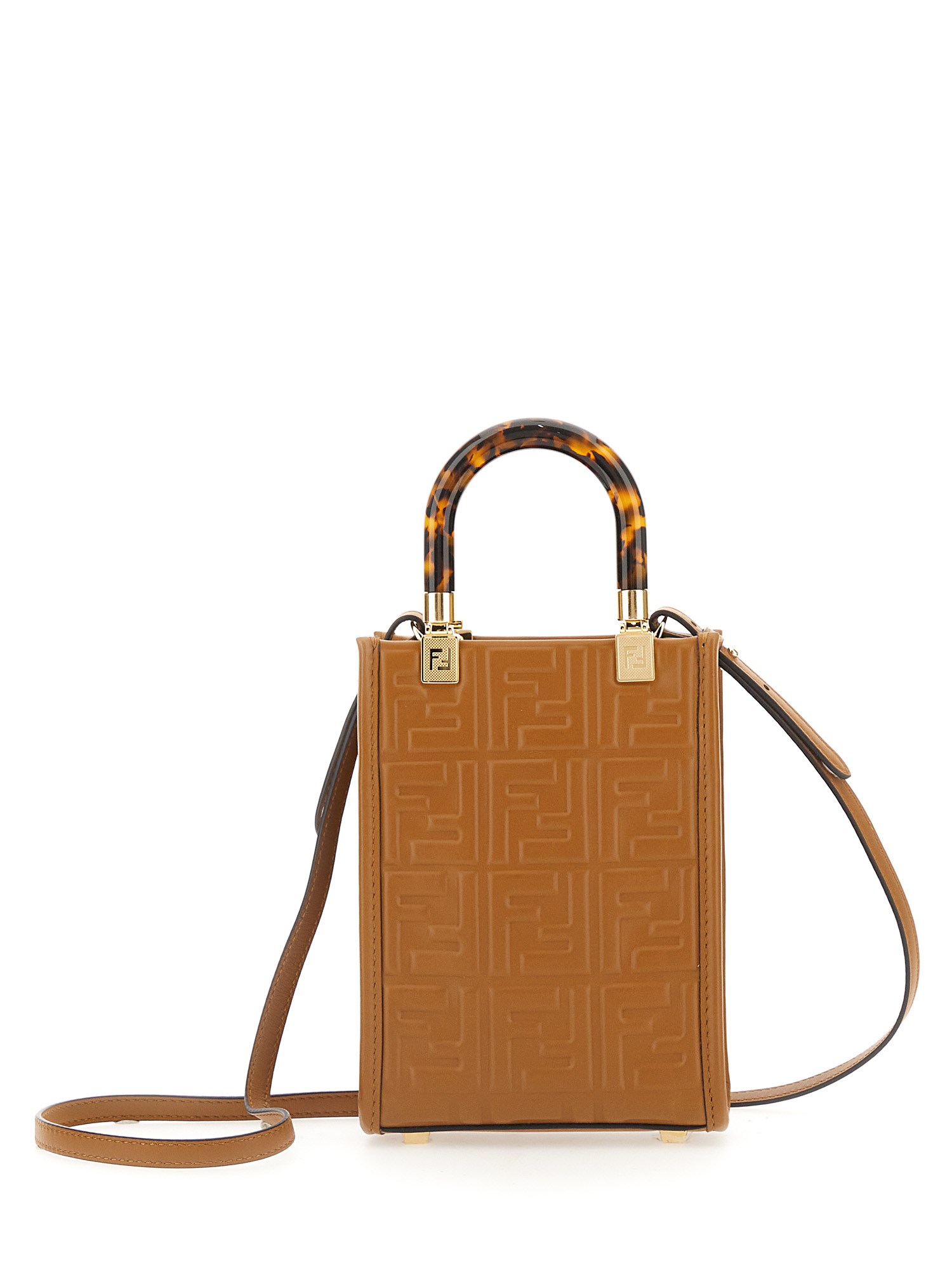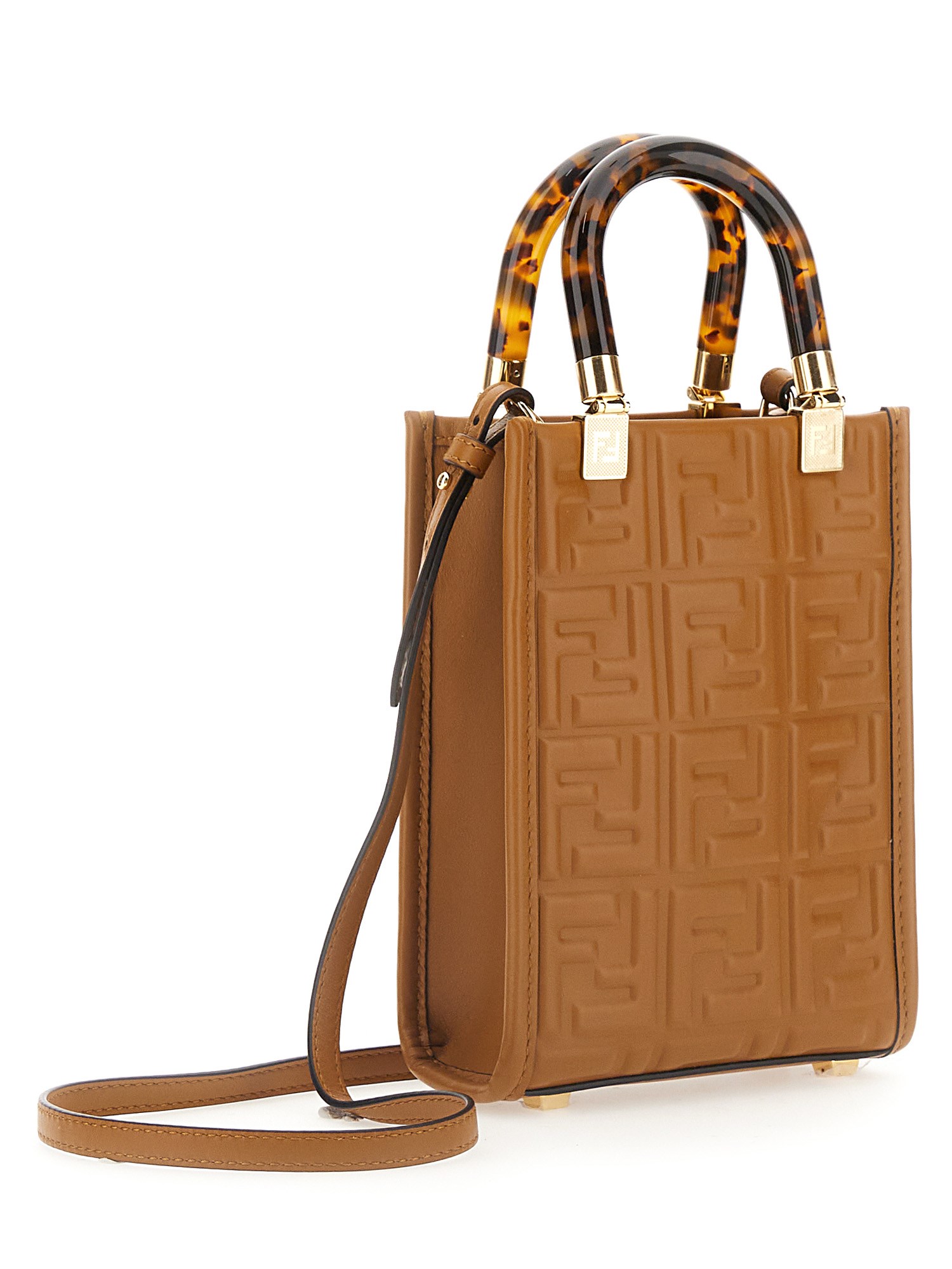 Mini Sunshine Shopper in pelle marrone con motivo FF a texture 3D e manici rigidi in plexiglass effetto tartaruga. Presenta uno scomparto interno foderato, bordi in pelle tono su tono e metalleria con finitura dorata. Può essere portata a mano o a spalla grazie ai due manici e alla sottile tracolla regolabile e staccabile.