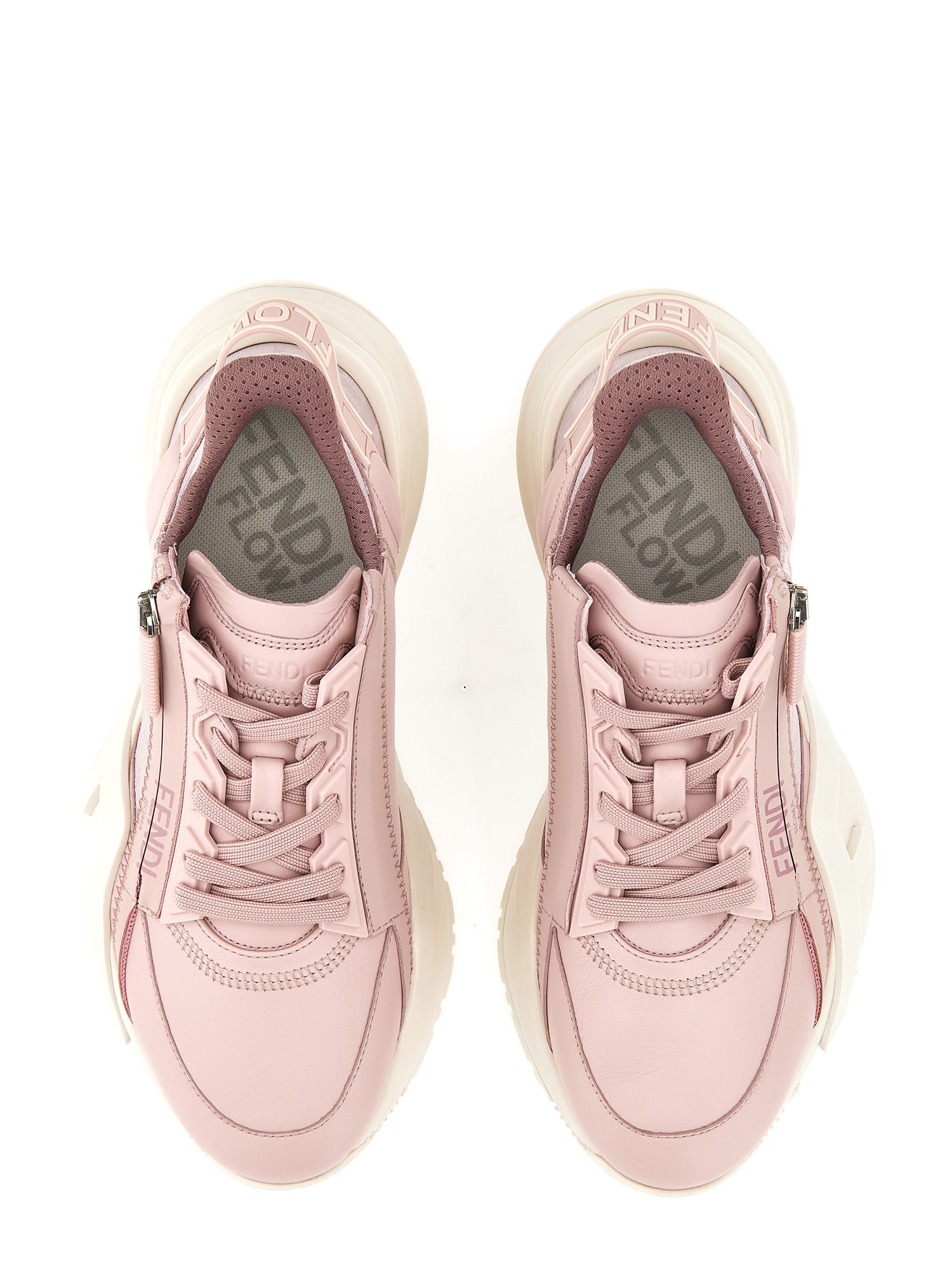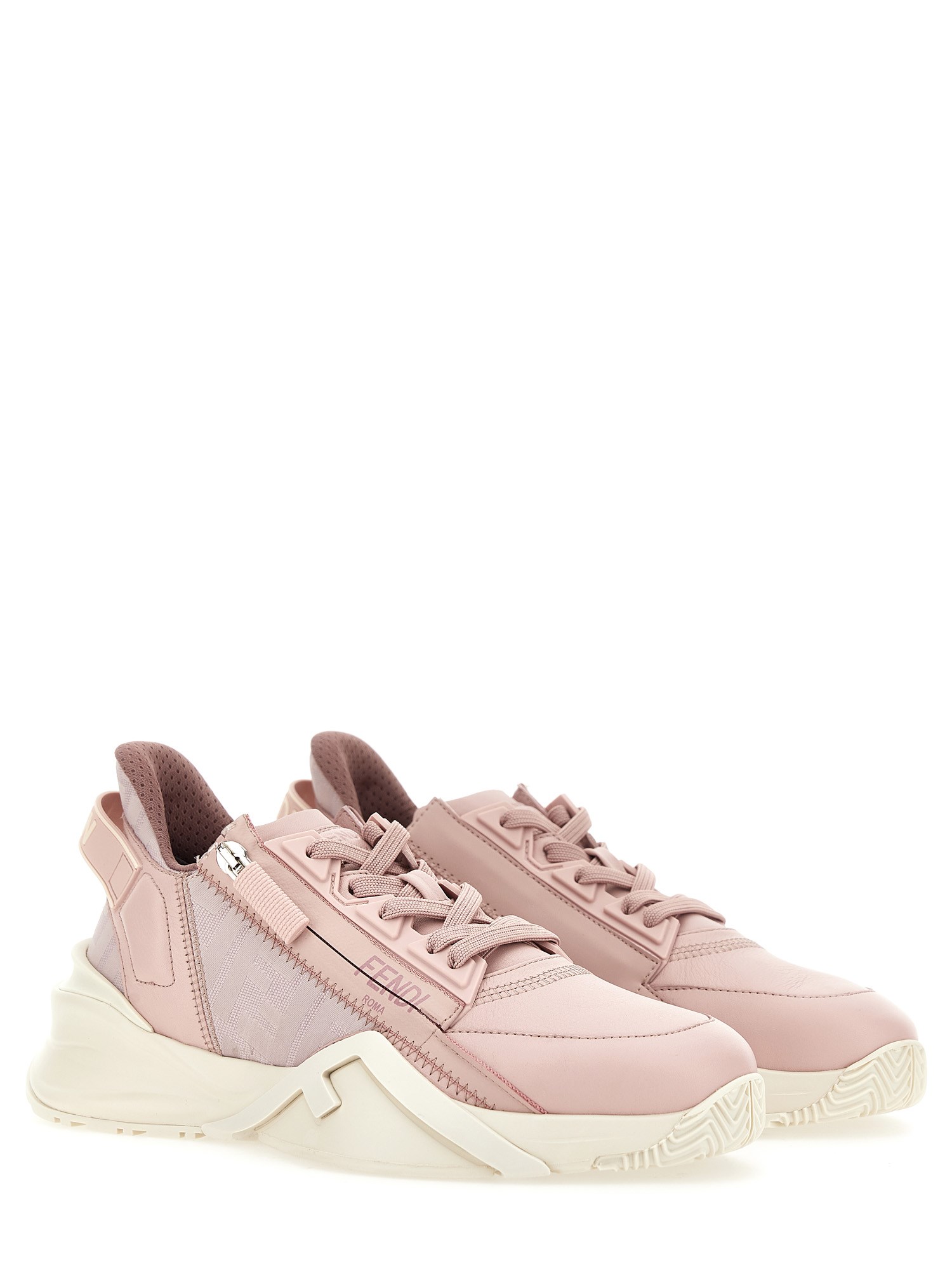 Sneakers Fendi Flow con lacci elastici regolabili e chiusura a zip laterale. Personalizzate con linguetta in gomma con logo in rilievo sul retro del tallone. Realizzate in pelle rosa. Dettagli in tessuto FF tono su tono. Suola da 35 mm in gomma con dettaglio F diagonale bianco.