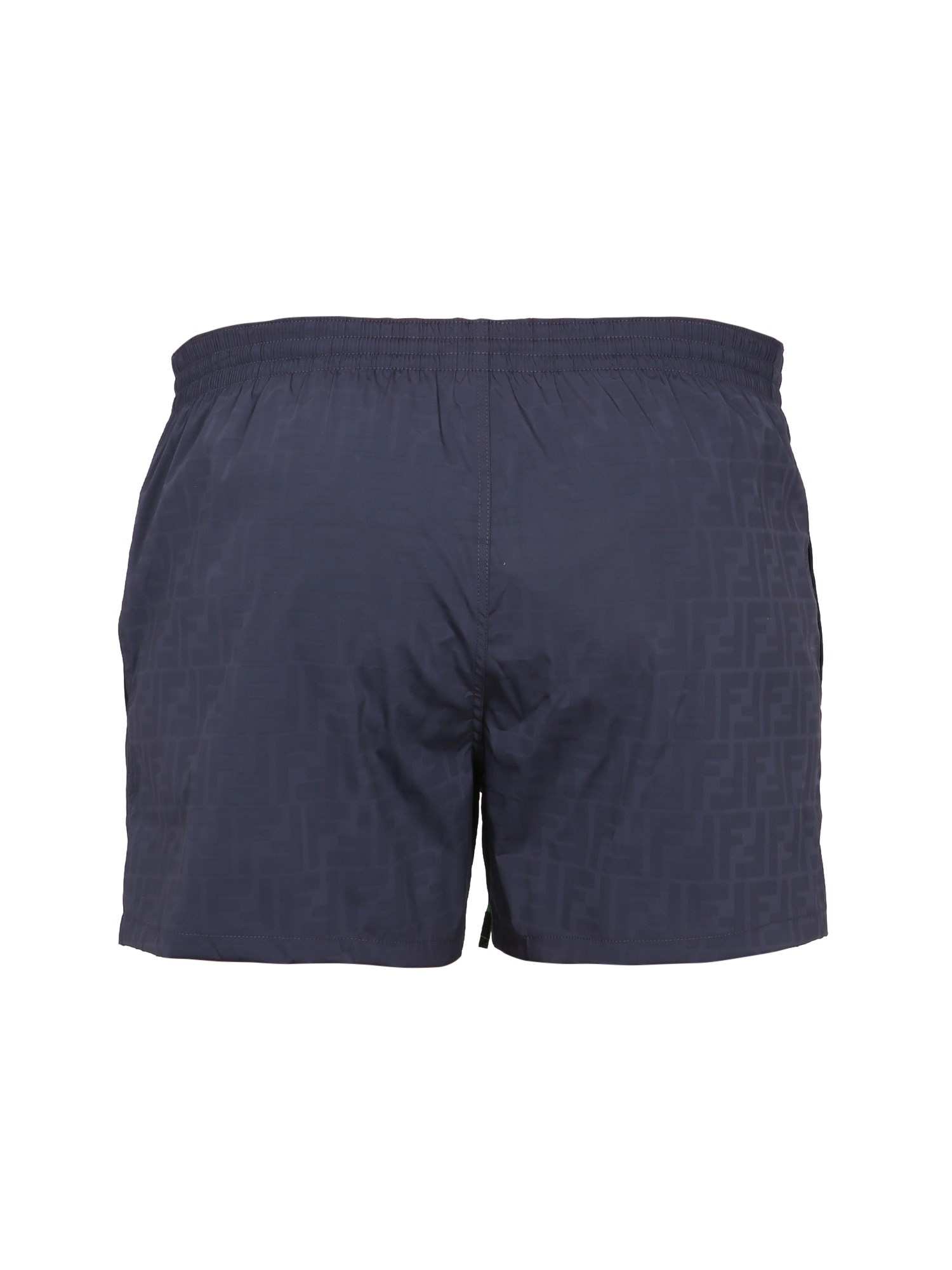 Pantaloncini da bagno con elastico in vita e coulisse. Realizzati in nylon blu. Quando è bagnato, il tessuto rivela un motivo FF in tono. Impreziositi da lacci verdi.