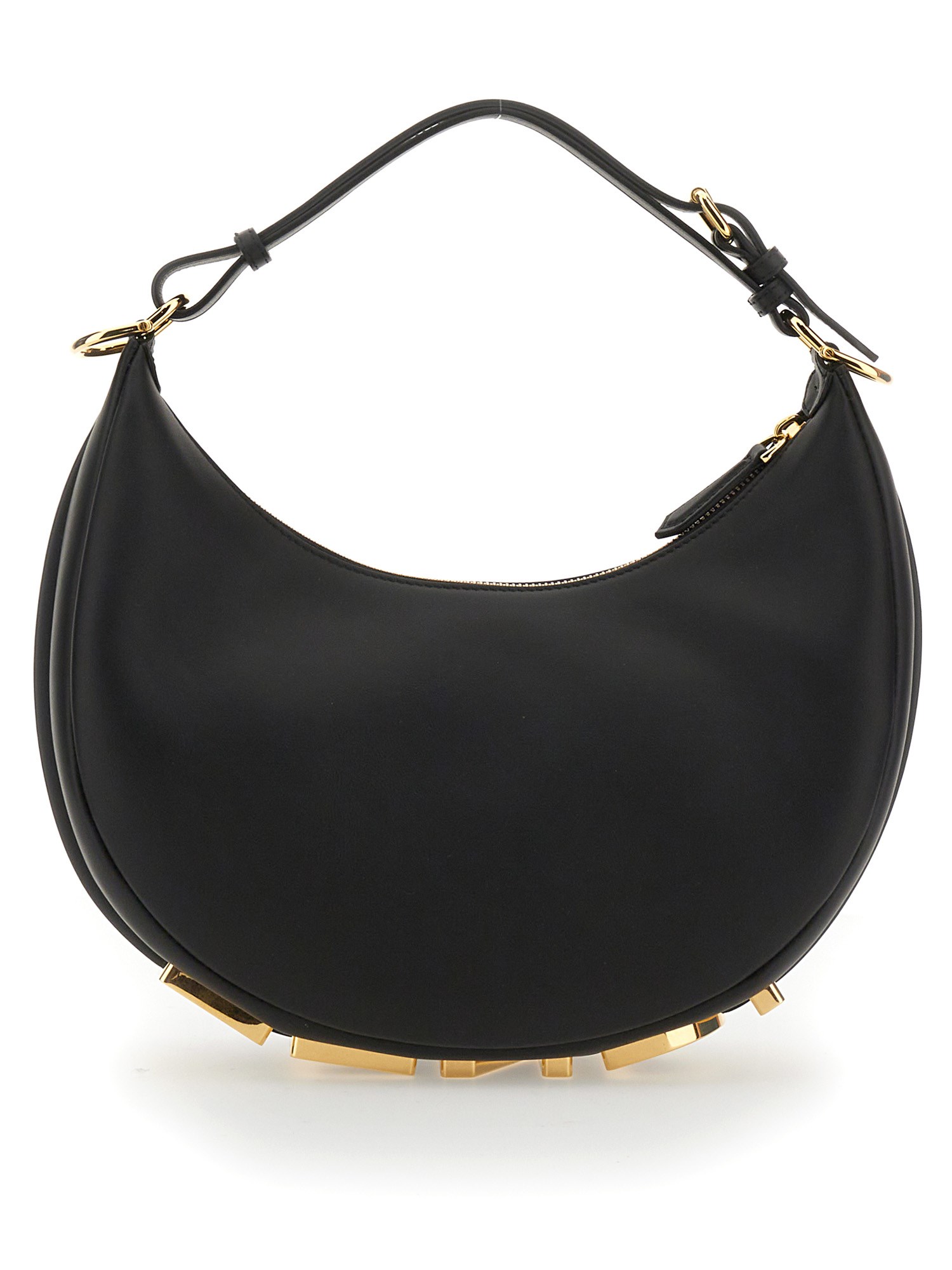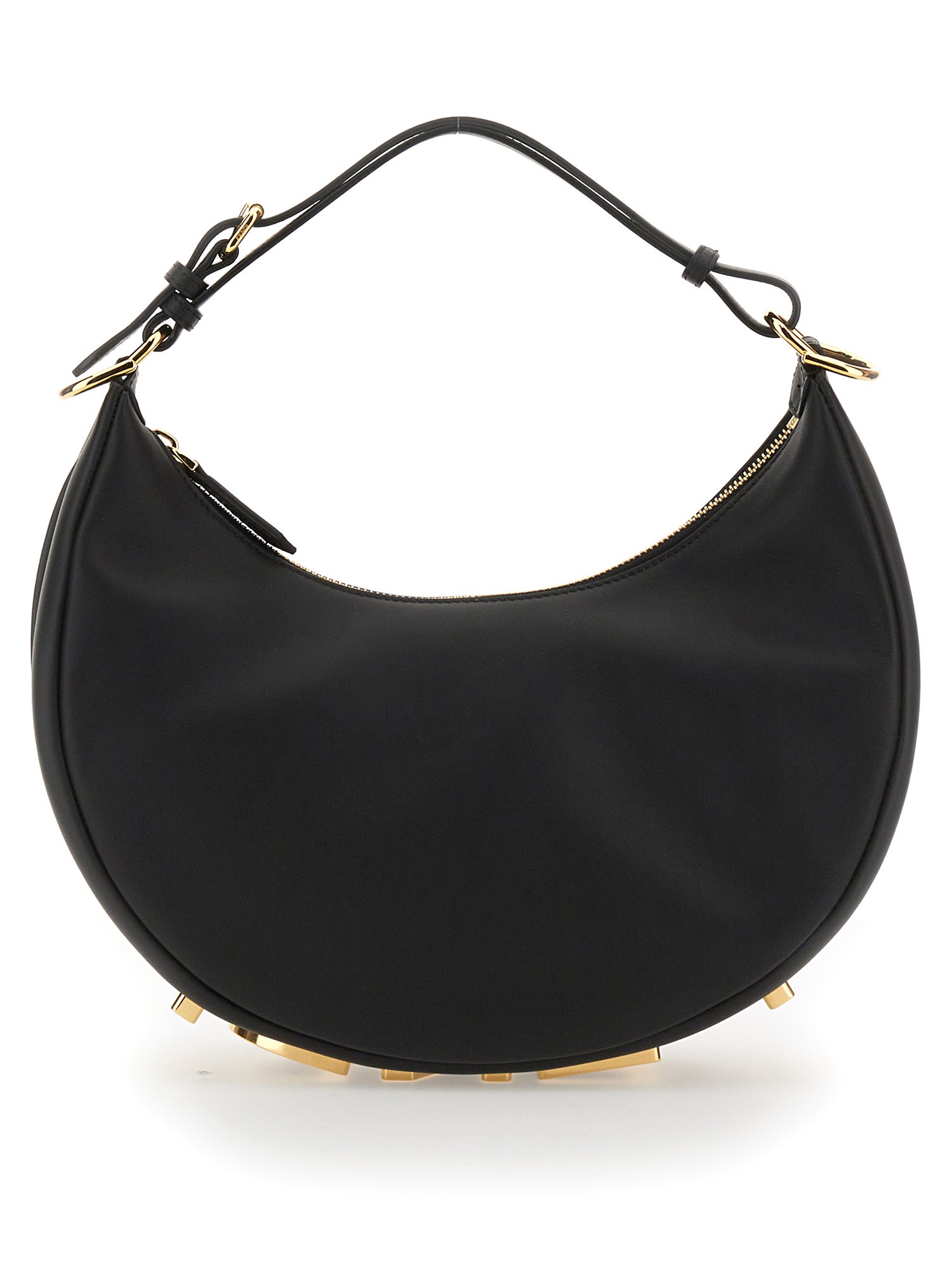 Borsa hobo piccola in morbida pelle nera, con scritta FENDI vintage in metallo dorato visibile quando la borsa viene indossata sotto il braccio. Chiusura con zip e scomparto interno foderato in tessuto, metalleria dorata.