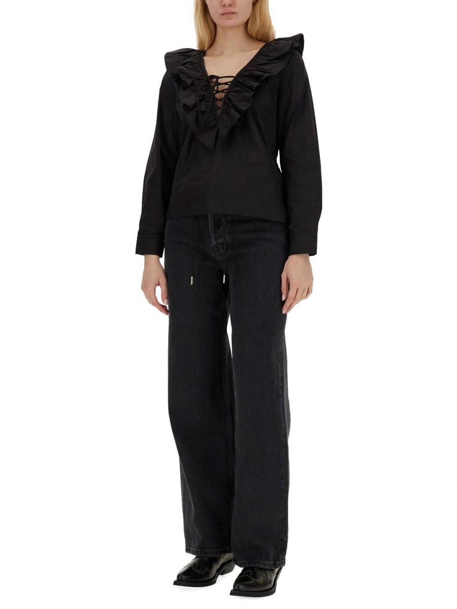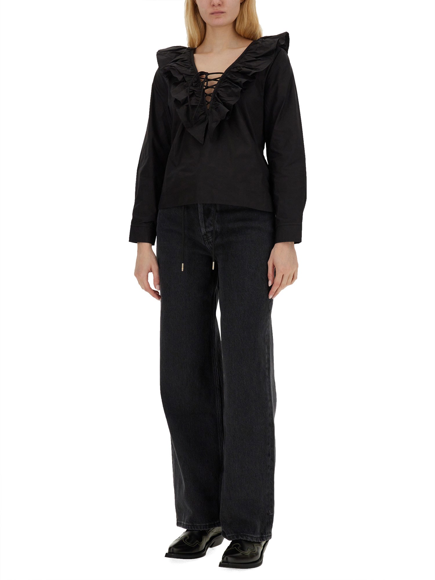 Migliorate il vostro gioco con i pantaloni in denim di Ganni! Progettati per garantire stile e comfort, questi pantaloni sono un punto fermo del guardaroba. Facilmente regolabili grazie alla coulisse e ai passanti per la cintura in vita, consentono di ottenere sempre la vestibilità perfetta. La chiusura con zip e bottoni aggiunge praticità, assicurando un'esperienza di vestizione senza problemi. La struttura a cinque tasche dà un tocco di funzionalità, consentendo di riporre gli oggetti essenziali quando si è in viaggio.