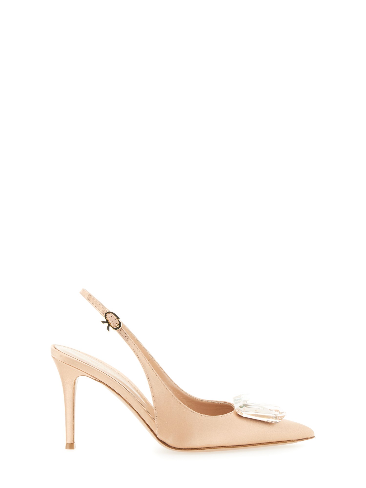 Jaipur: la maxi gemma personalizzata è protagonista di questa slingback a punta con tacco a spillo di 85 mm rivestito in pelle coordinata. Realizzata da esperti artigiani, la pietra è concepita come un dettaglio senza tempo che conferma l'essenza minimalista ed elegante del marchio. Realizzate a mano in Italia.