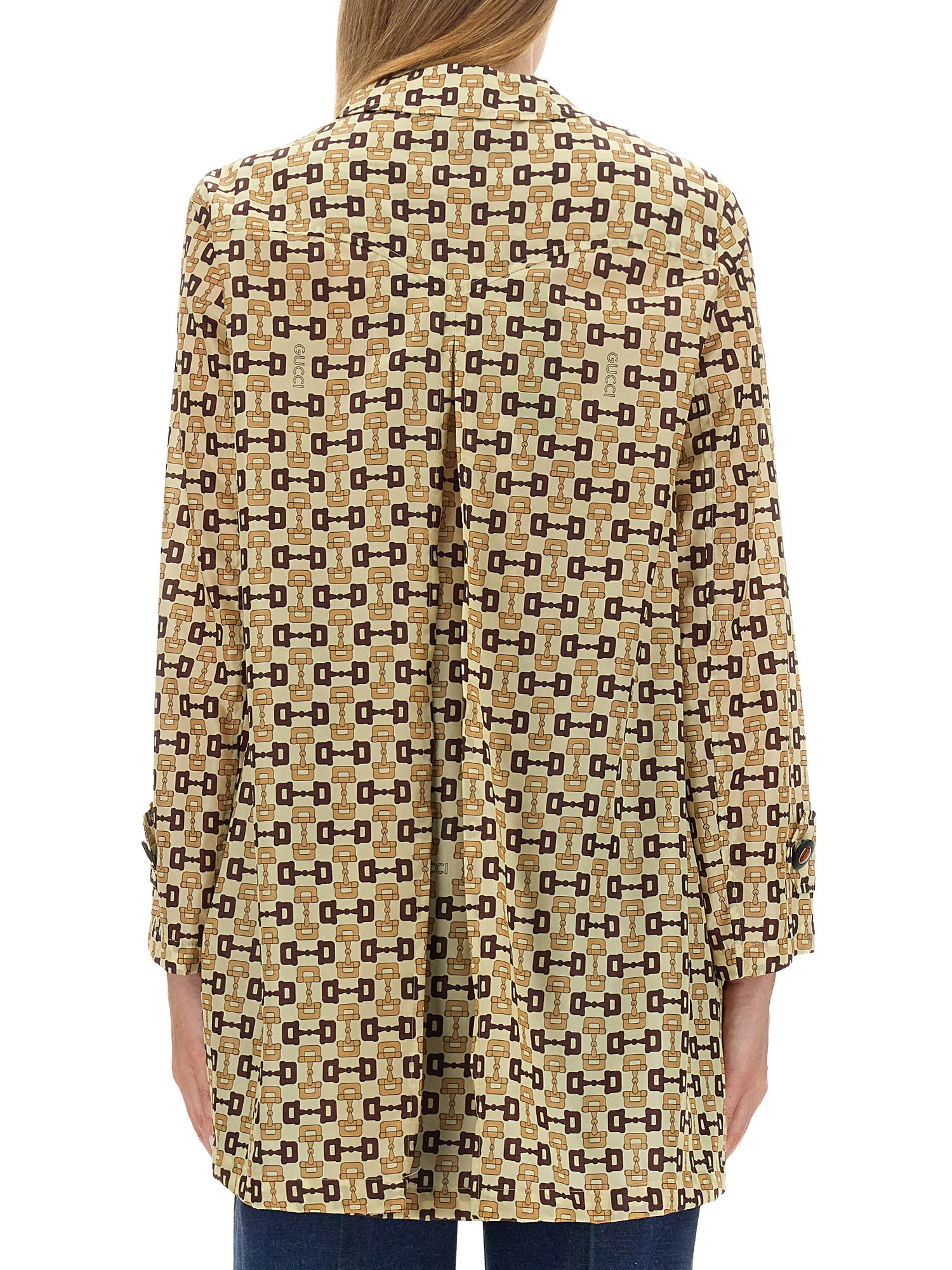 Un mix di design classici e dettagli inaspettati caratterizza la collezione Pre-Fall 2023. In questo caso, il classico motivo del morsetto viene reimmaginato in una stampa sorprendente su questo cappotto strutturato, che conferisce un fascino retrò. I bottoni smaltati GG vintage aggiungono il tocco finale, sottolineando l'importanza di ogni piccolo dettaglio.