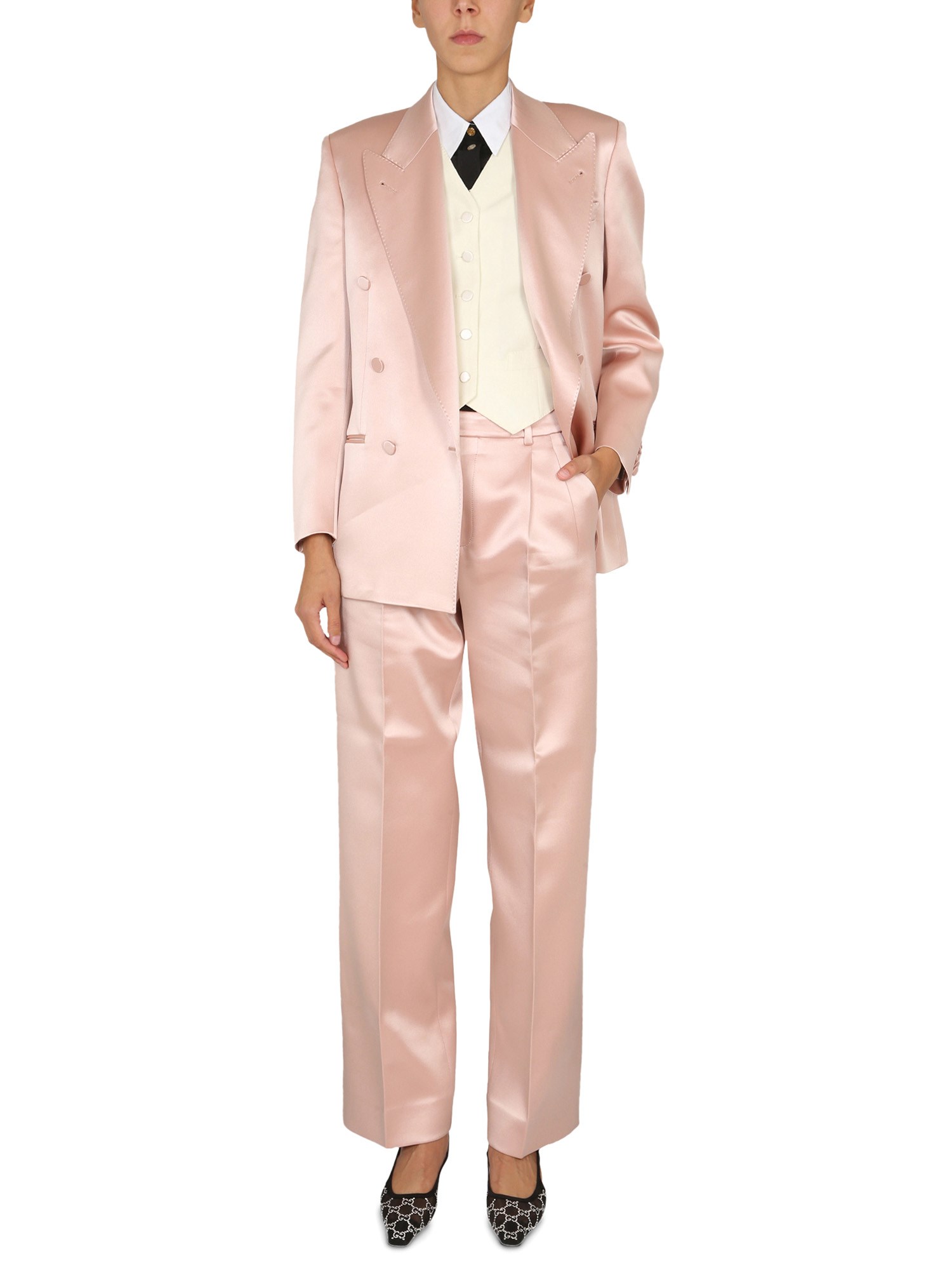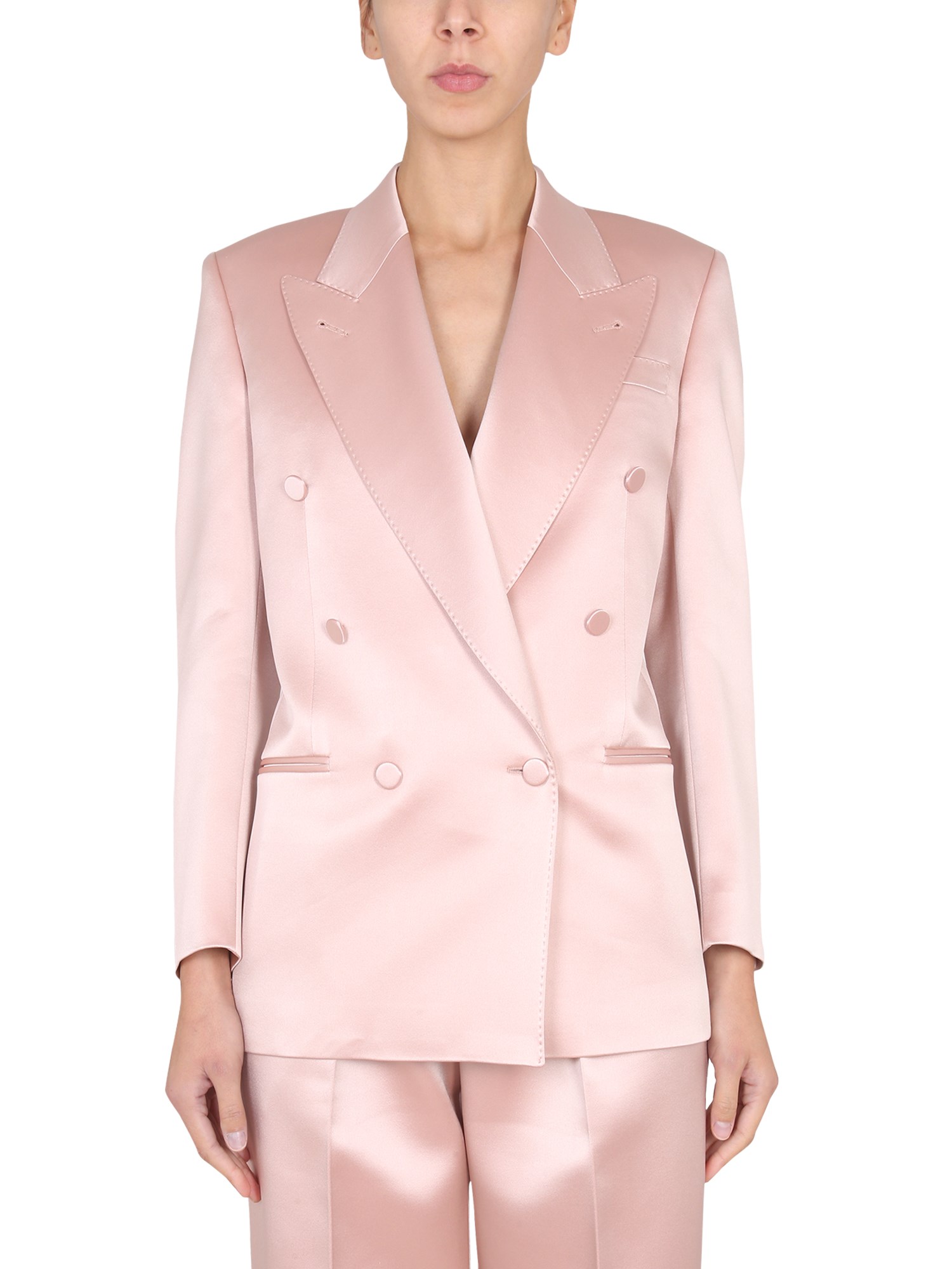Reimmaginate all'interno di un'estetica rinnovata che infonde uno spirito contemporaneo ai modelli classici, le giacche sartoriali diventano le protagoniste di look non coordinati. Realizzata in duchesse di seta rosa chiaro, questa giacca è caratterizzata da una costruzione a doppio petto e da un bavero a punta.