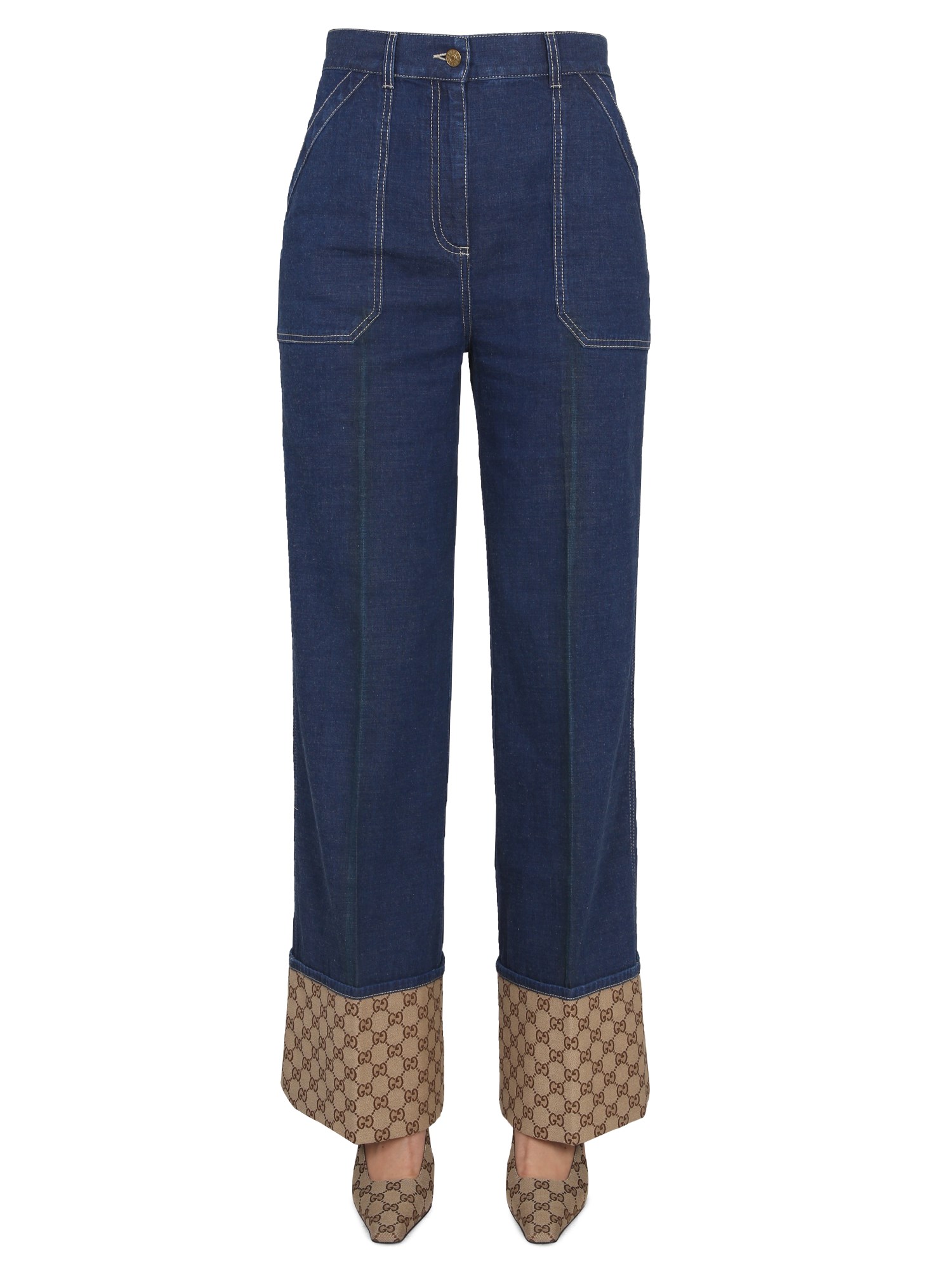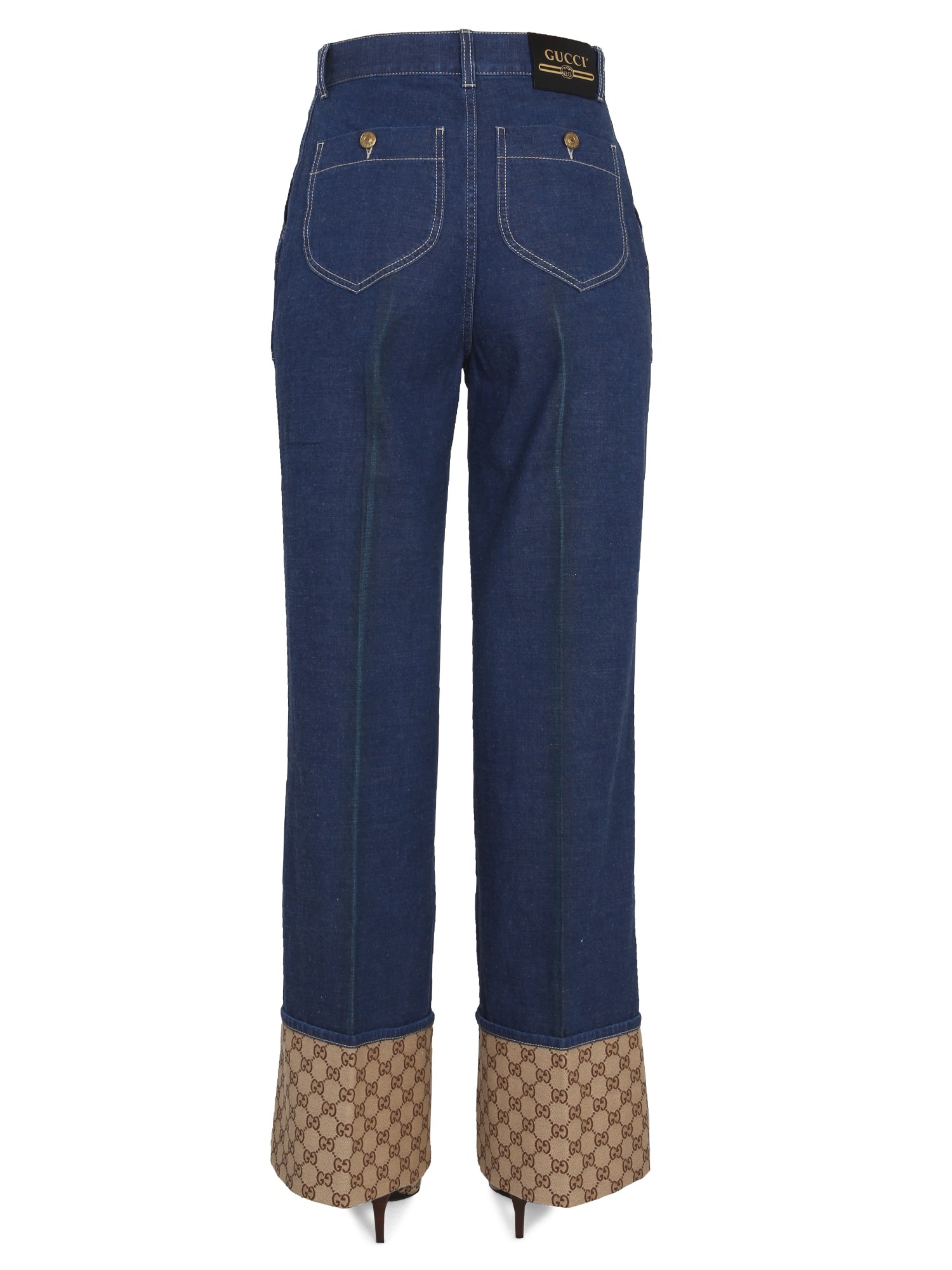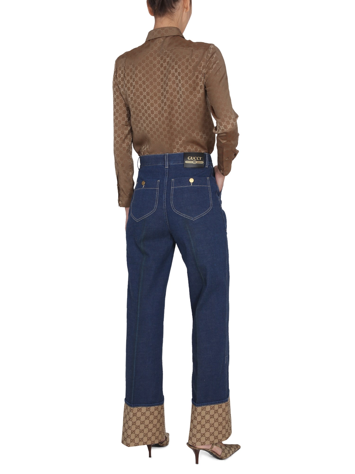 Tessuto di culto, il denim continua a essere riscoperto in ogni collezione attraverso l'esplorazione di silhouette, finiture e combinazioni diverse. Questo paio di jeans interpreta lo spirito di sperimentazione abbinando un taglio di ispirazione anni '70 a simboli del patrimonio della Maison.
