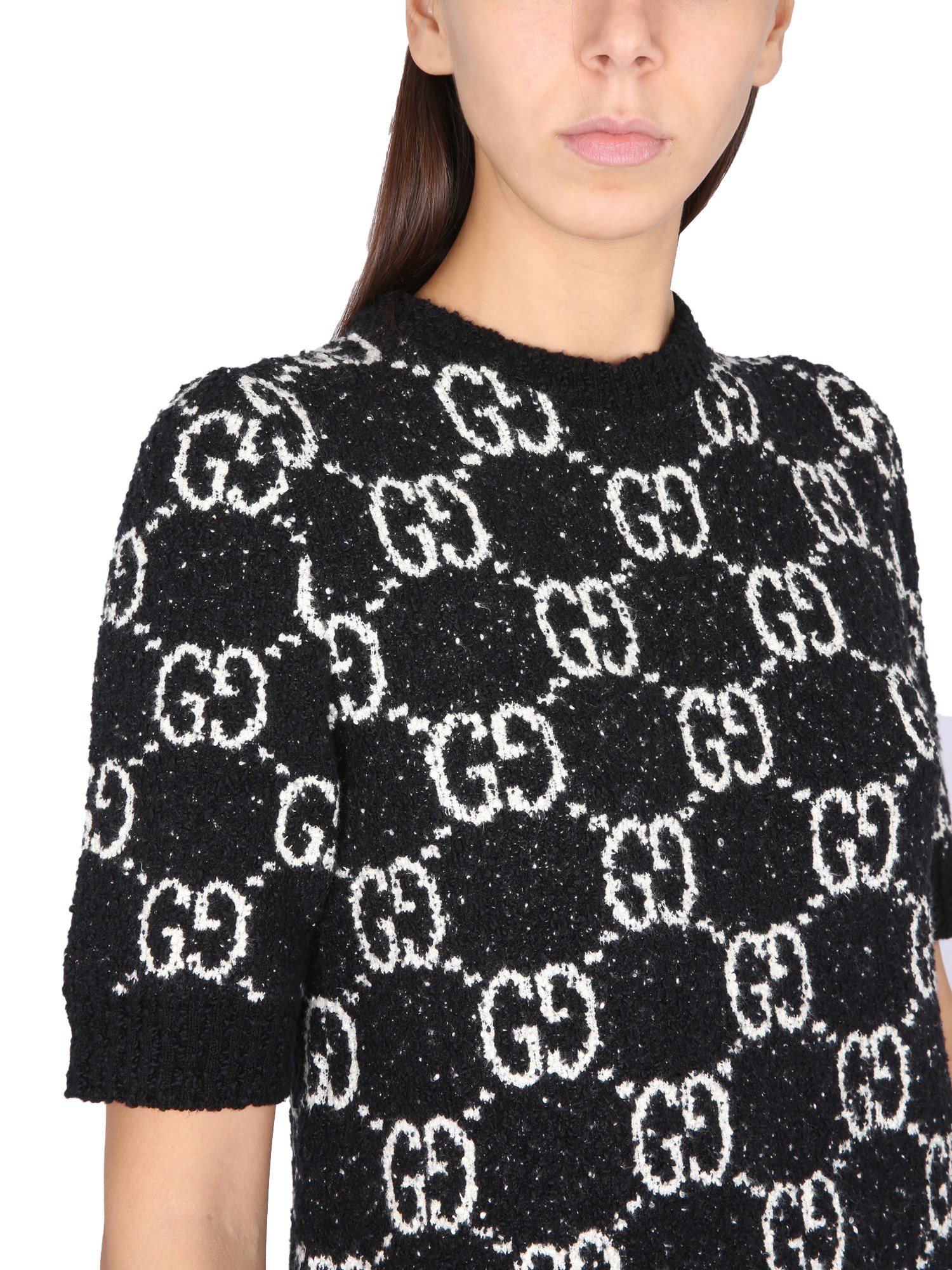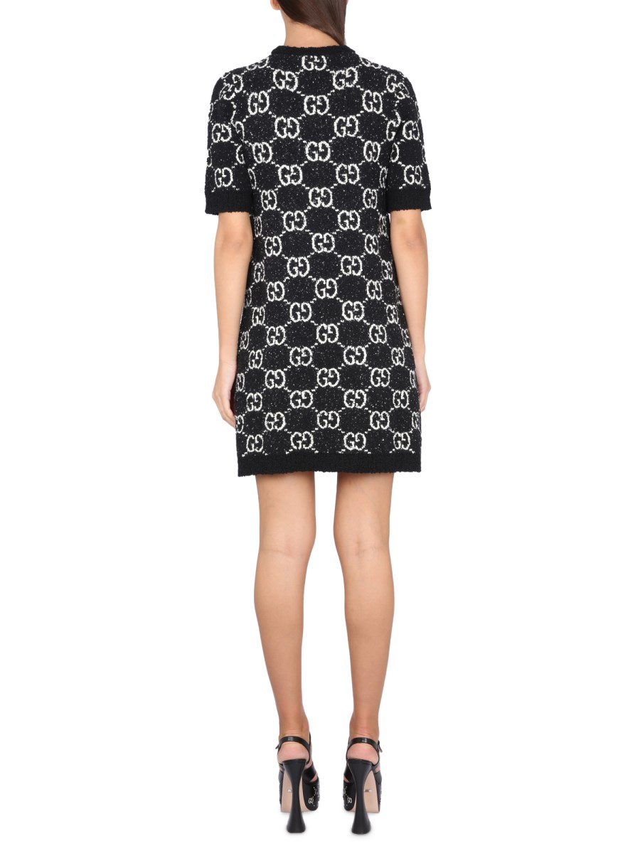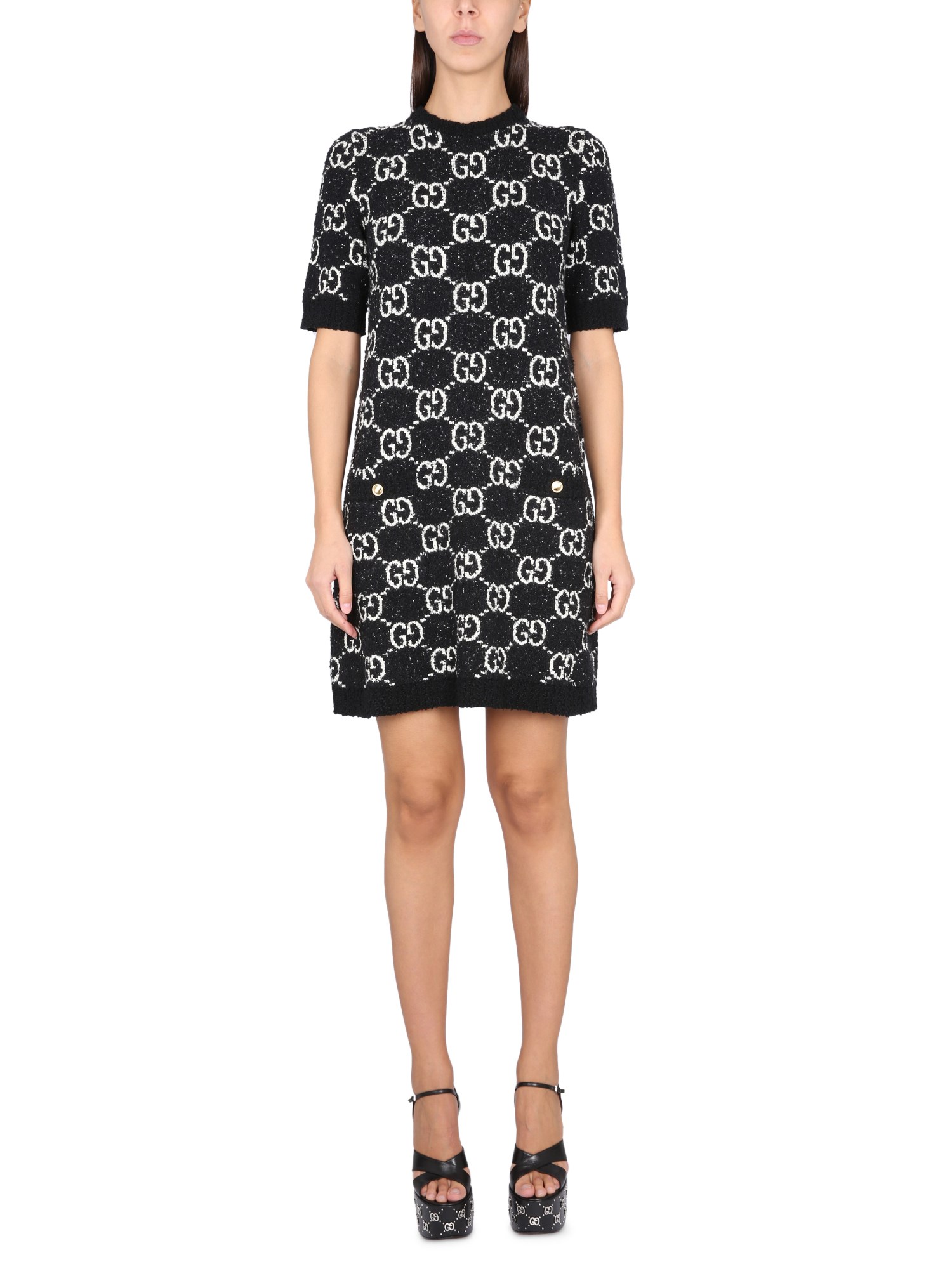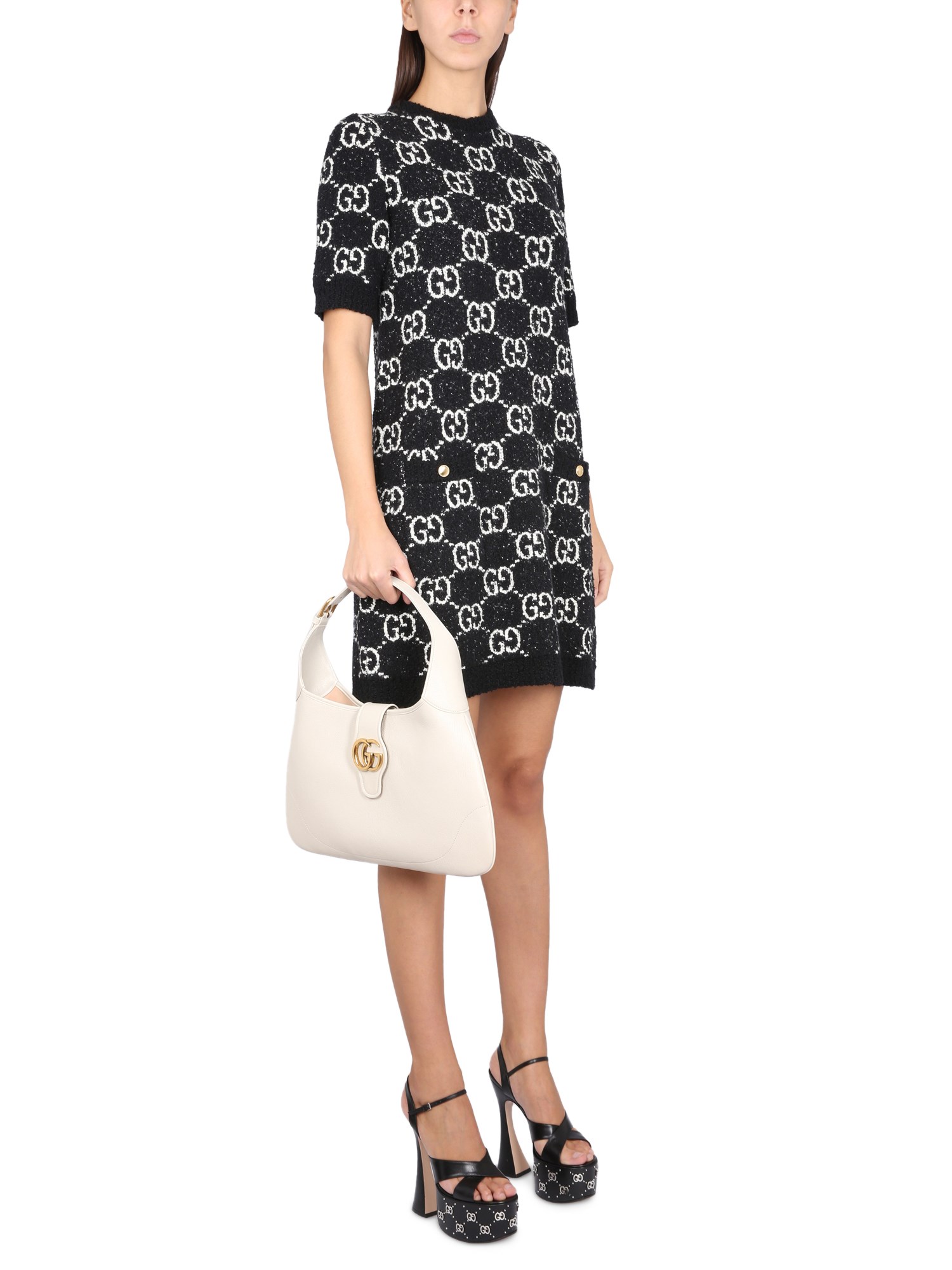 La collezione Cruise 2023 Gucci Cosmogonie è stata presentata sullo sfondo dello storico Castel del Monte in Italia. La sfilata ha riunito estetiche di epoche e geografie lontane, collegando elementi del passato con il presente. Questo abito presenta il jacquard GG in una silhouette essenziale e in un colore neutro, e può essere abbinato senza problemi al resto della collezione.