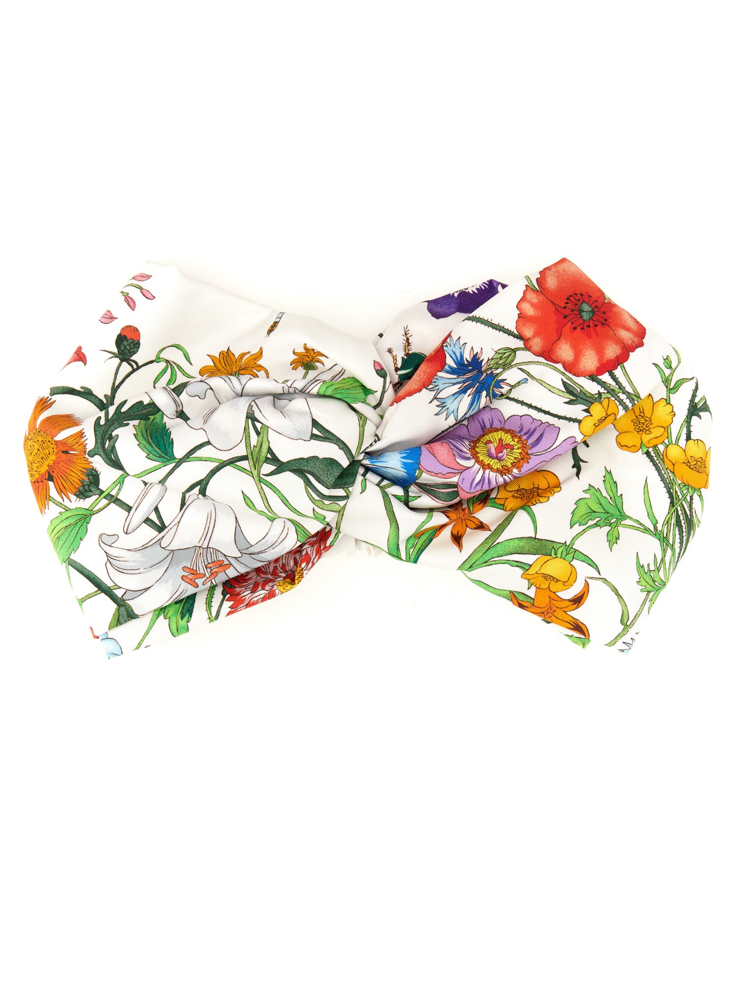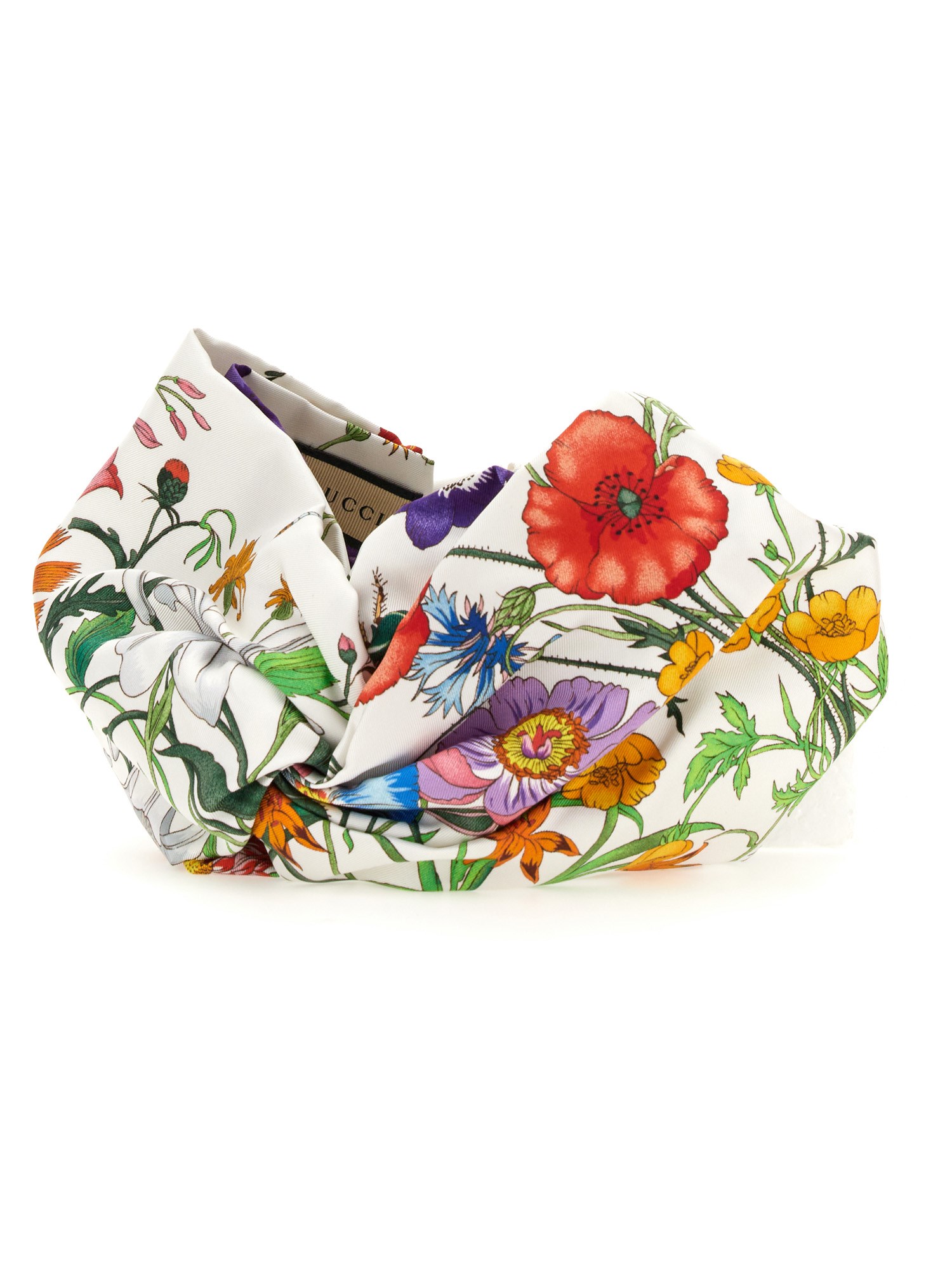 La storica stampa Flora continua a raccontare le collezioni, impregnando ogni selezione di un'atmosfera romantica. Disegnata originariamente dall'artista Vittorio Accornero negli anni Sessanta, viene qui riproposta in una cascata di fiori colorati in tonalità vivaci a contrasto, in cima a questa fascia di seta bianca.