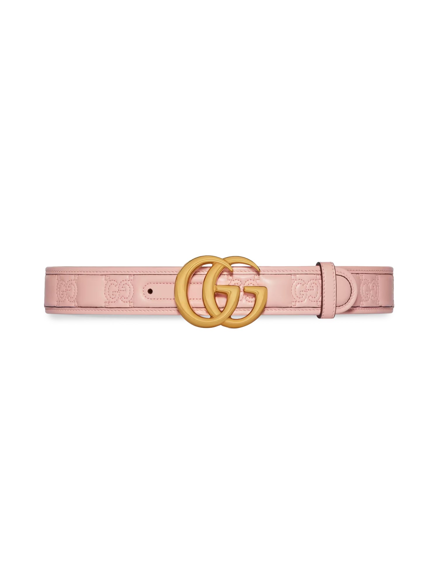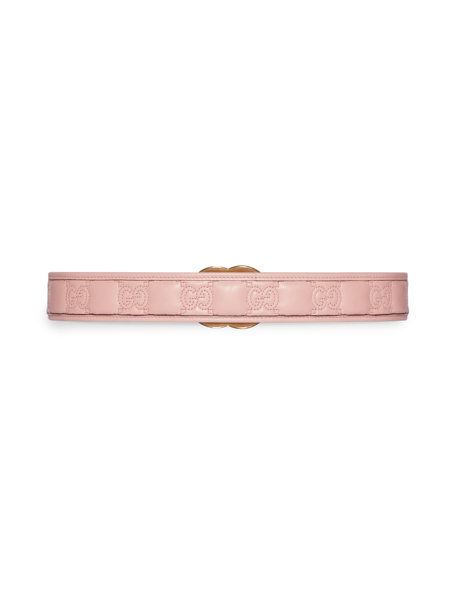 Ogni stagione il logo della Maison si evolve in modi sempre nuovi e creativi. In questo caso, il motivo GG decora questa cintura in pelle matelassé, sormontata da una metalleria Double G. Questa cintura GG Marmont è realizzata in pelle rosa chiaro.
