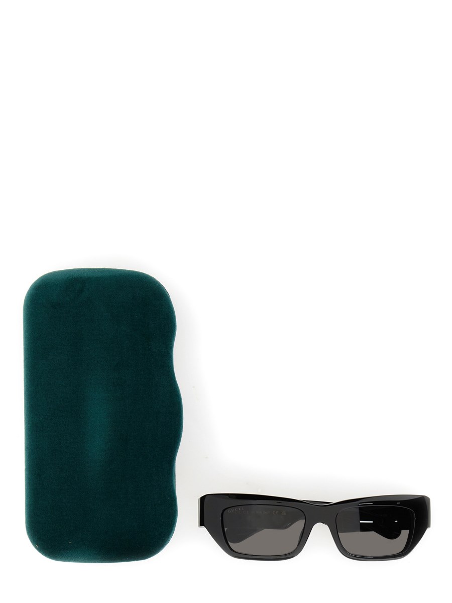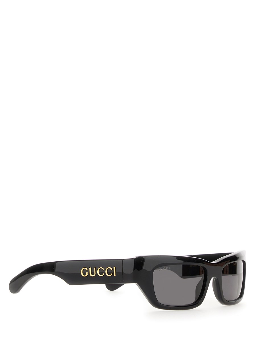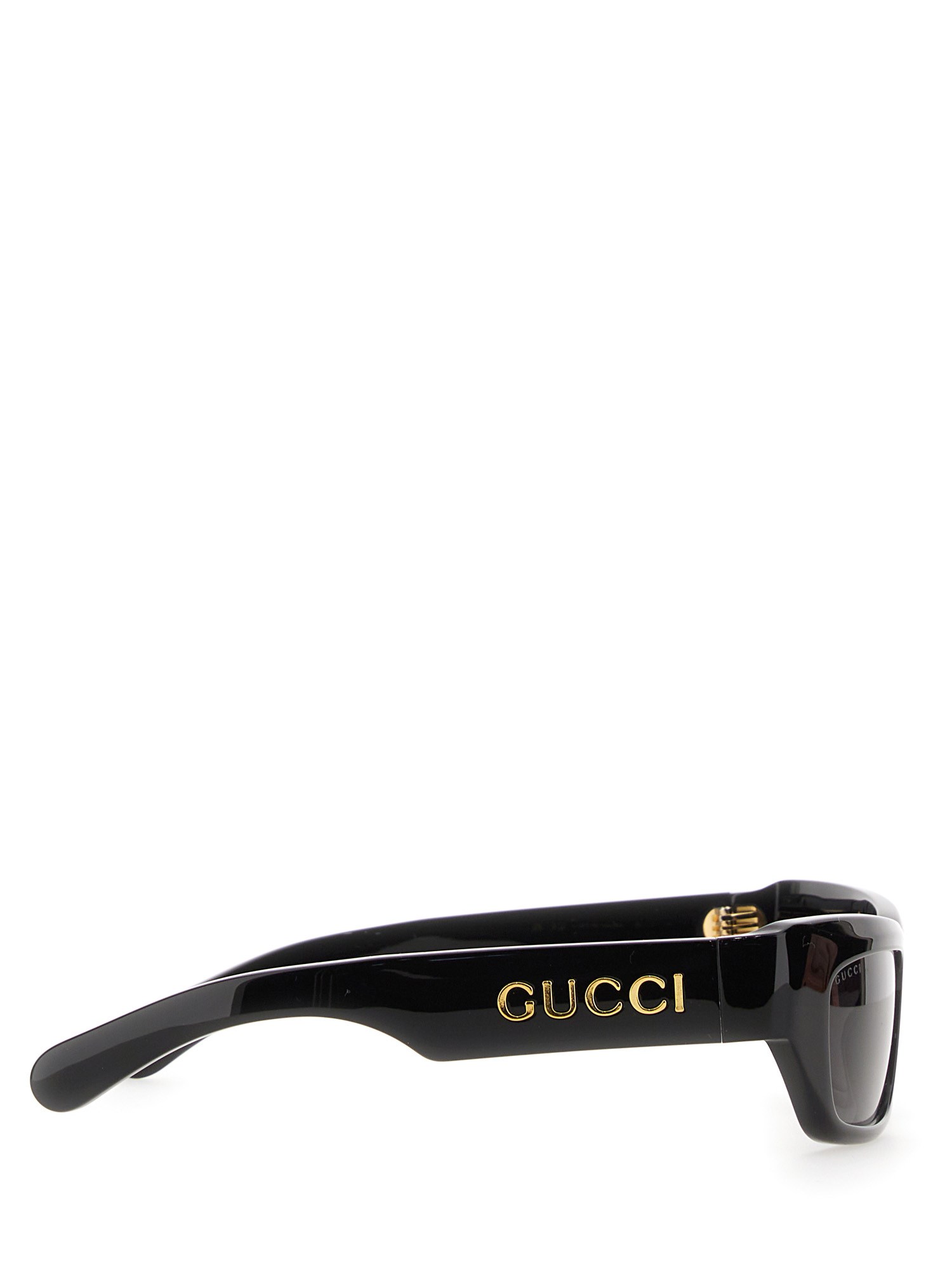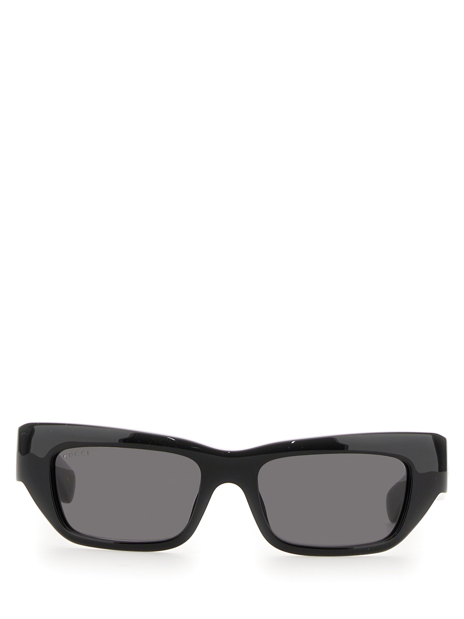 Gli stili classici continuano a essere reinterpretati in modo creativo nelle collezioni Gucci. In questo caso, le sottili lenti rettangolari sono messe in risalto da un'audace montatura in acetato nero. Una lente grigia completa il design, mentre la scritta Gucci decora le aste: un sottile richiamo alla Maison.