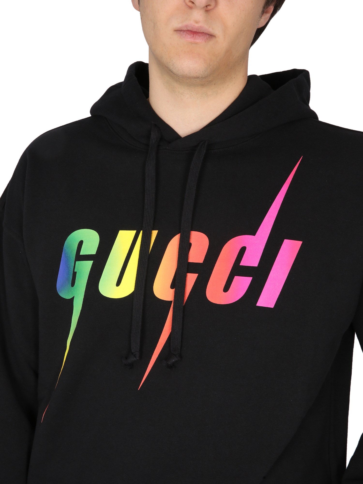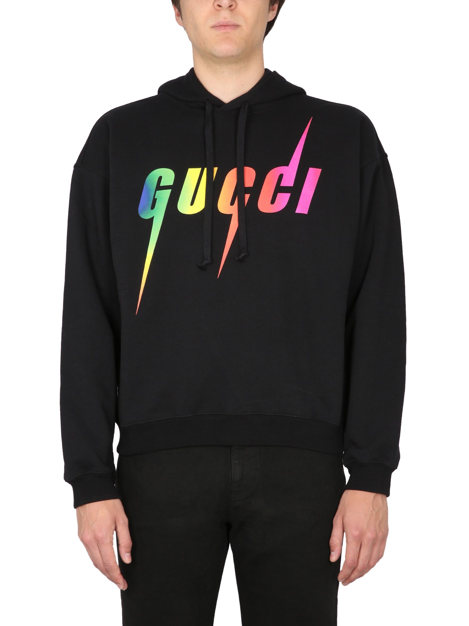 Realizzata in jersey di cotone infeltrito, questa felpa presenta la stampa Gucci Blade, un motivo ricorrente presentato in tonalità multicolore. Il cappuccio fisso con coulisse completa lo stile.