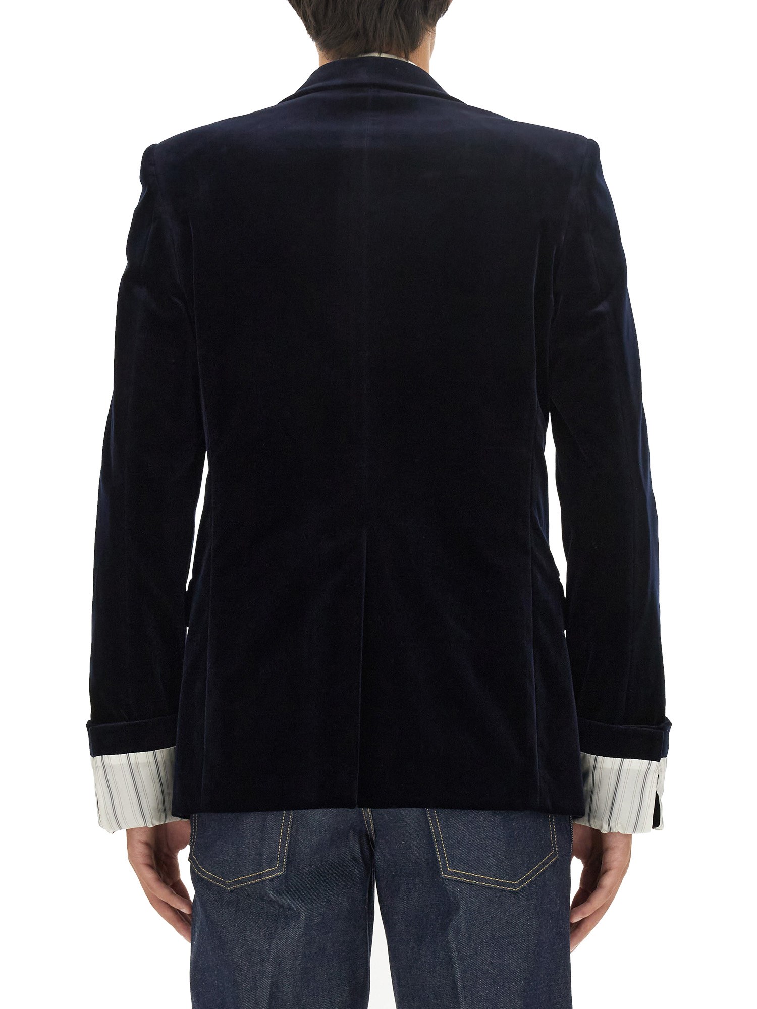 La collezione maschile di questa stagione introduce un nuovo concetto di sartoria, con una silhouette fluida accentuata da elementi strutturati come le maniche a polsino e le maniche staccabili. Realizzata in velluto di cotone elasticizzato blu scuro, questa giacca monopetto è arricchita da bottoni con stemma dorati.