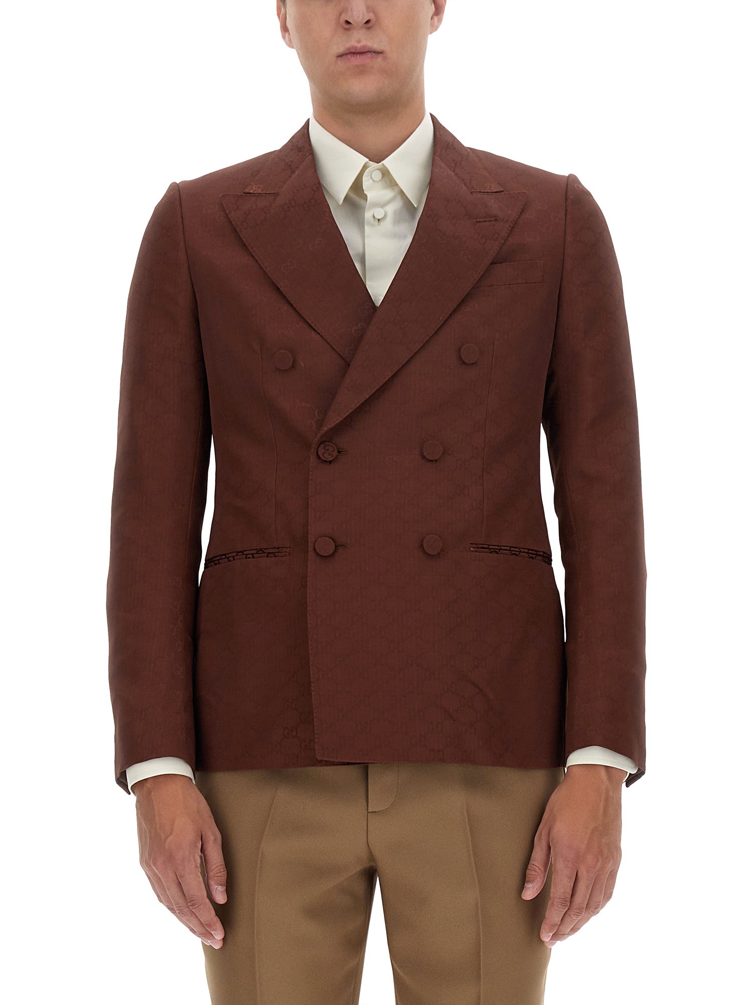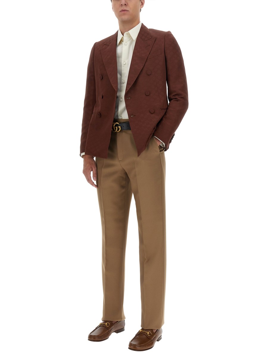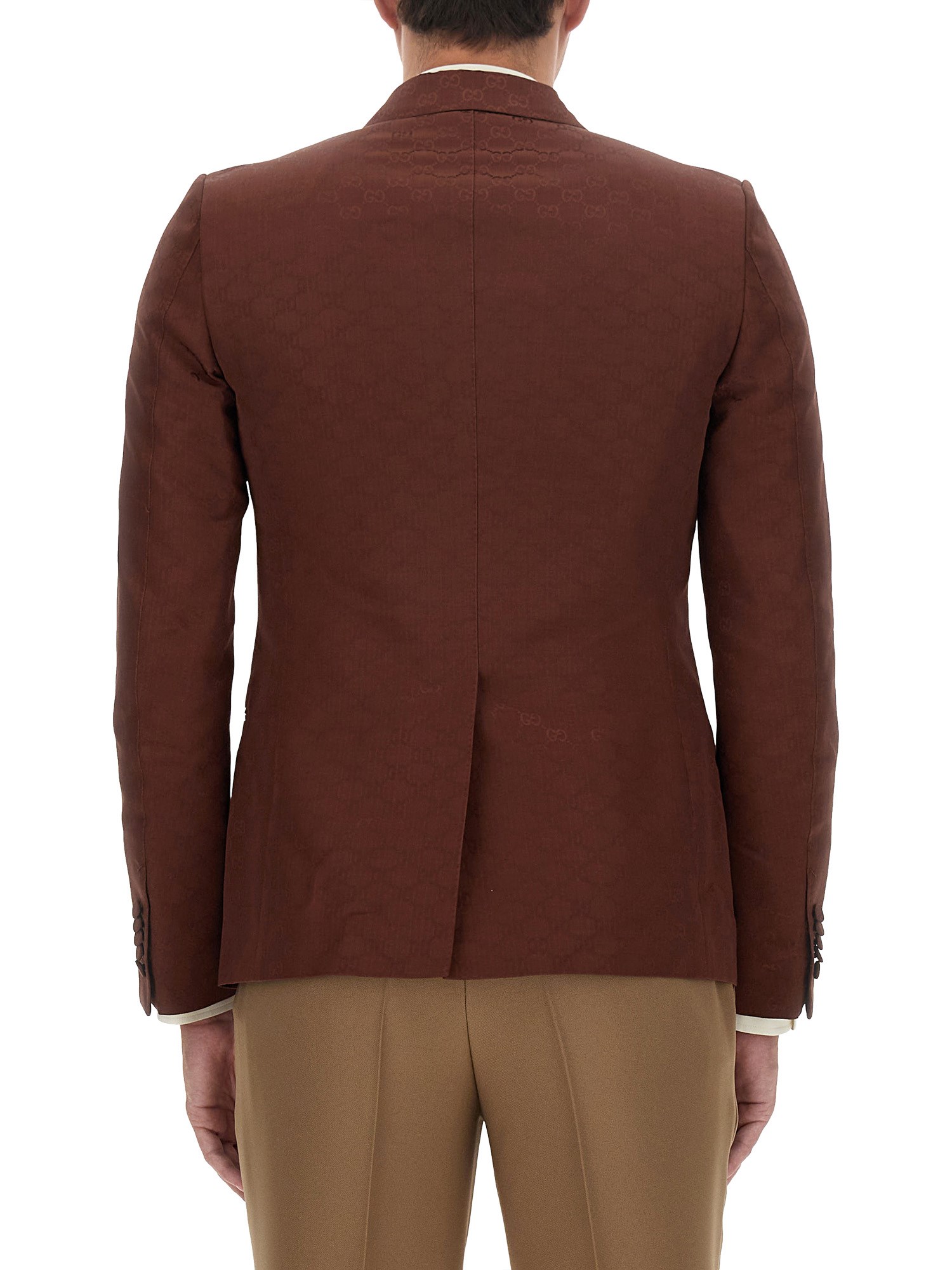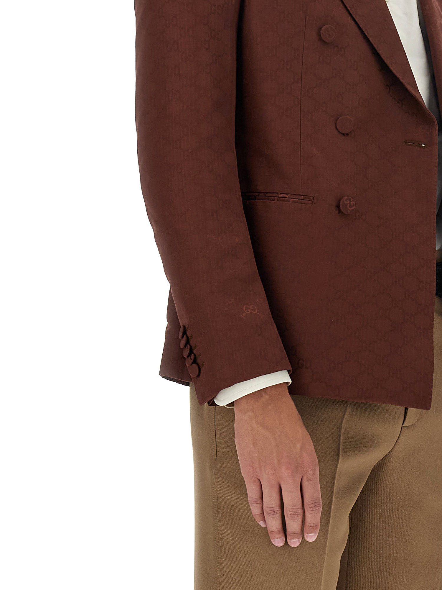 In un gioco di texture e applicazioni, i motivi più iconici della Maison arricchiscono i modelli ready-to-wear della collezione Pre-Fall 2023. L'intramontabile monogramma di Gucci è qui presentato su una leggera base di tela di cotone marrone, che conferisce alla silhouette strutturata un tocco sofisticato e moderno.