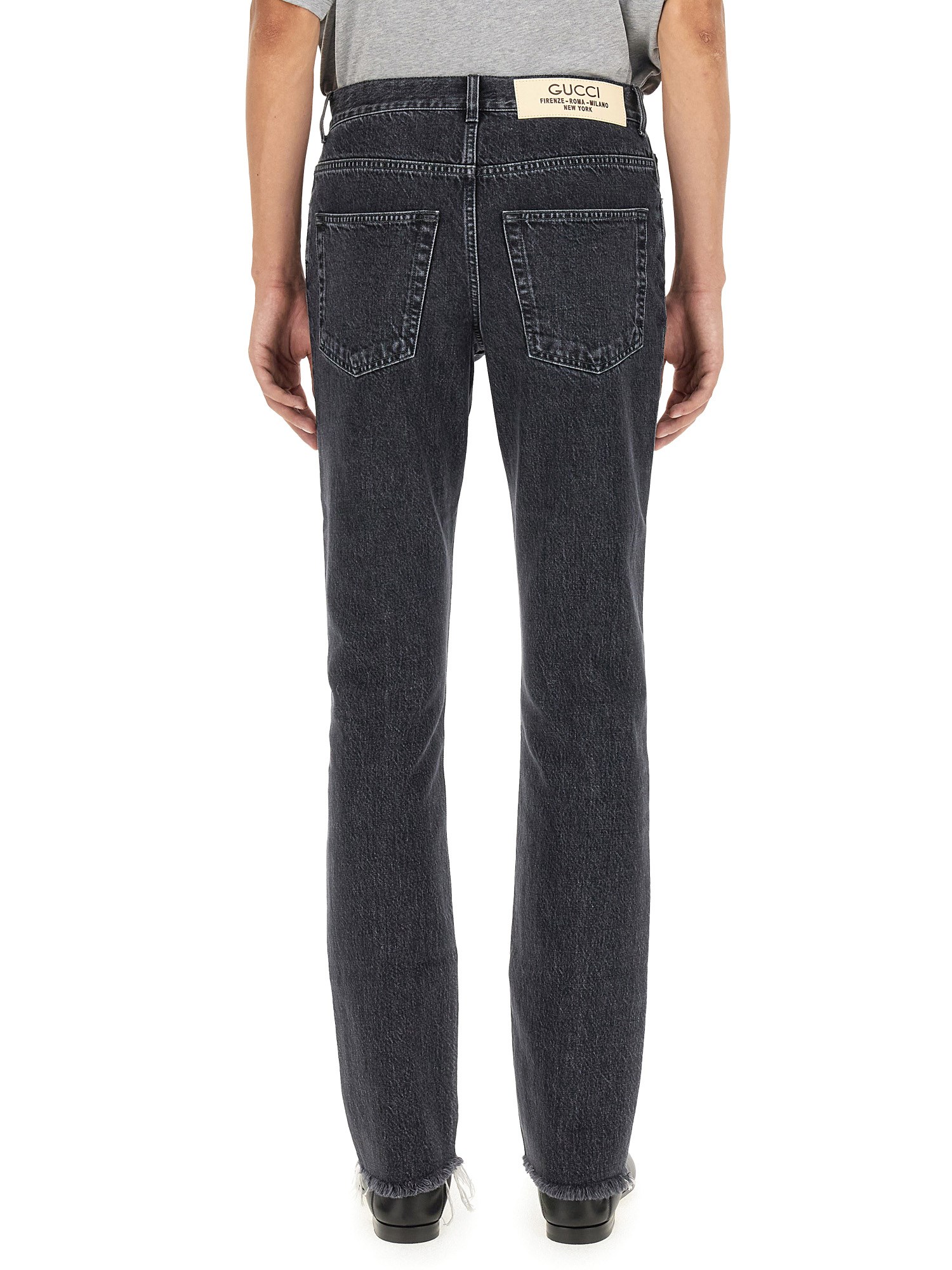 Sfumando il confine tra abbigliamento formale e casual, i nuovi modelli di denim sono presentati in lavaggi e texture distinte, parte integrante del nuovo concetto di sartoria. Questo pantalone in denim nero presenta un orlo a taglio vivo e l'etichetta Gucci cities sul retro.