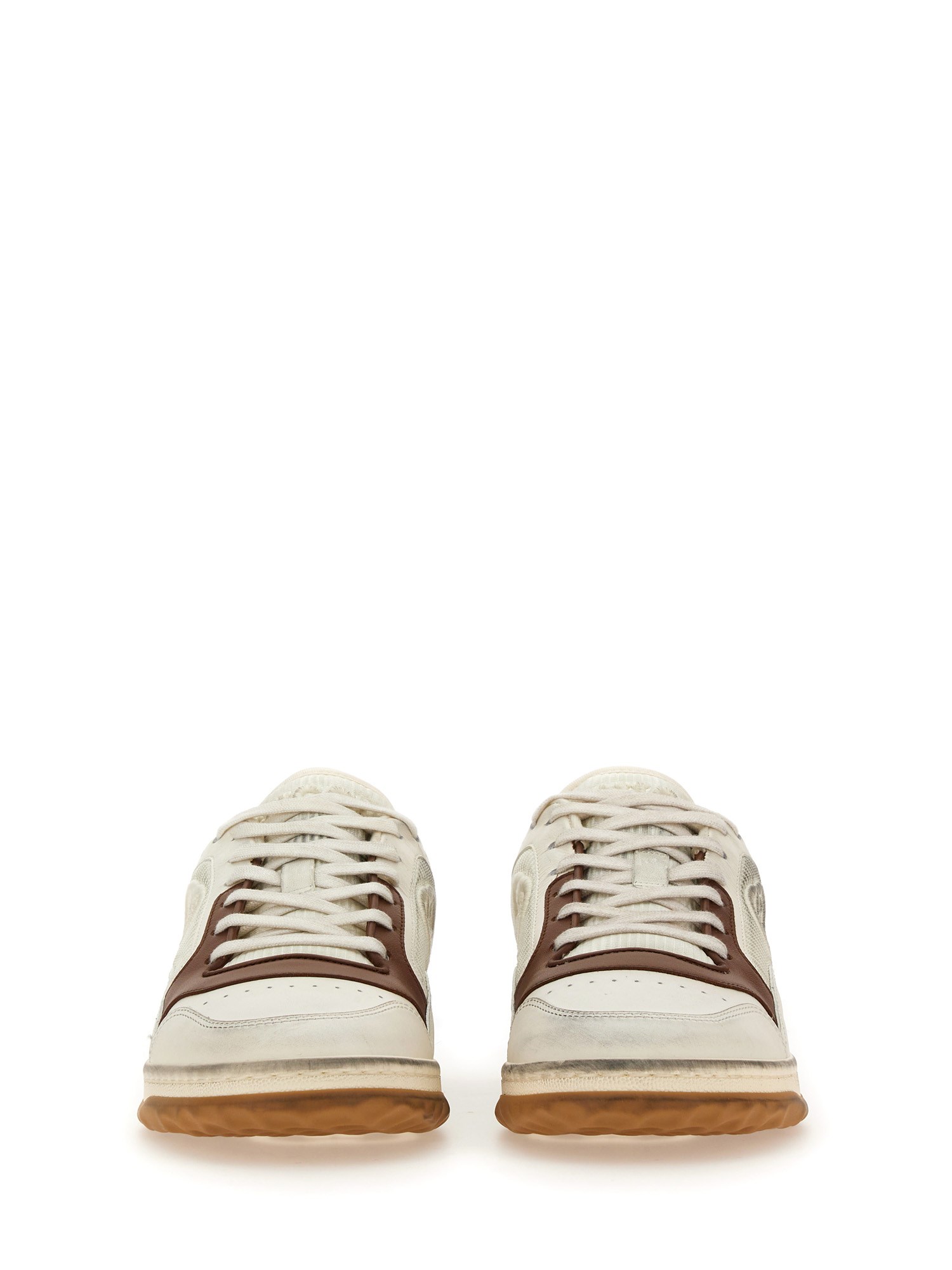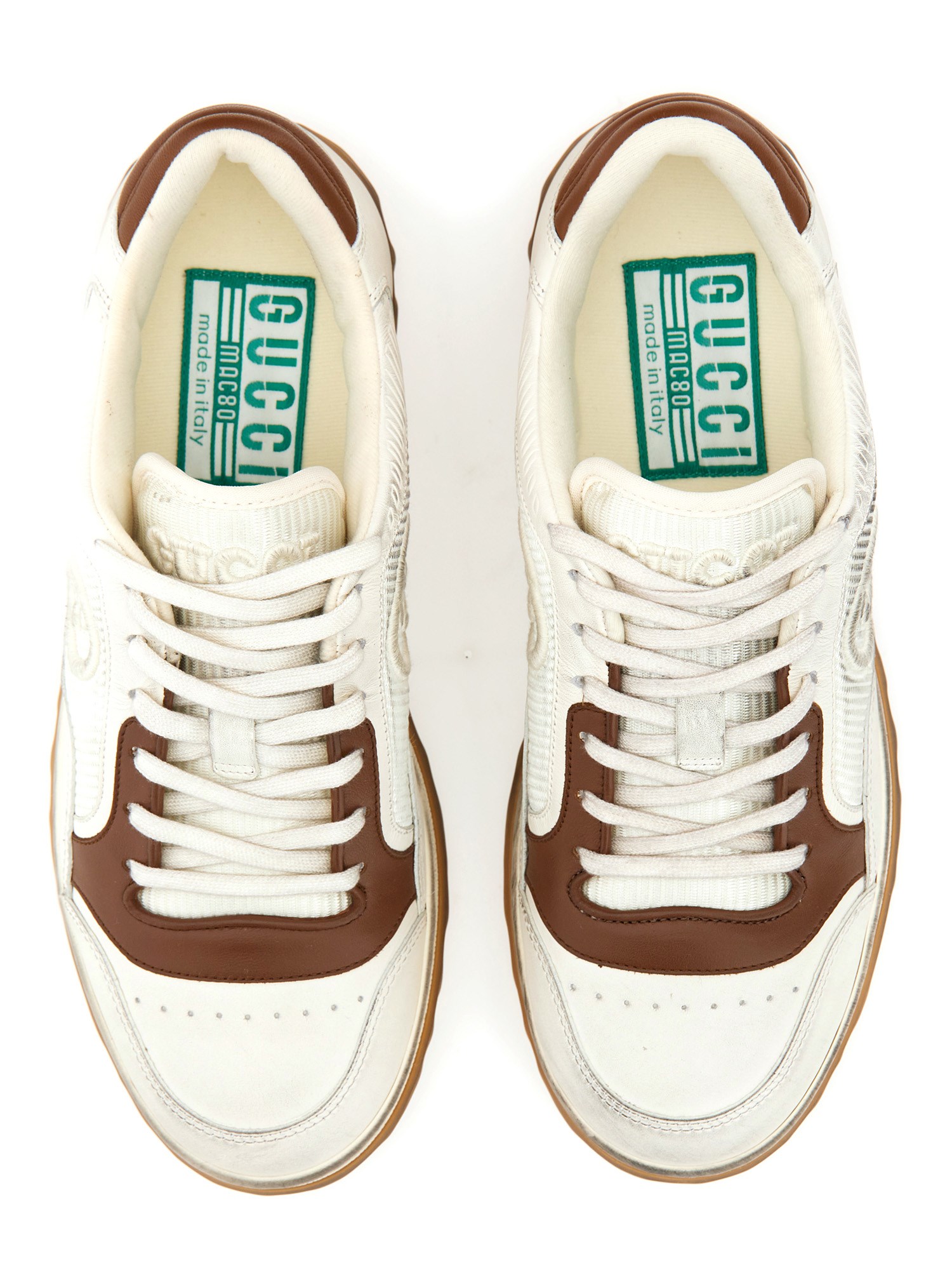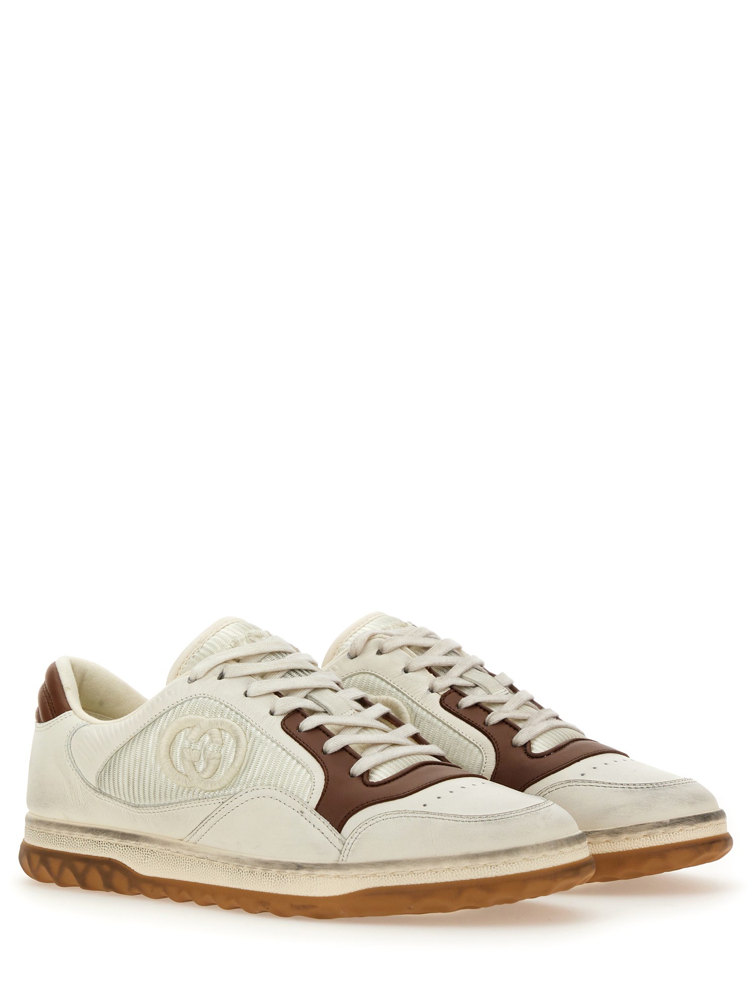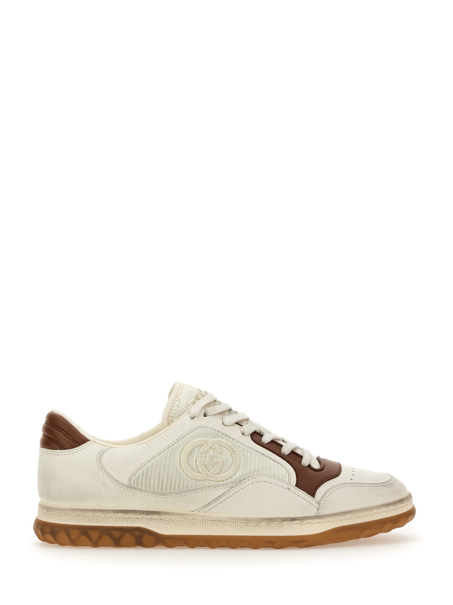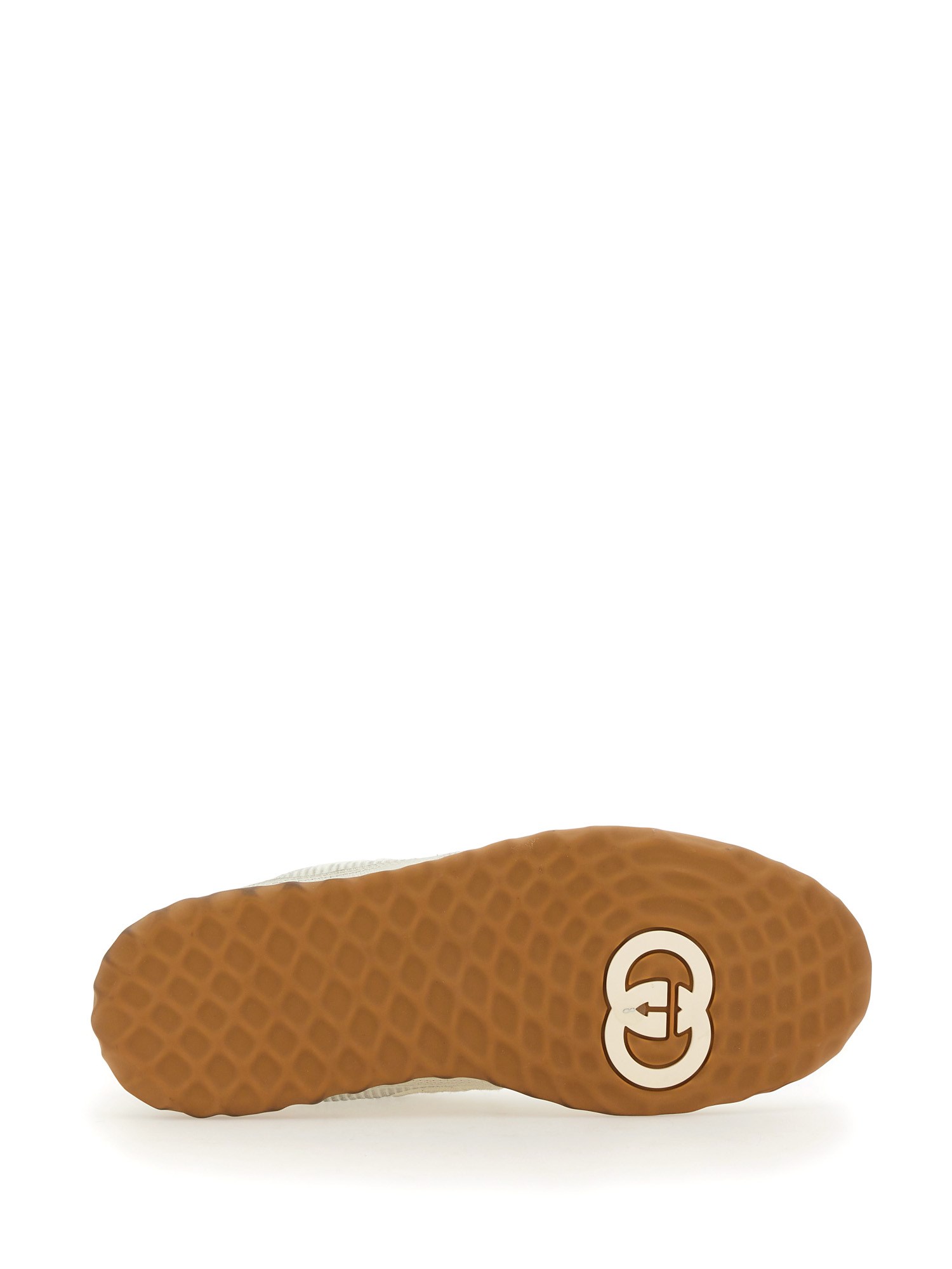 Una discreta G a incastro parla della sottile narrazione che attraversa la collezione. Presentato in pelle bianca, il motivo mette in risalto il logo della Maison in questo modello di trainer di ispirazione rétro.