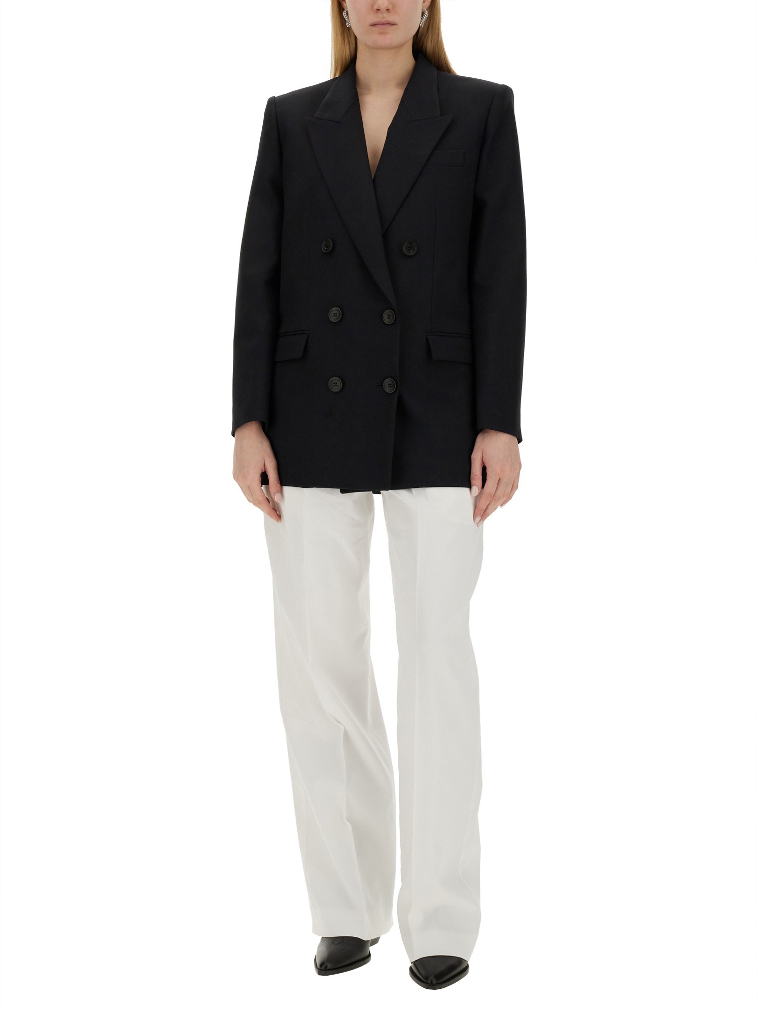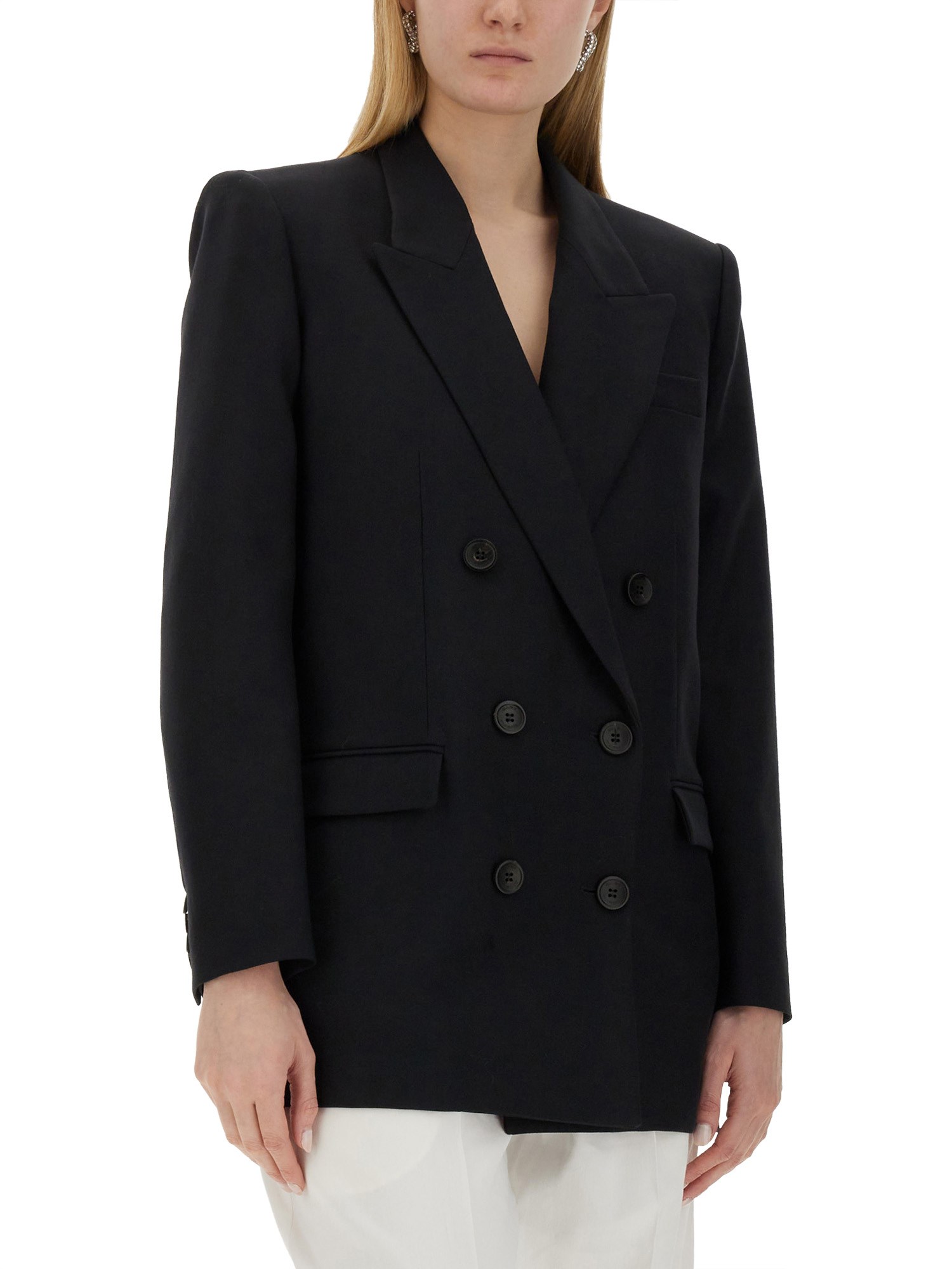 Elevate il vostro guardaroba con questa sofisticata giacca doppiopetto in lana vergine nera di Isabel Marant. Realizzato con i migliori materiali, questo capo senza tempo emana eleganza e stile. Il design a doppio petto aggiunge un tocco di fascino classico, mentre la lana vergine di alta qualità assicura calore e comfort. Perfetta sia per le occasioni formali che per quelle casual, questa giacca è un'aggiunta versatile alla collezione di ogni individuo alla moda.