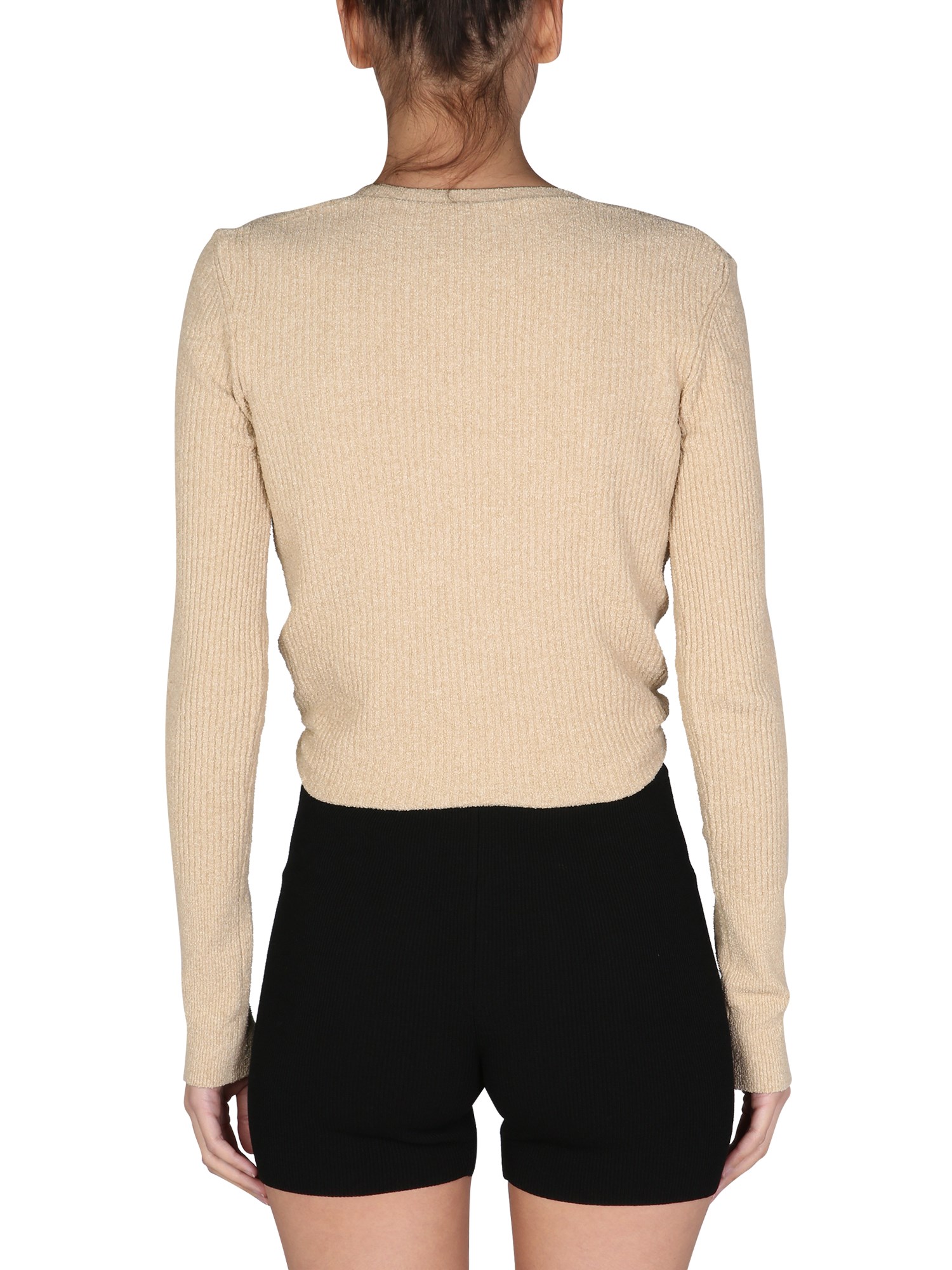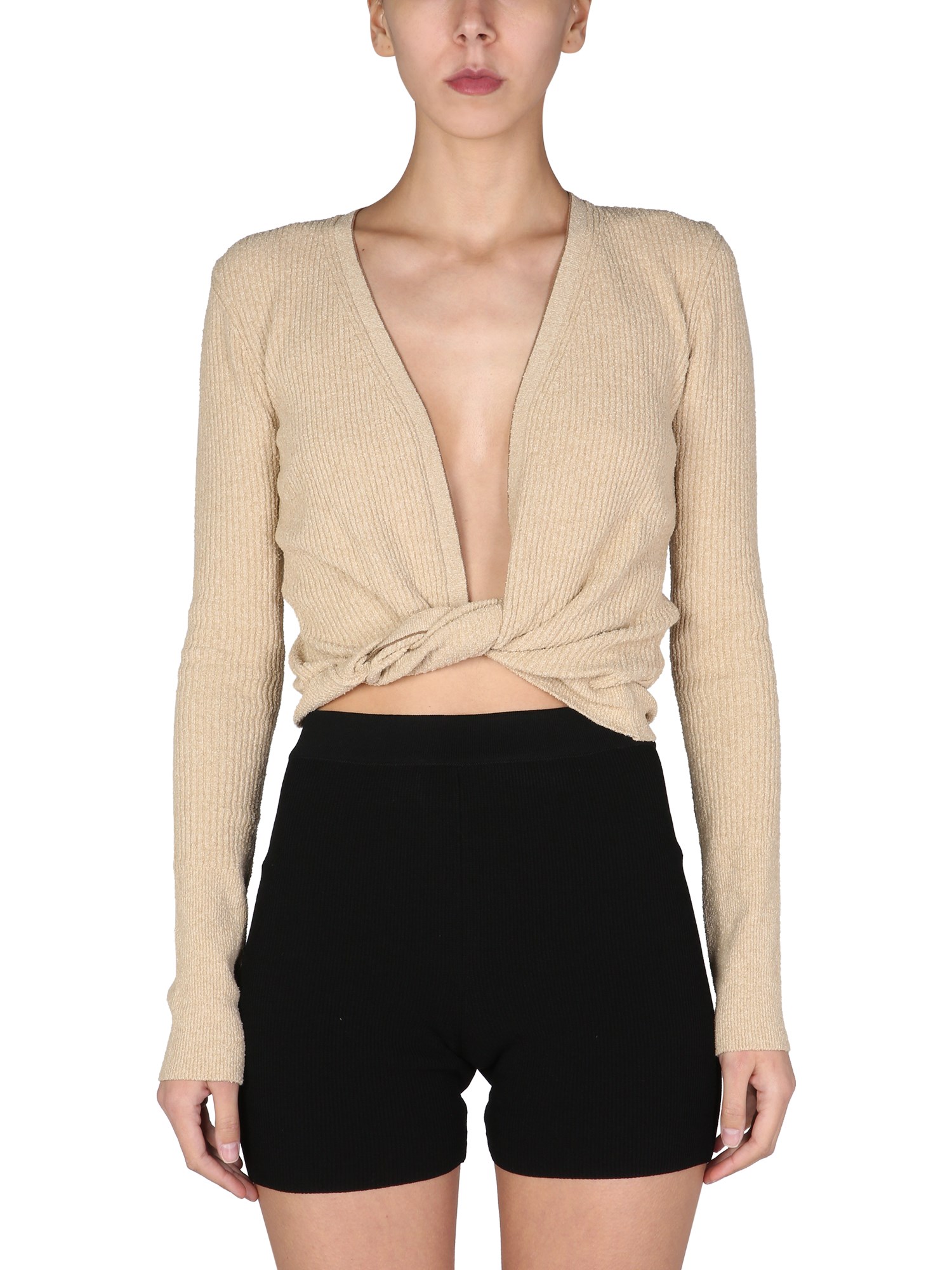 - SCOLLO TONDO- PROFILI A CONTRASTO- ORLO CON NODO- 75% COTONE, 25% POLIAMMIDE- MADE IN ITALY- LA MODELLA É ALTA 180 CM E INDOSSA LA TAGLIA 38 FR
