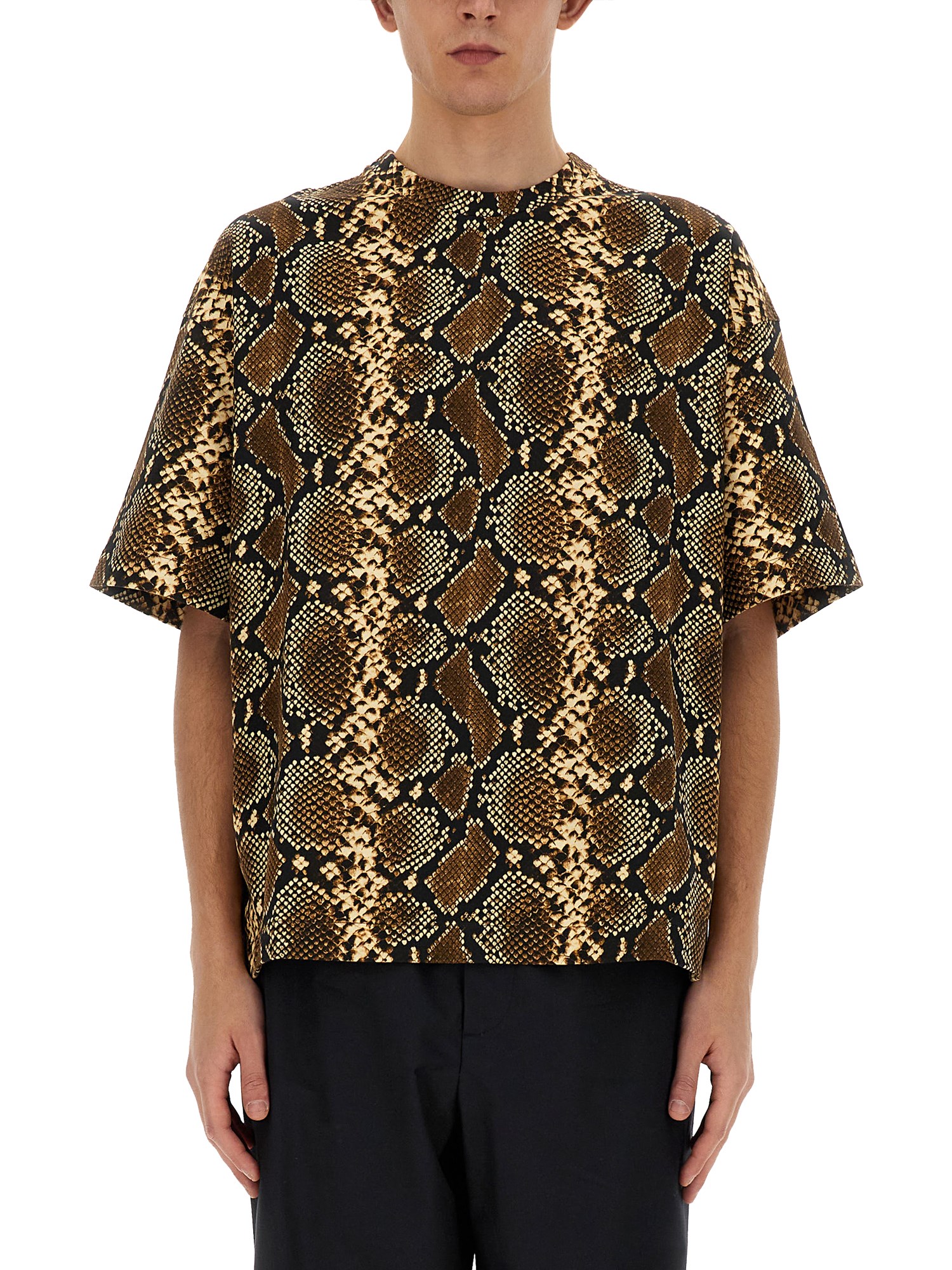 Questa T-shirt a girocollo di Jil Sander presenta un'elegante fantasia animalier che aggiunge un tocco divertente e trendy al vostro guardaroba casual. Realizzata con materiali di alta qualità, questa maglietta è comoda da indossare e facile da abbinare in ogni occasione. Il design a girocollo offre un look classico che si abbina bene a jeans o pantaloncini, rendendola un capo versatile da indossare tutti i giorni. Aggiornate il vostro guardaroba con questa maglietta alla moda e dall'accattivante motivo animalier.