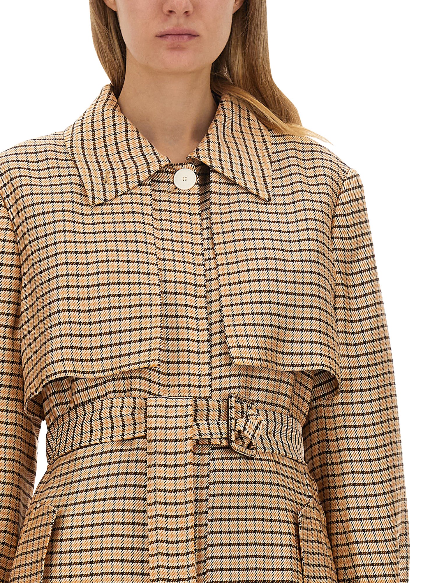 Questo trench a quadri è dotato di patta antibufera, cintura in vita e pratiche tasche applicate sui lati. Le finiture ad orlo vivo aggiungono un tocco unico, mentre la cintura rimovibile con fibbia coperta aumenta la versatilità. Il cappotto è progettato con uno spacco centrale sul retro per facilitare i movimenti.