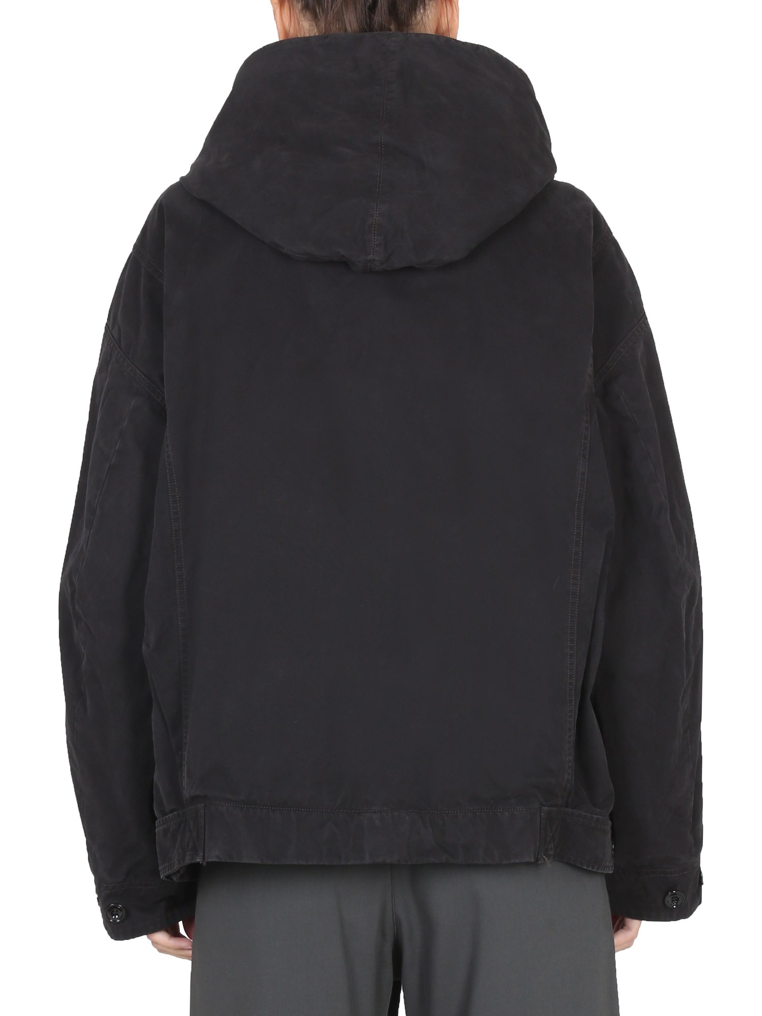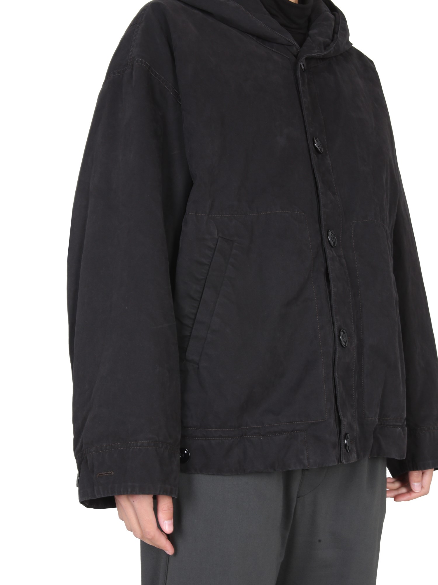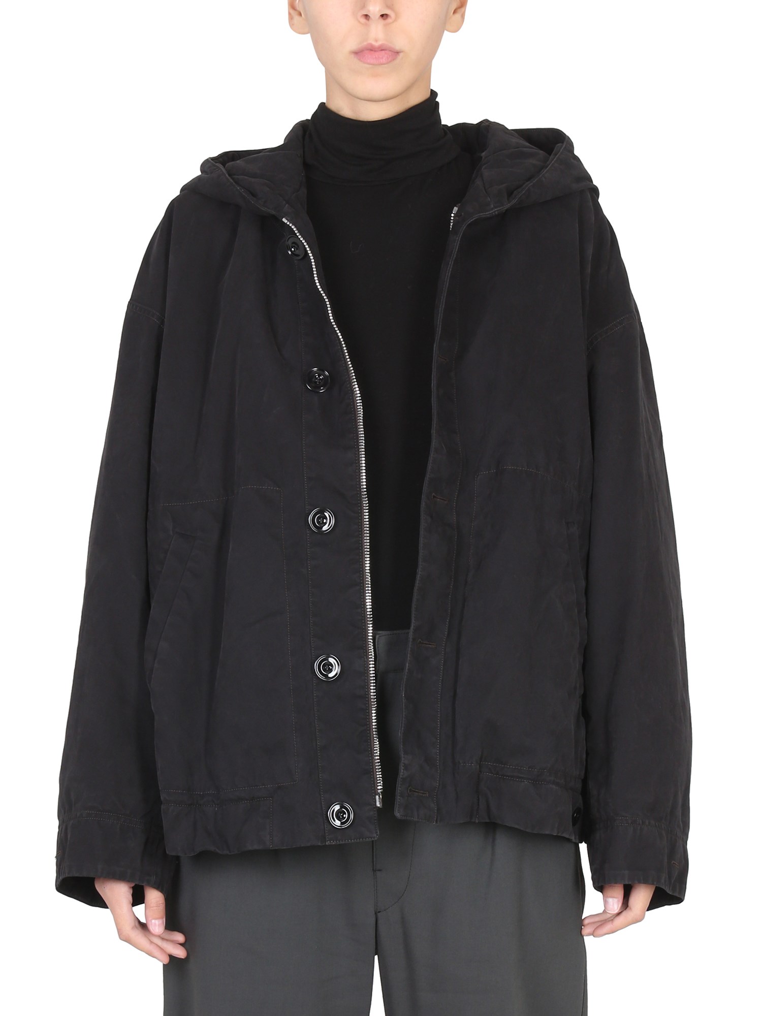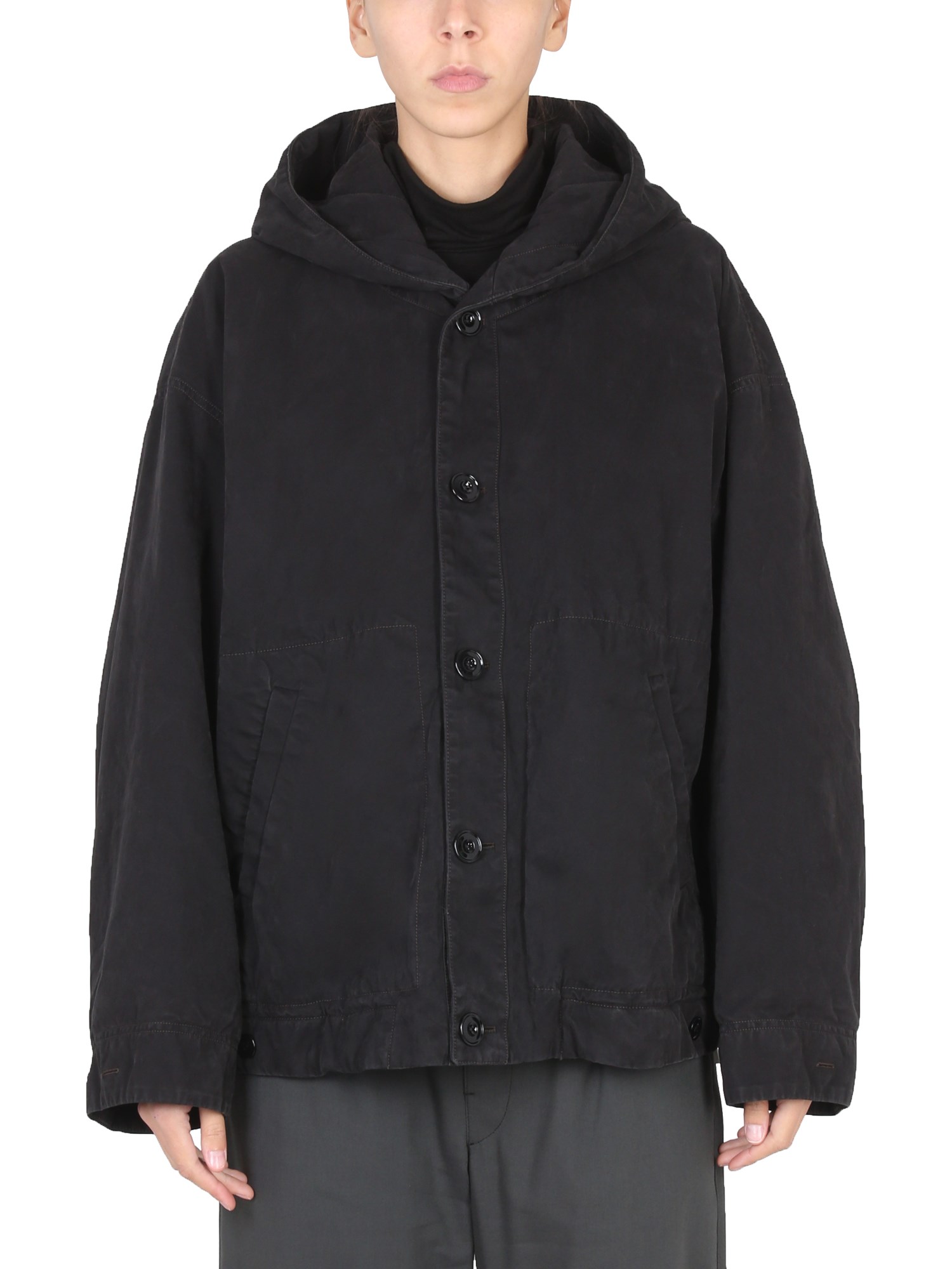 La giacca con cappuccio della maison Lemaire è una giacca leggera dotata di cappuccio con coulisse. La giacca è sufficientemente calda da essere indossata nelle giornate fredde ed è perfetta per passeggiare in città nelle fresche giornate autunnali e invernali. La giacca ha una chiusura a bottoni e due tasche laterali.