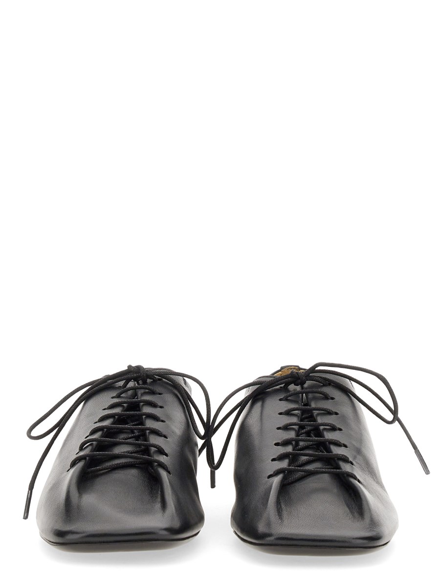 Queste derby sono realizzate in nappa di agnello leggera con una texture morbida e setosa. Sono dotate di lacci in cotone cerato, punte squadrate leggermente arrotondate e tacco piatto. La tomaia e la linguetta delle scarpe nascono da un unico pezzo di pelle ripiegato su se stesso. Sono completamente foderate in pelle.