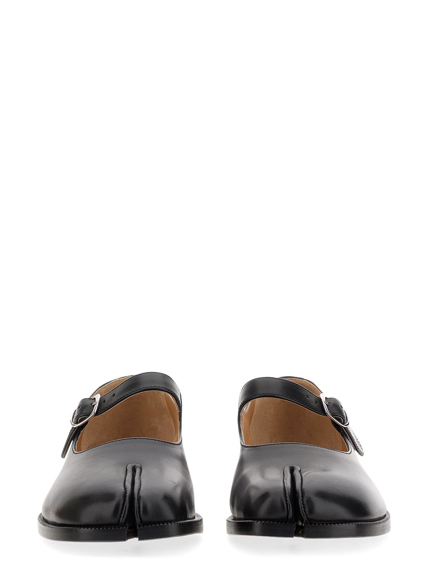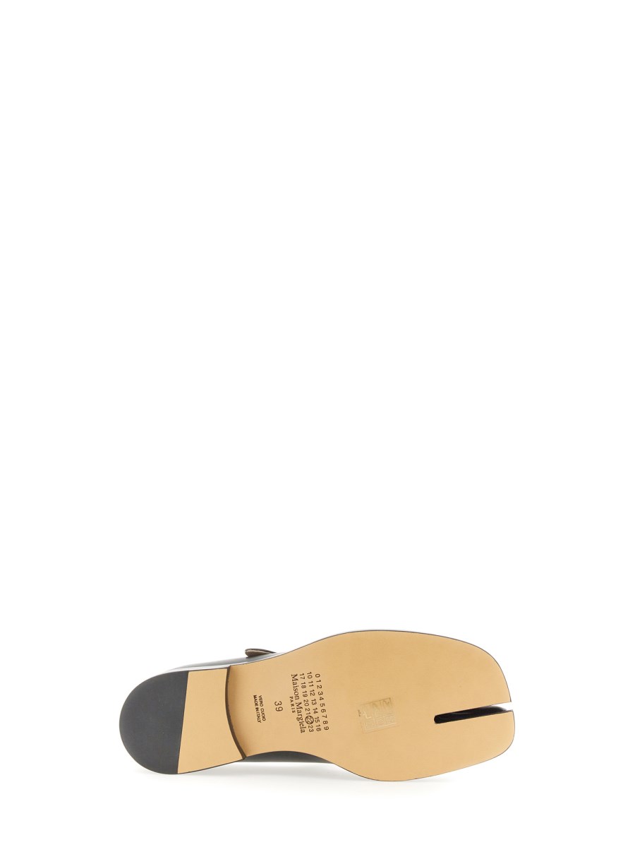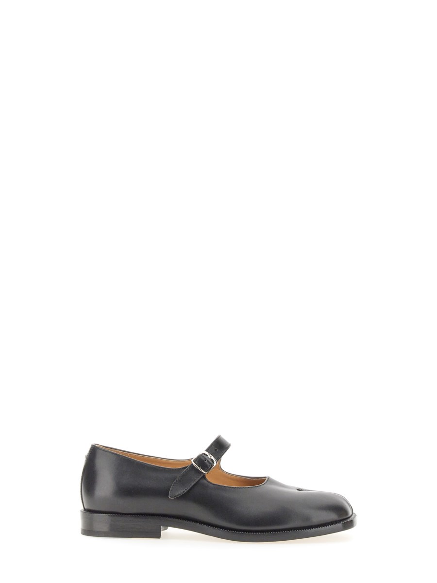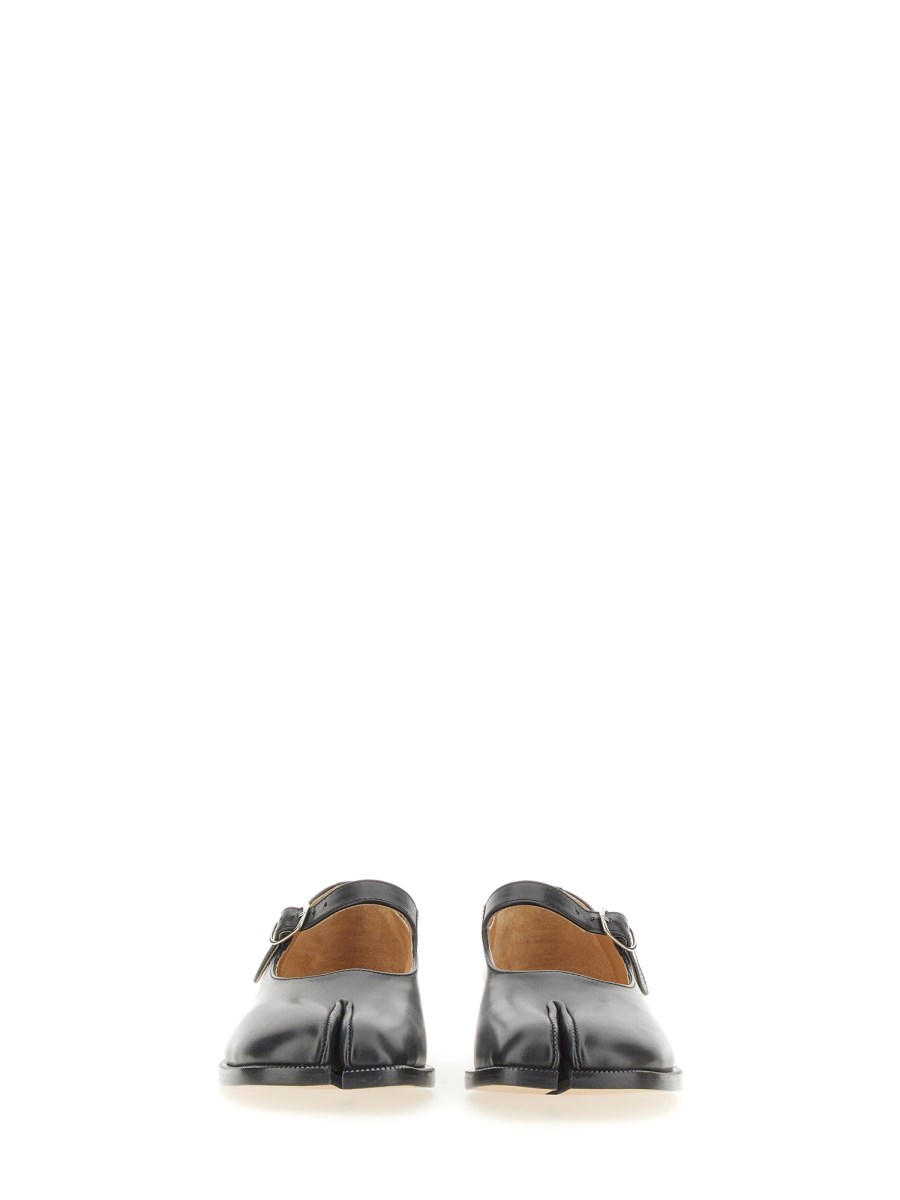 In pelle di vitello con cinturino superiore regolabile, le scarpe Mary-Jane presentano la punta spezzata Tabi, ispirata all'omonimo calzino tradizionale giapponese del XV secolo, lanciato per la prima collezione della Maison nel 1989. Questo modello cattura lo spirito avanguardista e insubordinato della Maison e rappresenta un classico del patrimonio, continuamente esplorato in ogni collezione.