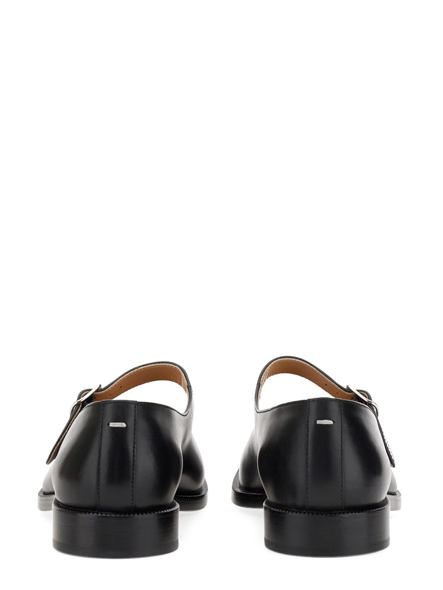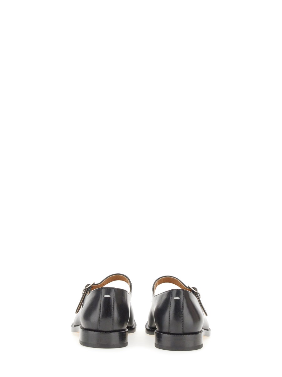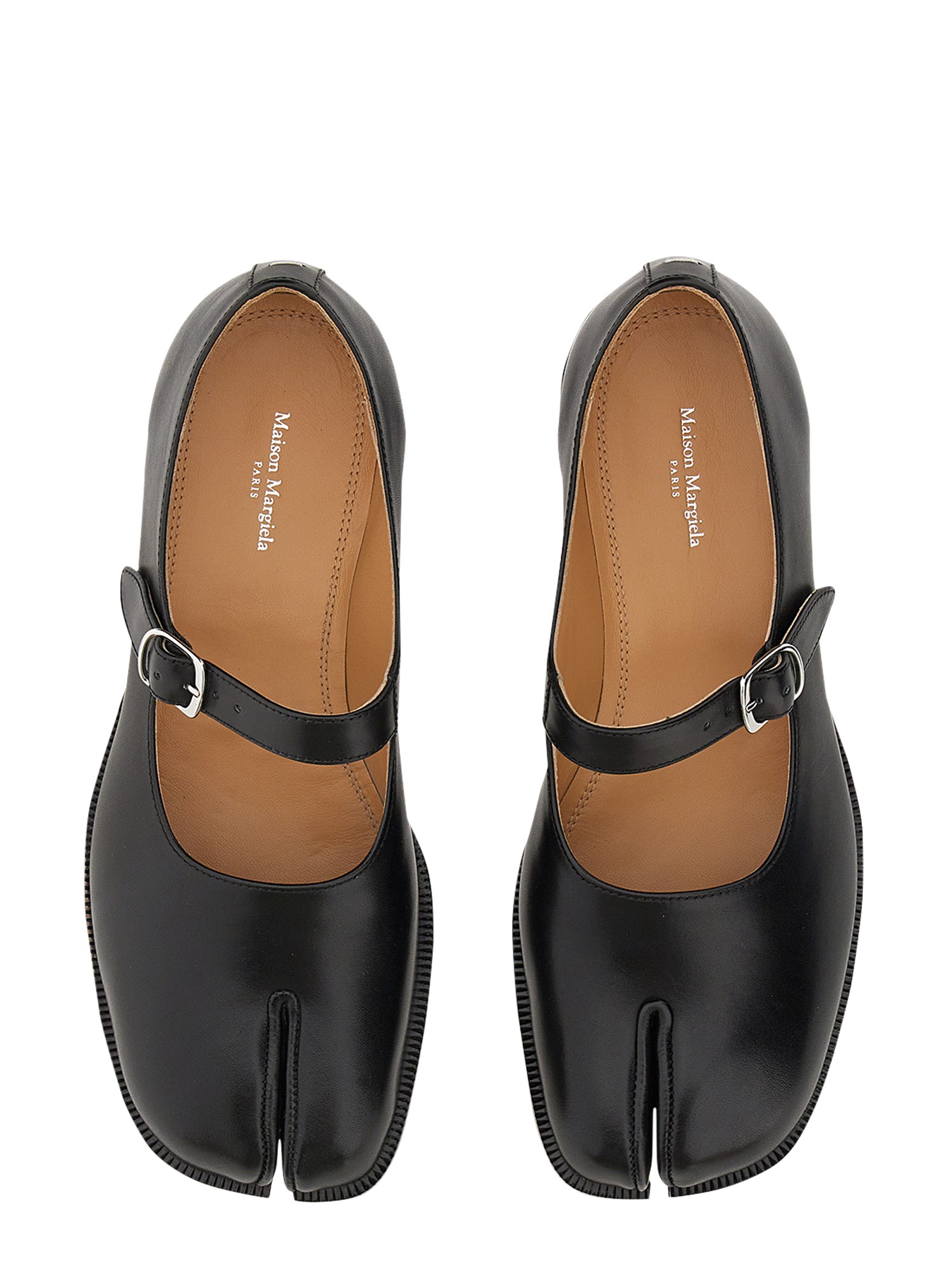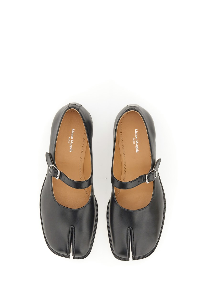 In pelle di vitello con cinturino superiore regolabile, le scarpe Mary-Jane presentano la punta spezzata Tabi, ispirata all'omonimo calzino tradizionale giapponese del XV secolo, lanciato per la prima collezione della Maison nel 1989. Questo modello cattura lo spirito avanguardista e insubordinato della Maison e rappresenta un classico del patrimonio, continuamente esplorato in ogni collezione.