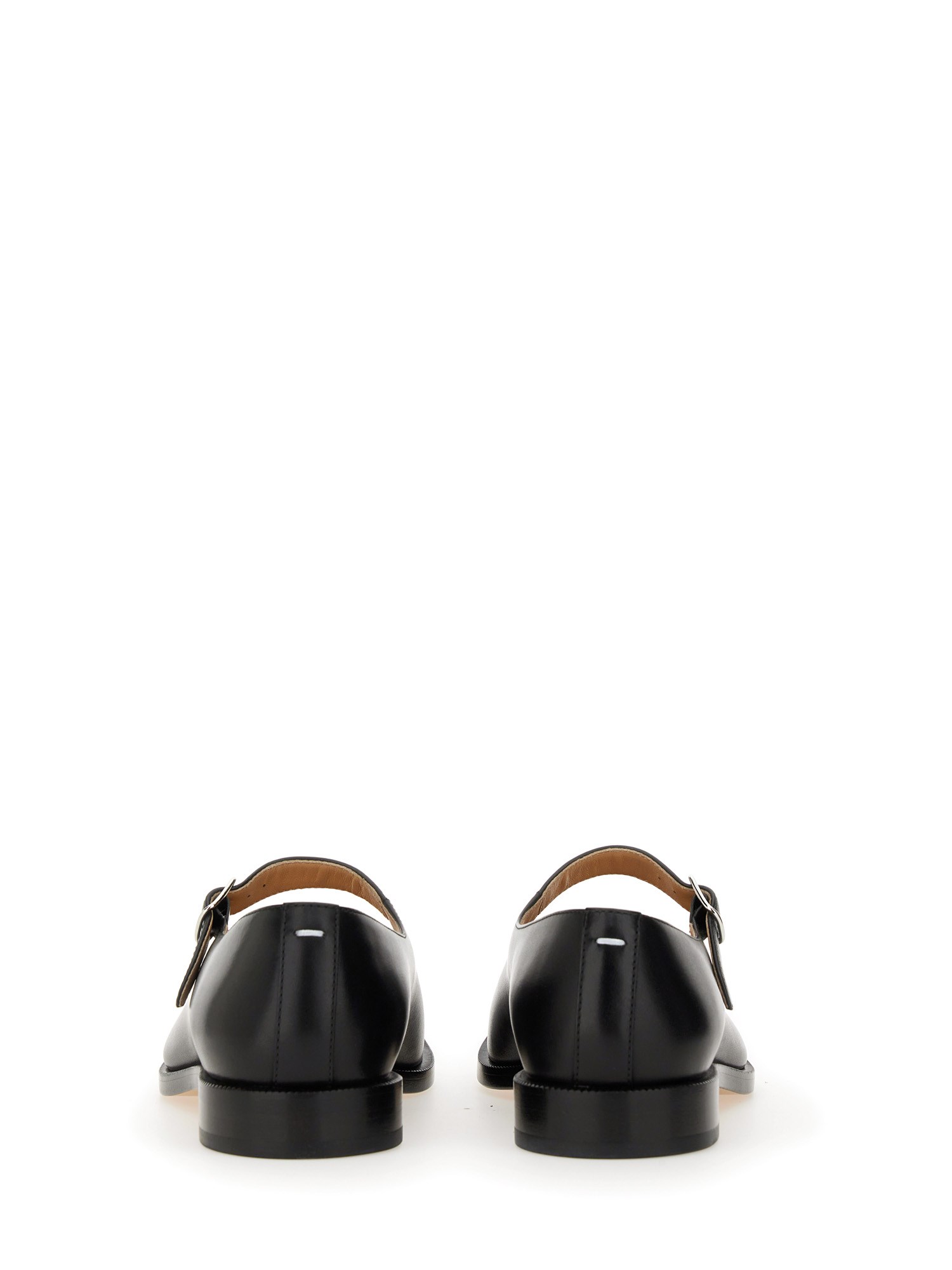 In pelle di vitello con cinturino superiore regolabile, le scarpe Mary-Jane presentano la punta spezzata Tabi, ispirata all'omonimo calzino tradizionale giapponese del XV secolo, lanciato per la prima collezione della Maison nel 1989. Questo modello cattura lo spirito avanguardista e insubordinato della Maison e rappresenta un classico del patrimonio, continuamente esplorato in ogni collezione.