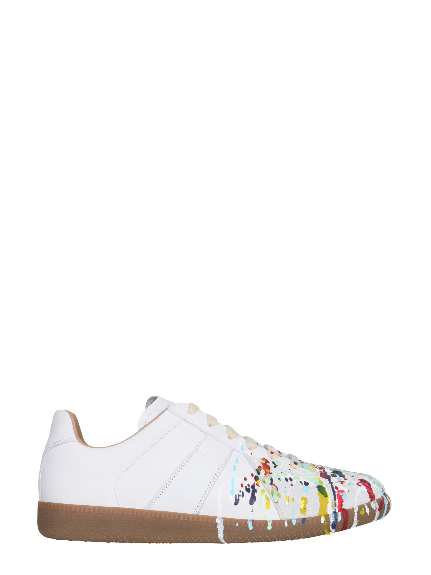 Le sneakers Replica in pelle nubuck e velour con disegno a schizzi di vernice. Le iconiche sneakers Replica della Maison si ispirano alle scarpe sportive austriache degli anni Settanta. I dettagli dei modelli Replica vengono continuamente rielaborati in base alle ispirazioni della stagione.