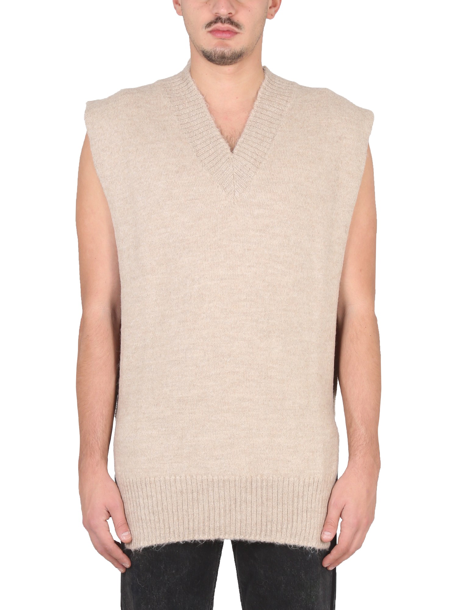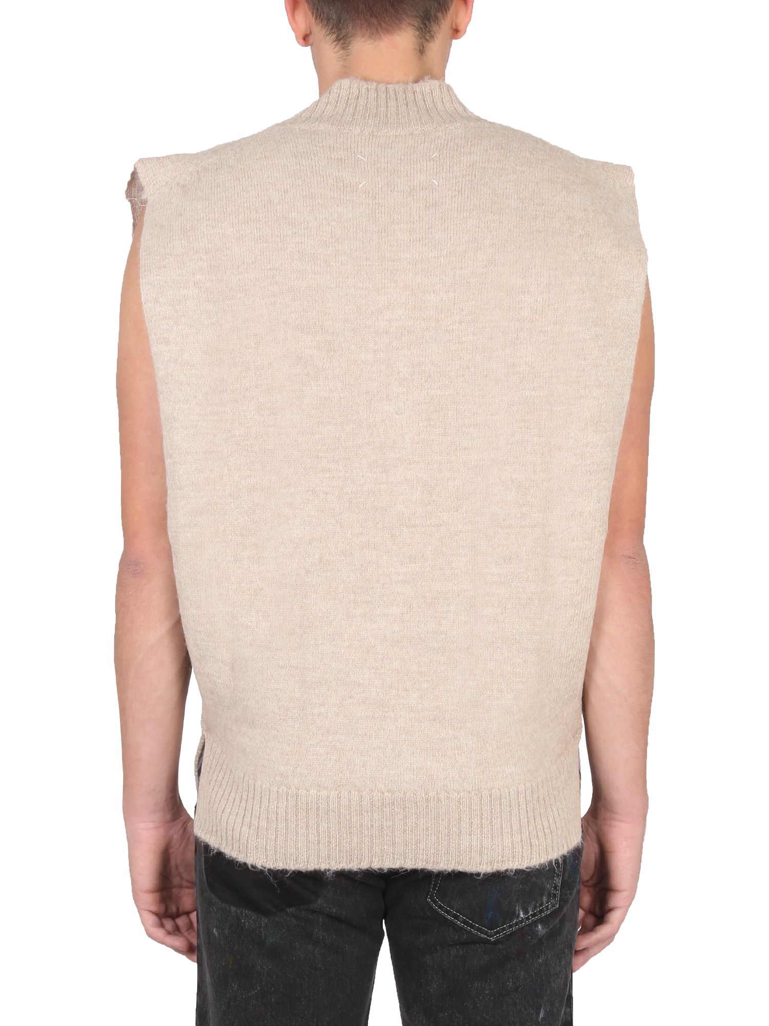 Con la sua sensazione di leggerezza e ariosità e la sua struttura resistente, il tabard in lana d'alpaca della Maison Margiela è un'aggiunta versatile a qualsiasi guardaroba. Ha uno scollo a V e uno stile senza maniche con bordi a coste. Il tessuto è morbido e caldo e sta bene indossato da solo o sovrapposto ad altri top e maglioni.